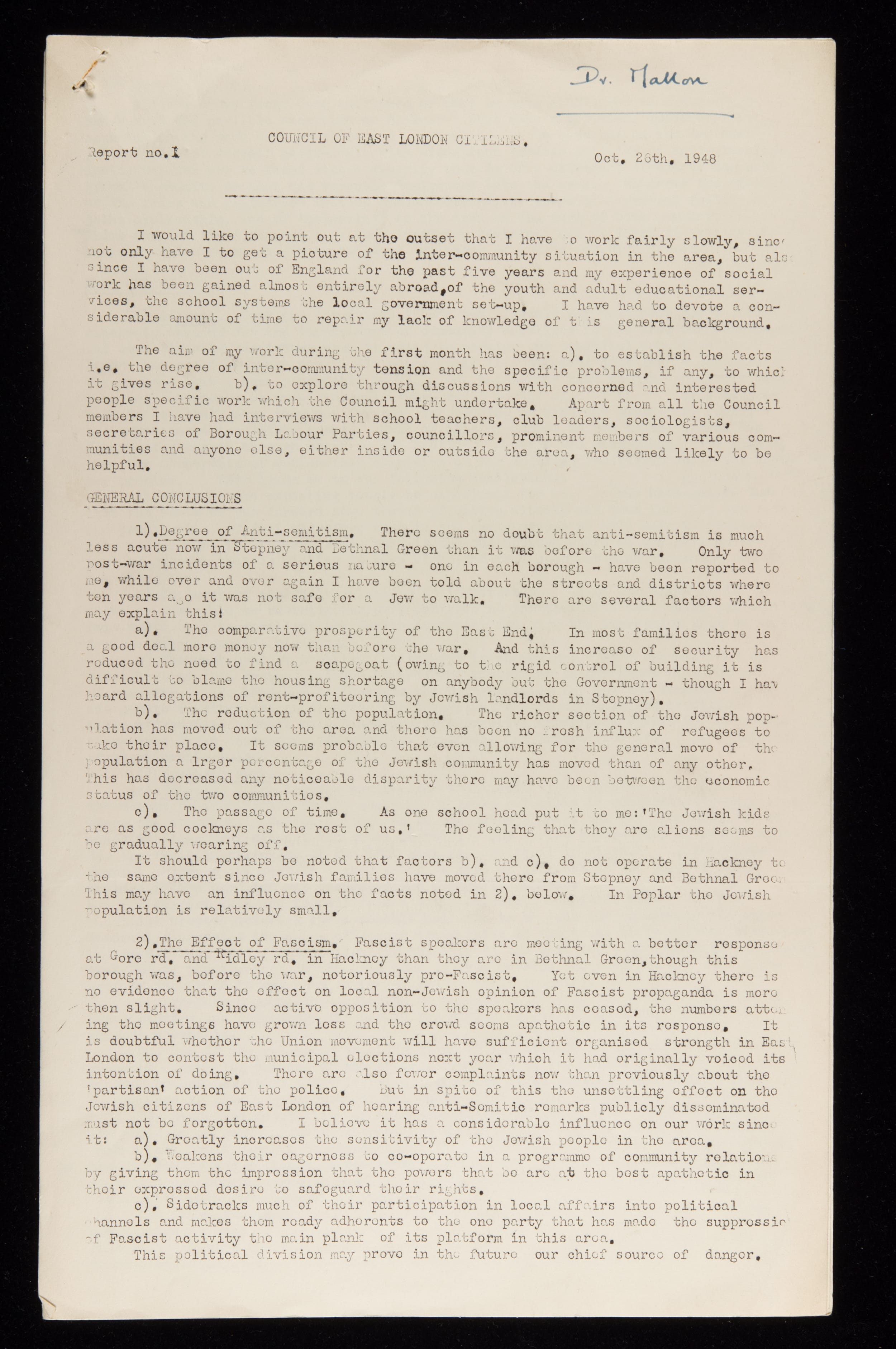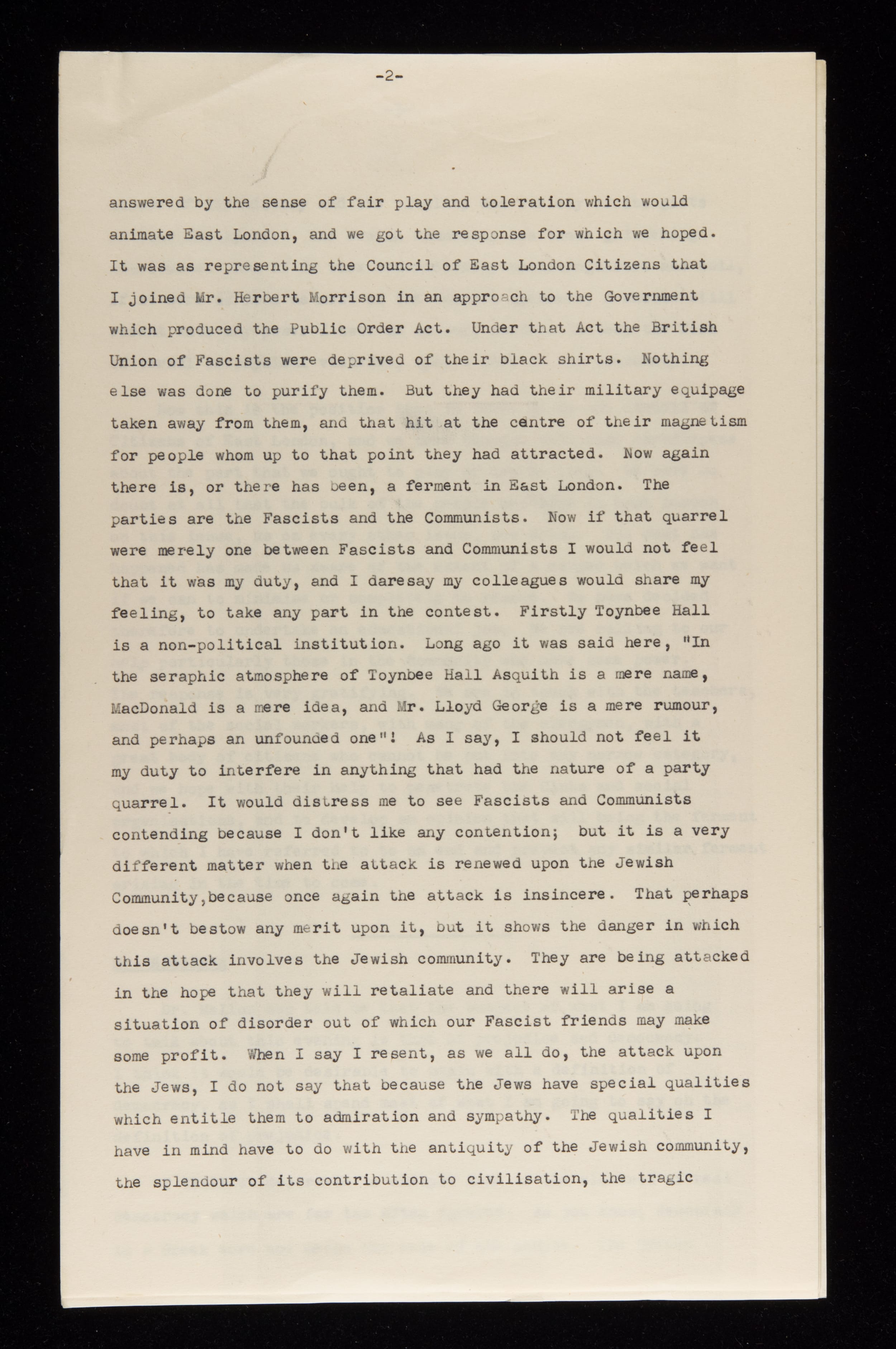 Correspondence Contains proposed future policy, correspondence, agendas, a copy of a speech by Harold Nicholson, copies from an observer of Mosley’s rally in Dalston. Includes minutes of meetings. 1 file