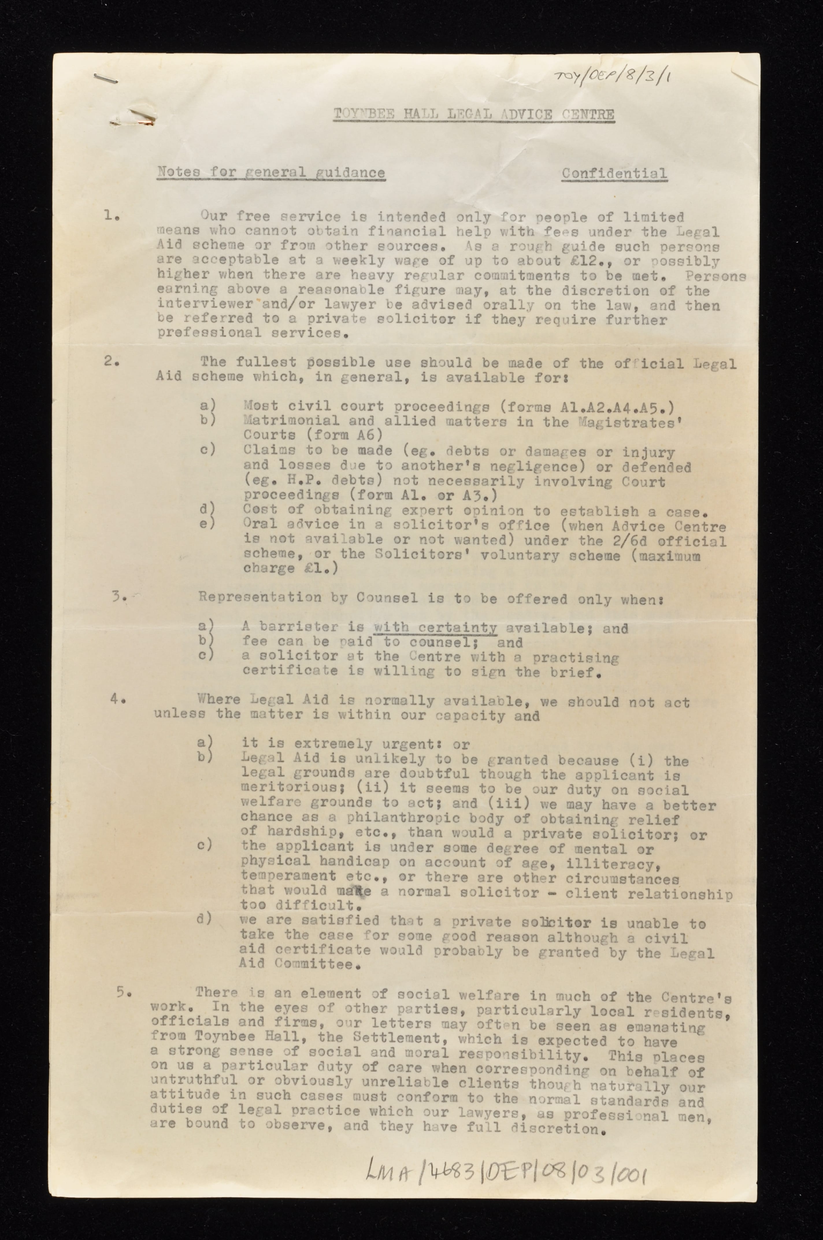Contains information on the scope of legal advice delivered at Toynbee Hall. 1 document