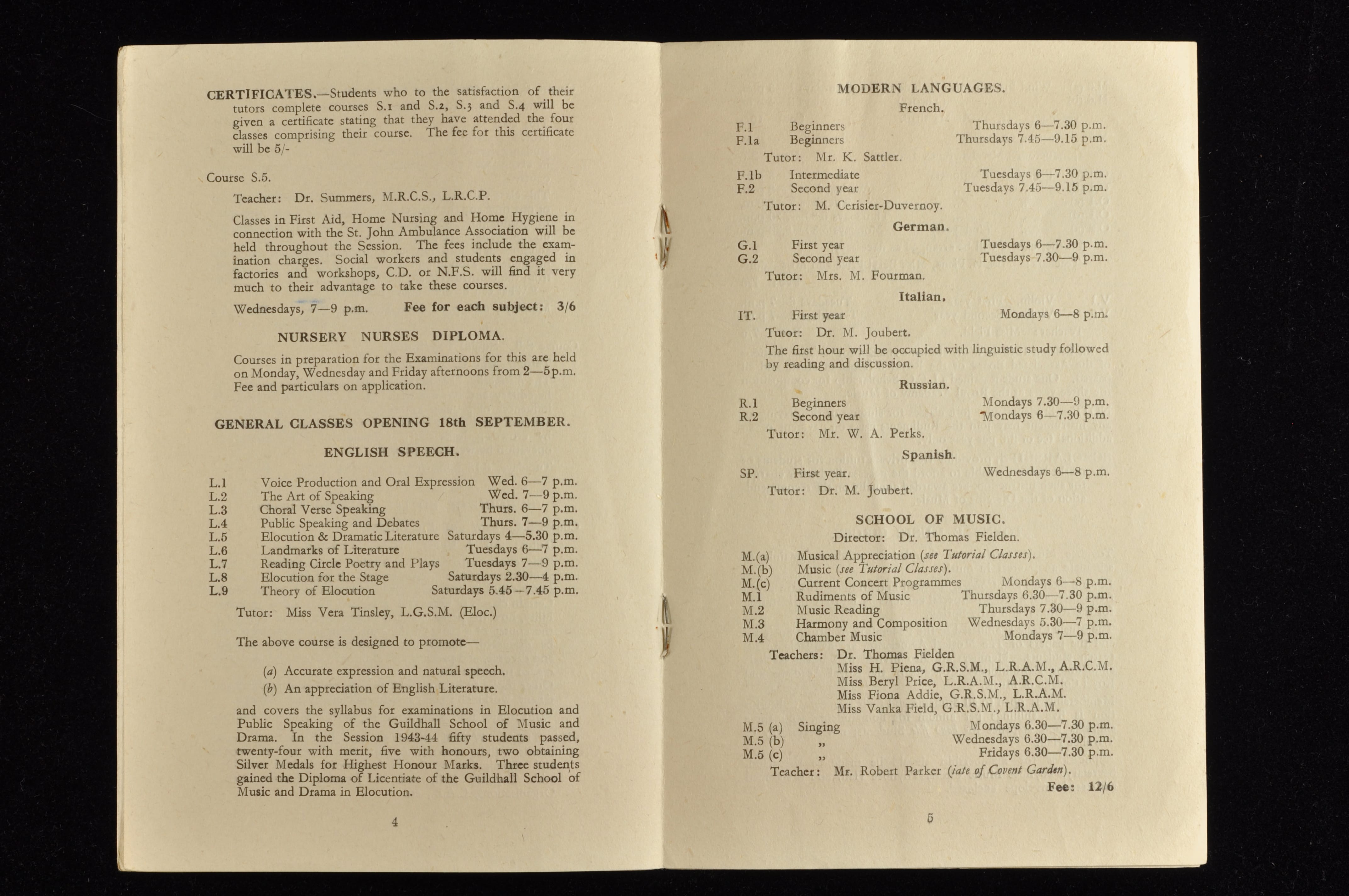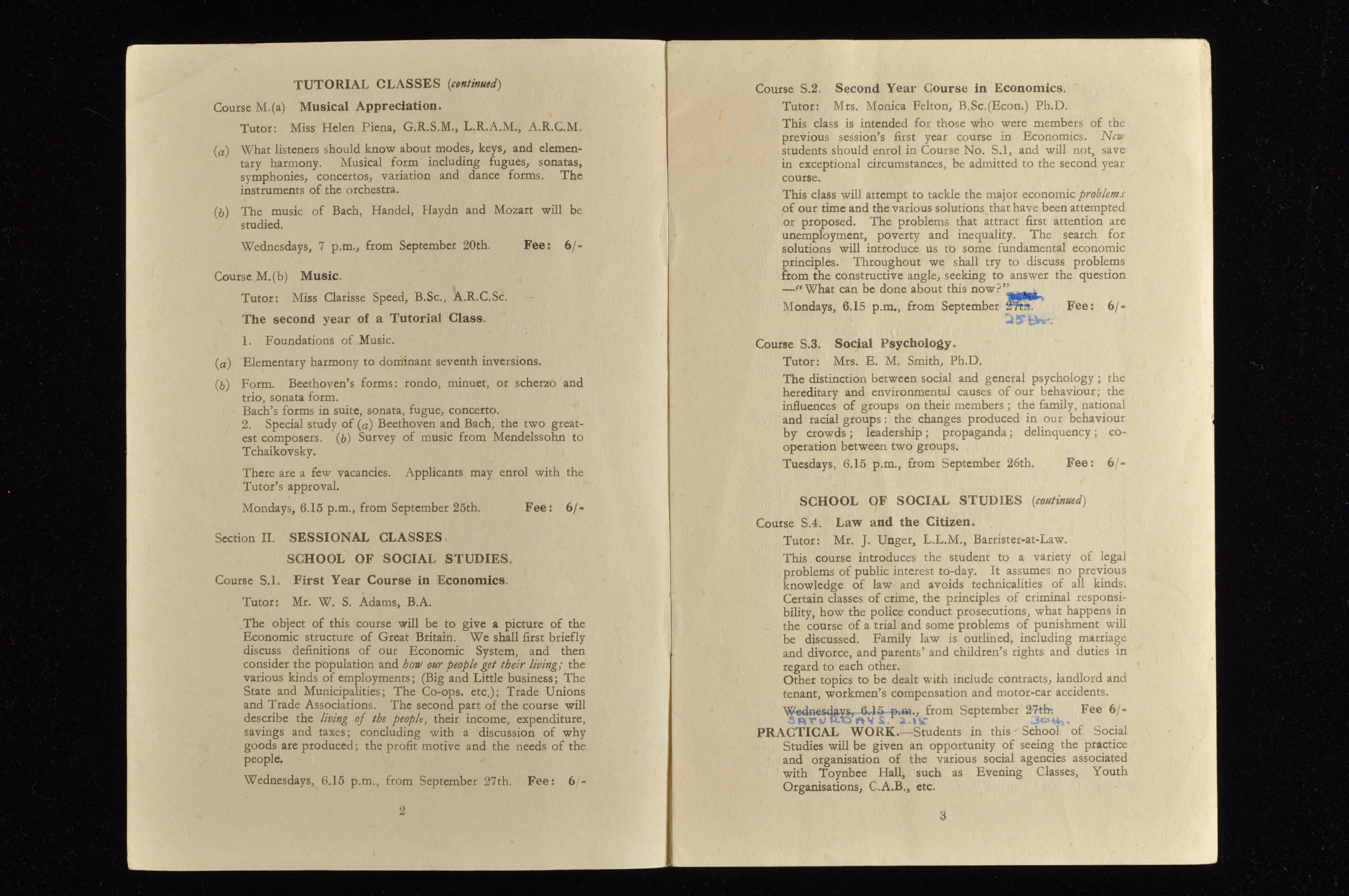 Contains lists of classes and facilitiies at Toynbee Hall. 1 document