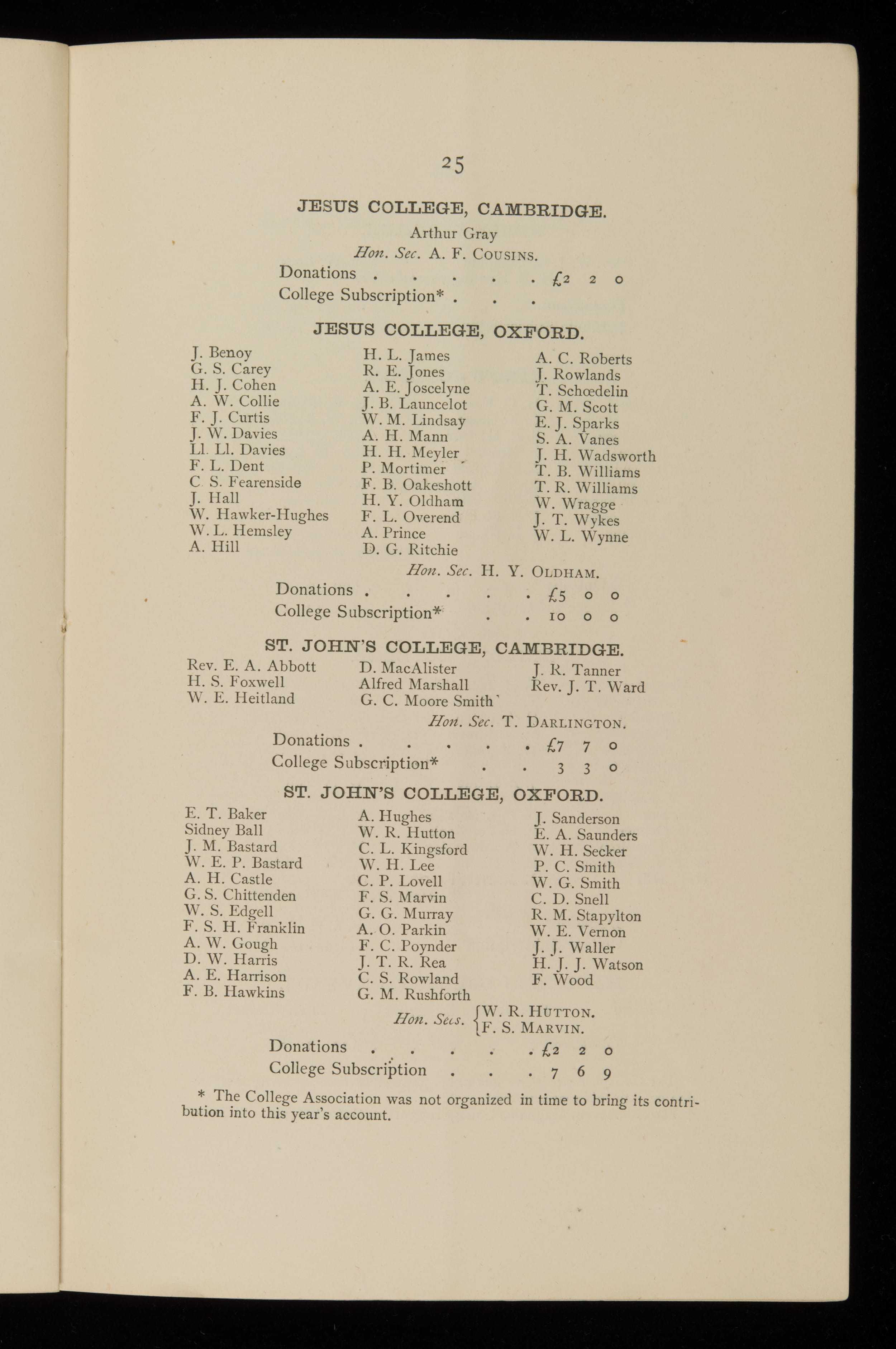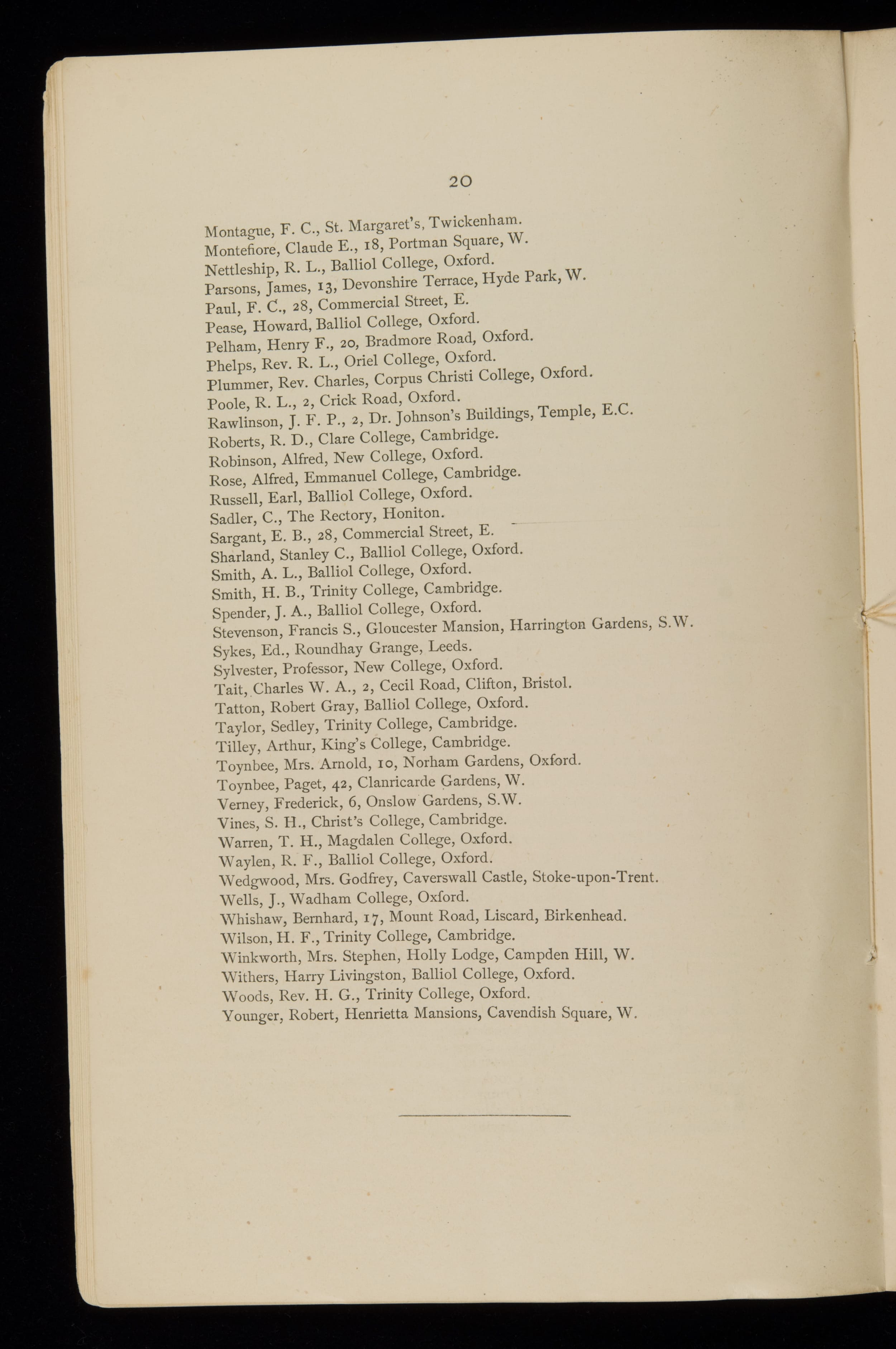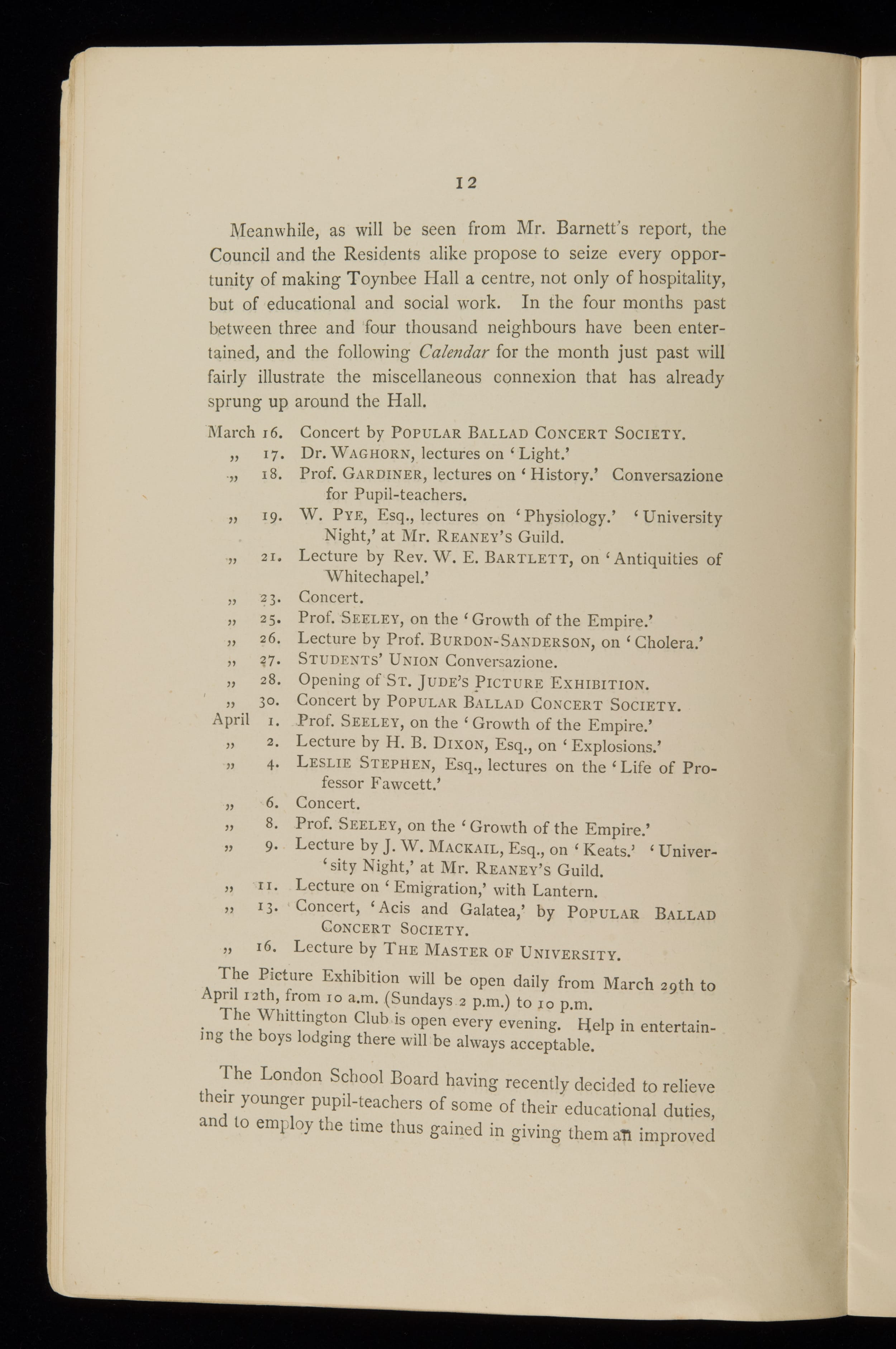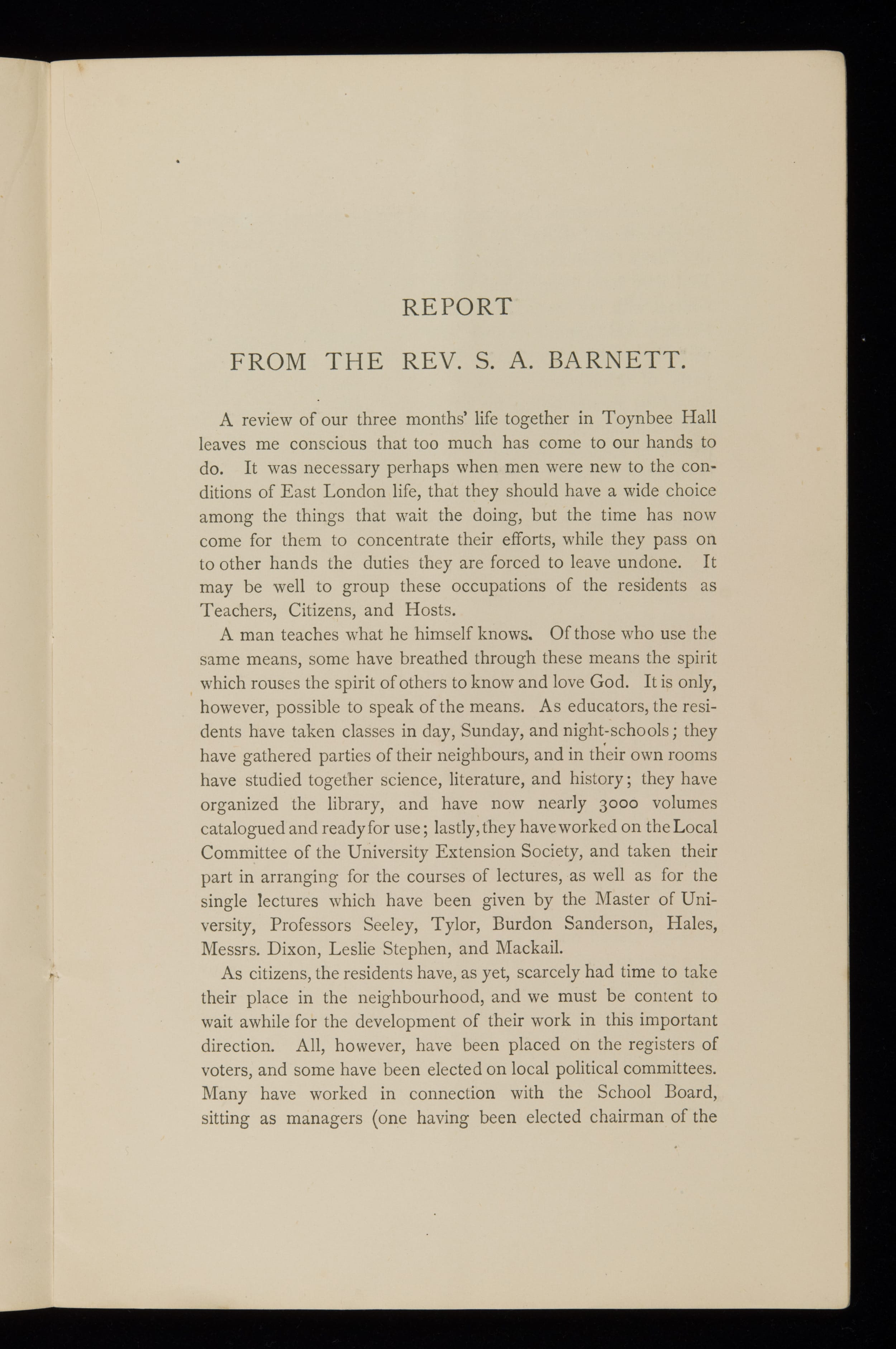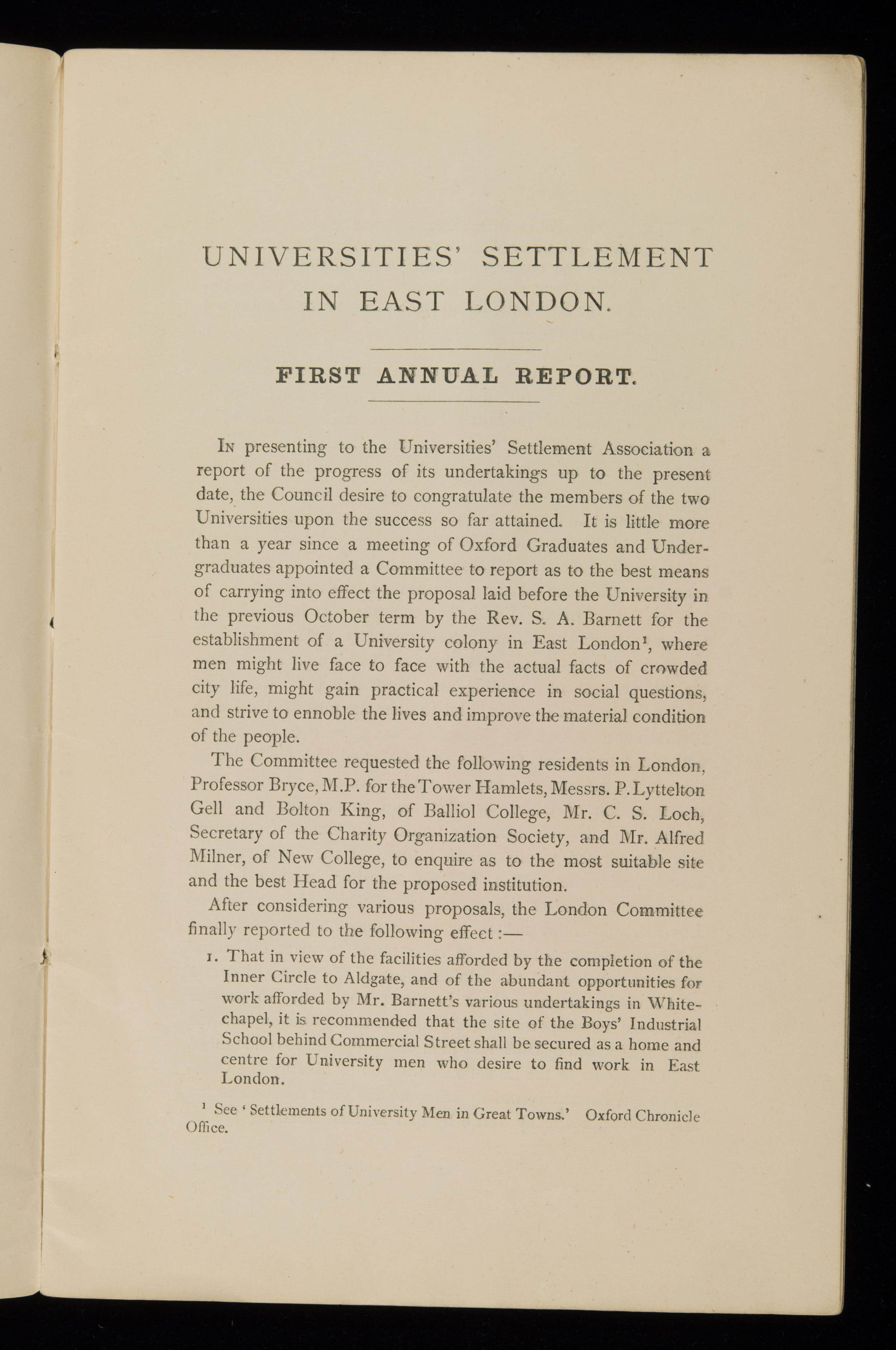 Includes a report by Samuel Barnett describing the initial meeting at Oxford establishing the Universities Settlement Association and the subsequent descion to appoint him as the first Warden. 1 volume
