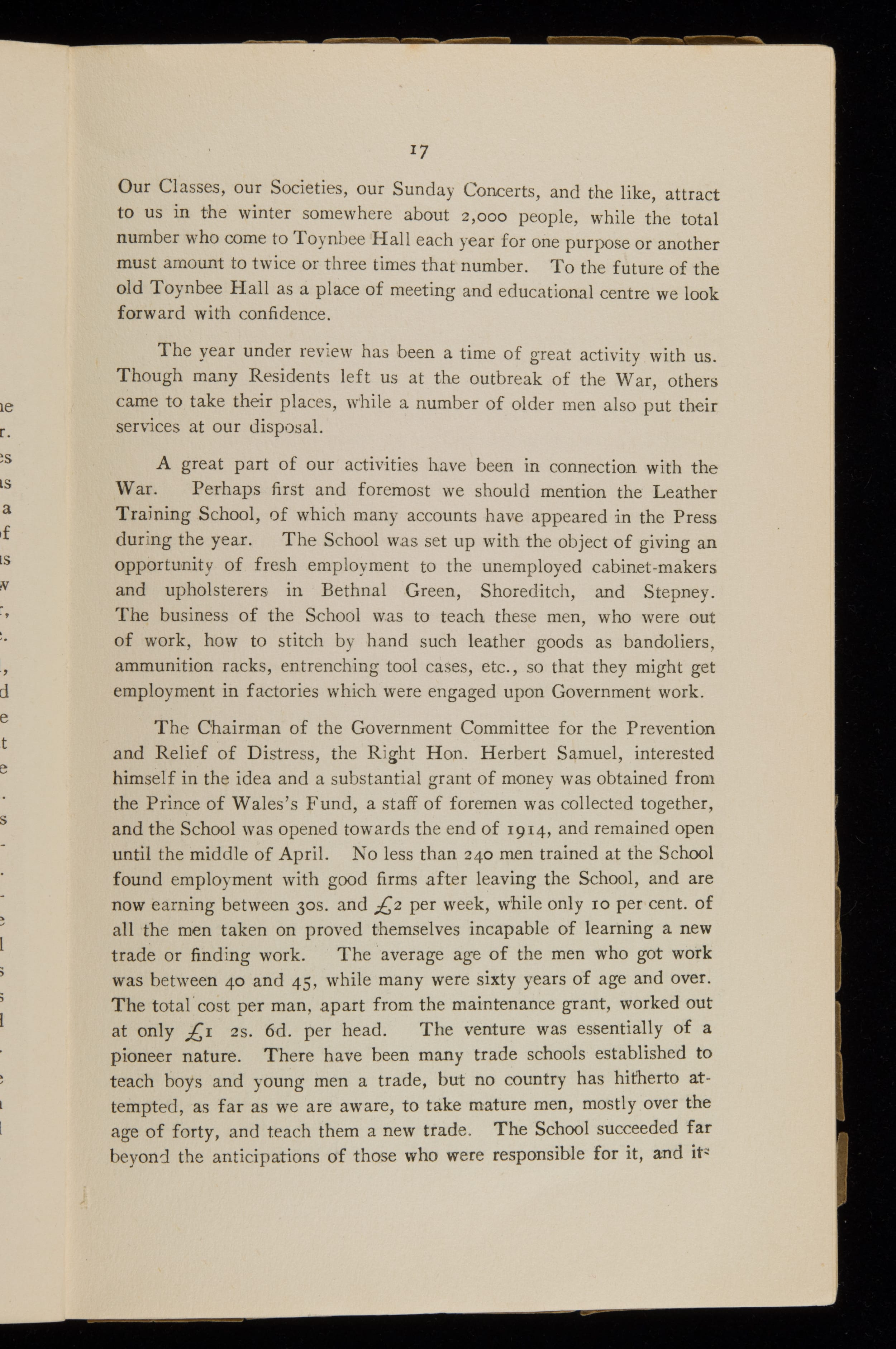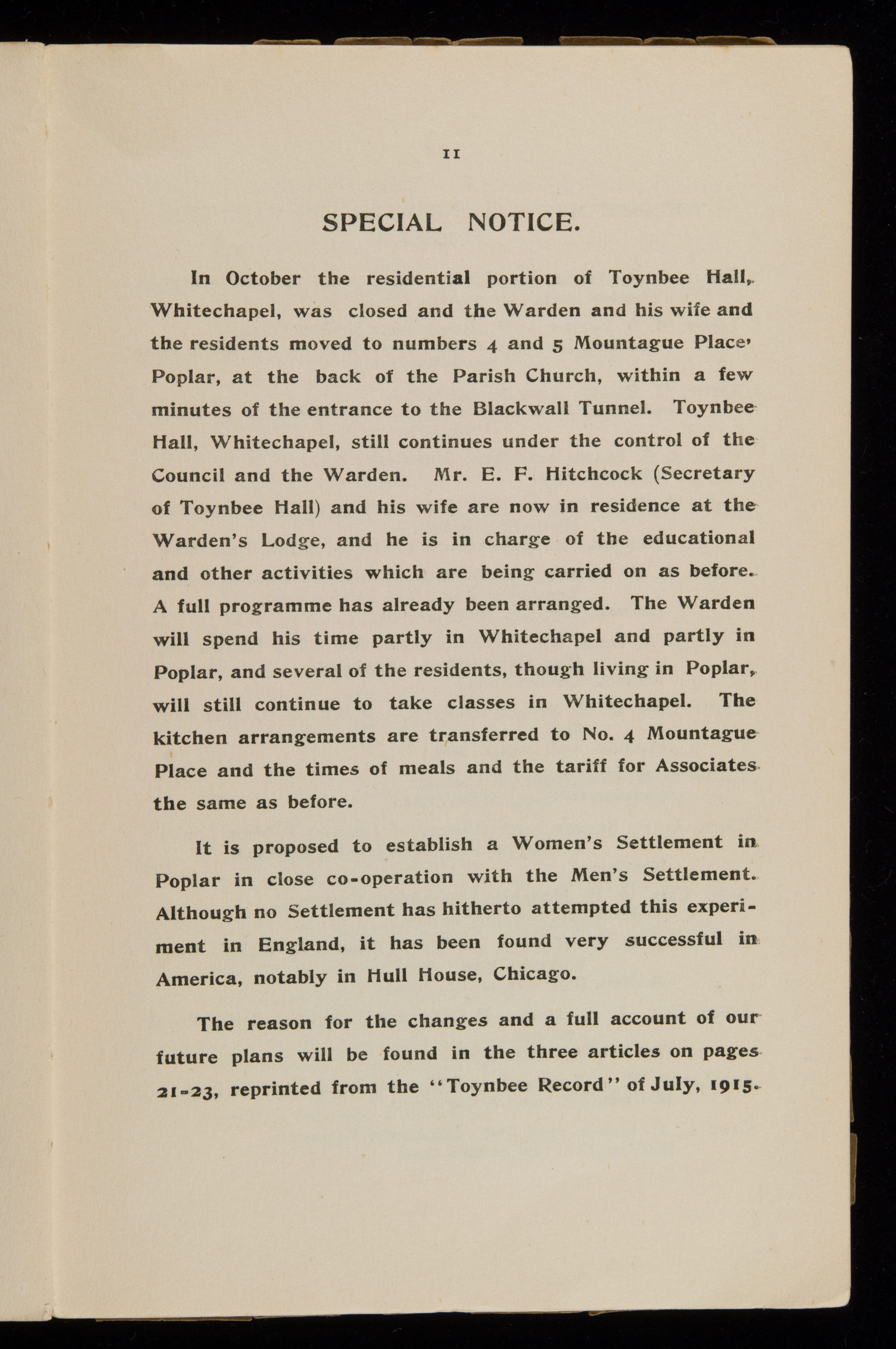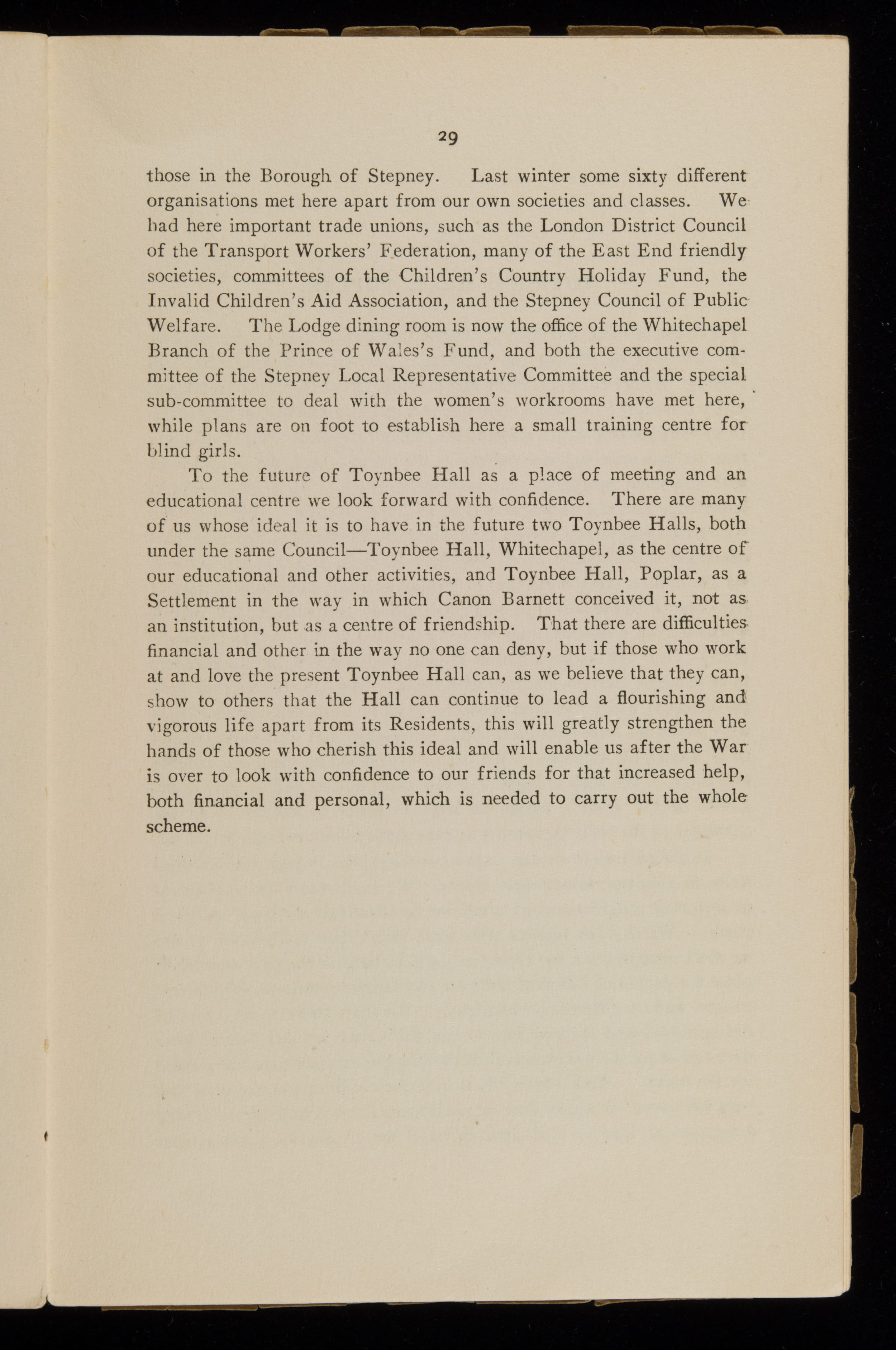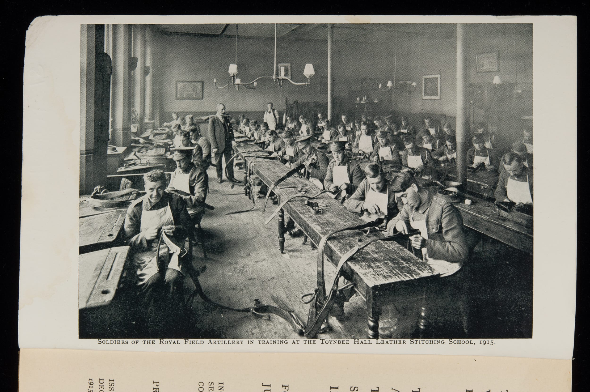 Contains the photograph of the Royal Field Artillary Stitching School at Toynbee Hall. The Hall was taken over for the War effort. Includes the move to Poplar, 4-5 Montague Place, and the setting up of a womens settlement at Bow Lane. 1 volume