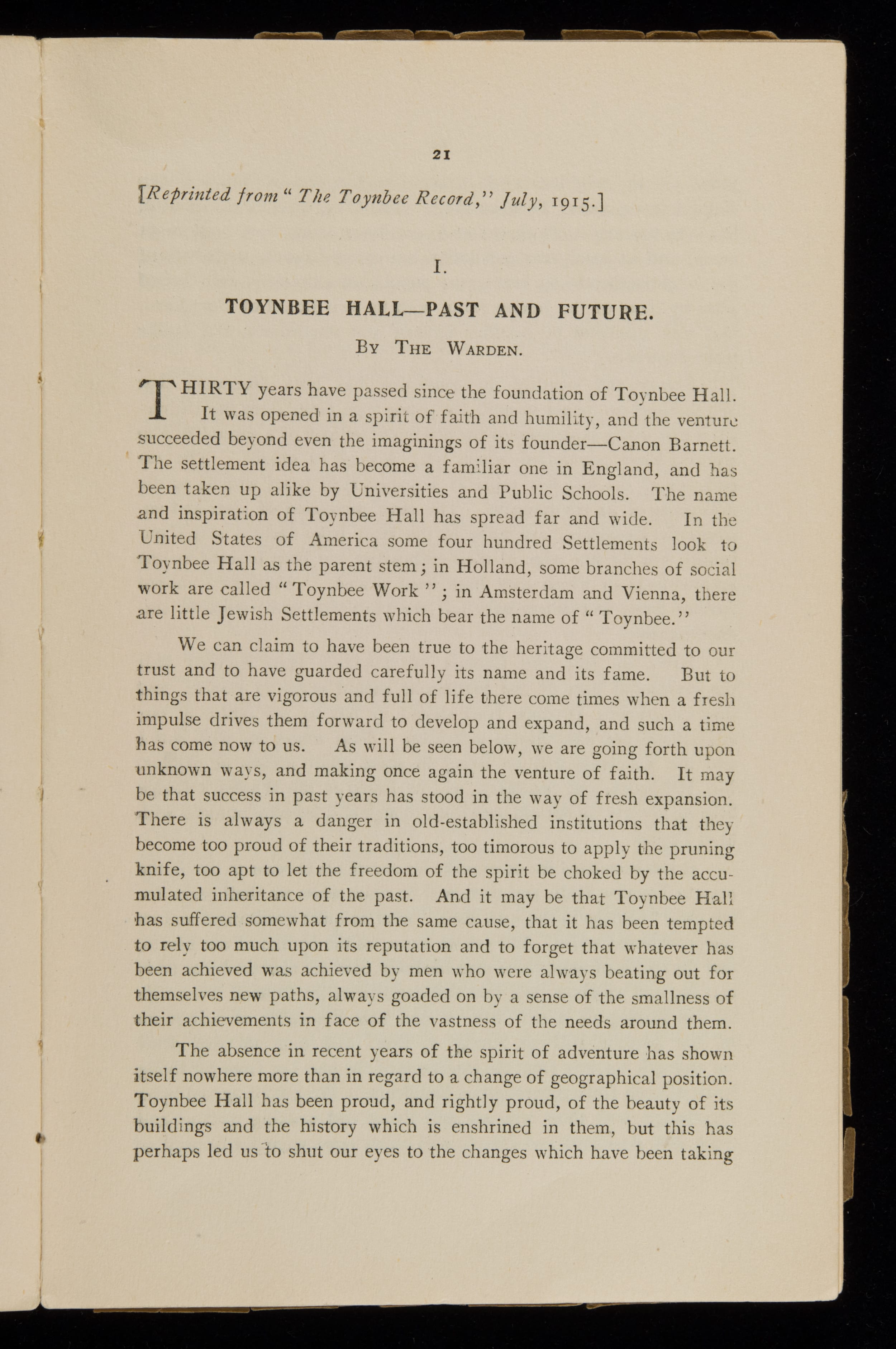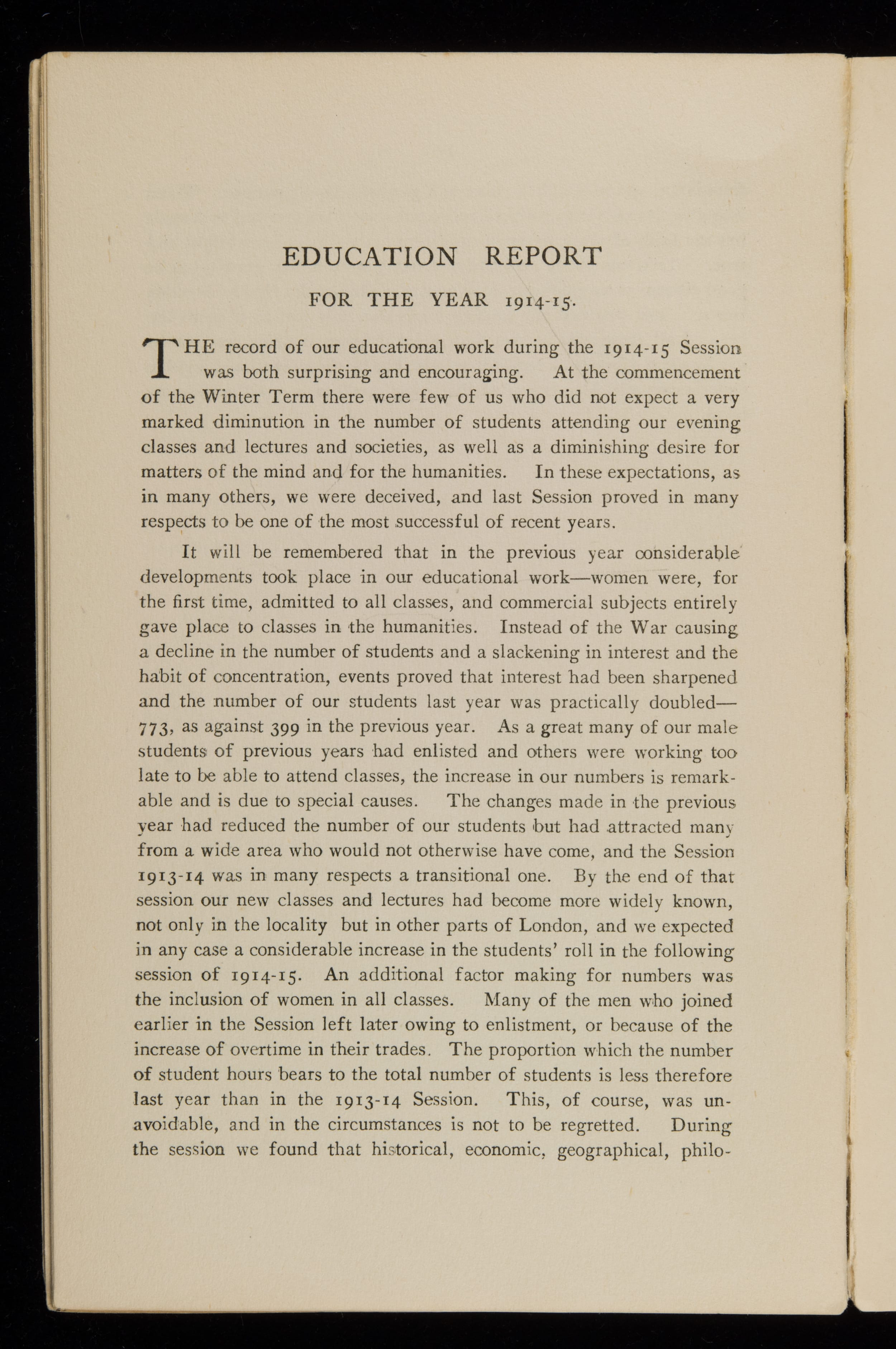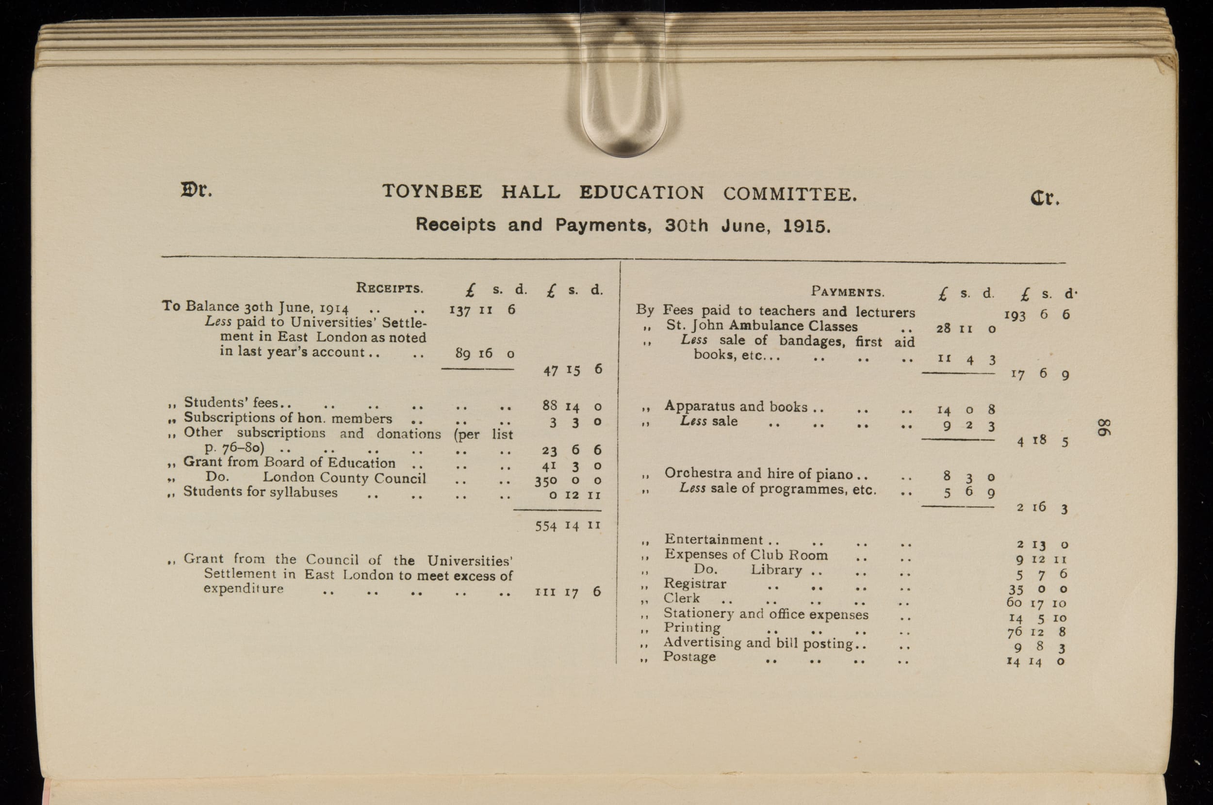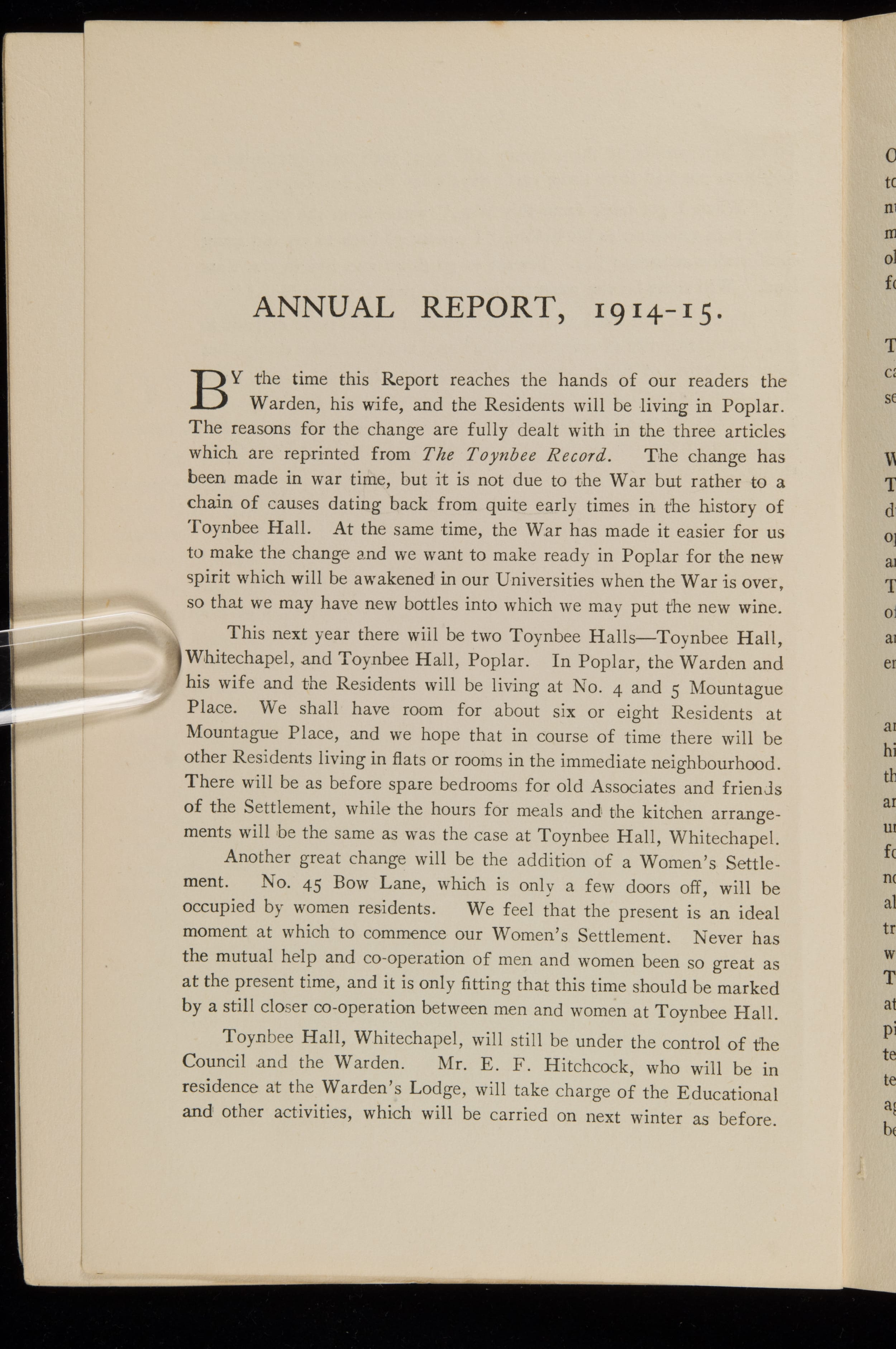 Contains the photograph of the Royal Field Artillary Stitching School at Toynbee Hall. The Hall was taken over for the War effort. Includes the move to Poplar, 4-5 Montague Place, and the setting up of a womens settlement at Bow Lane. 1 volume