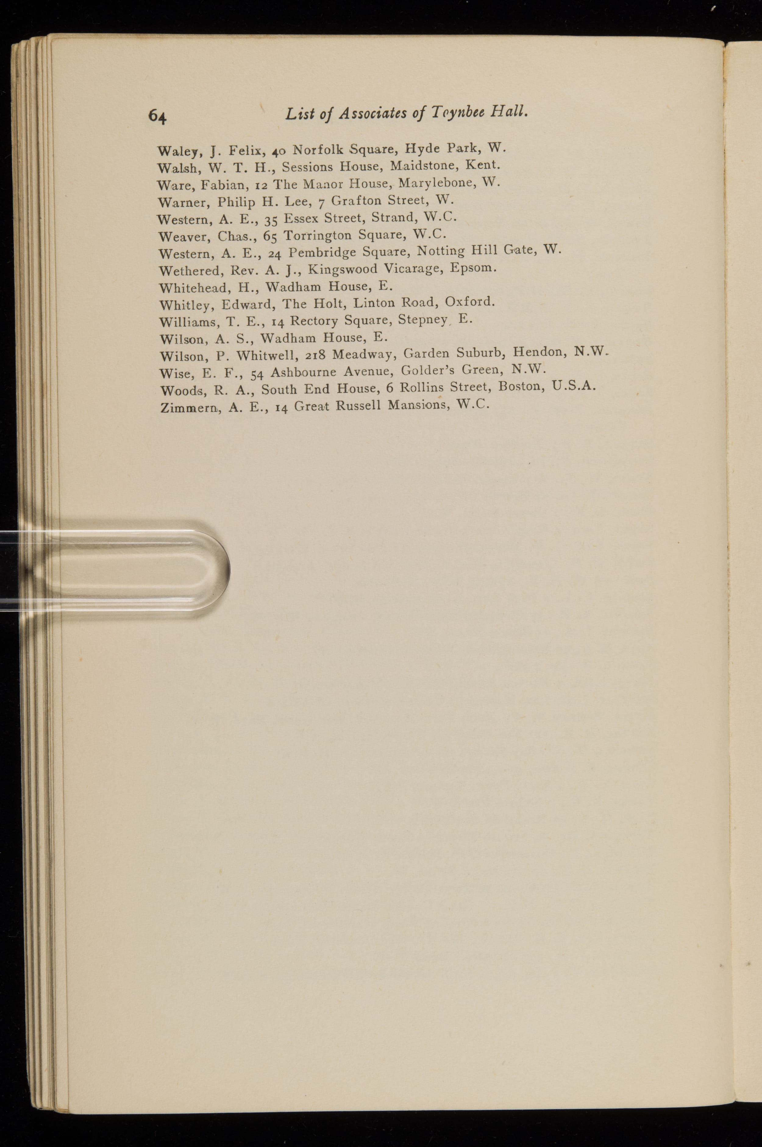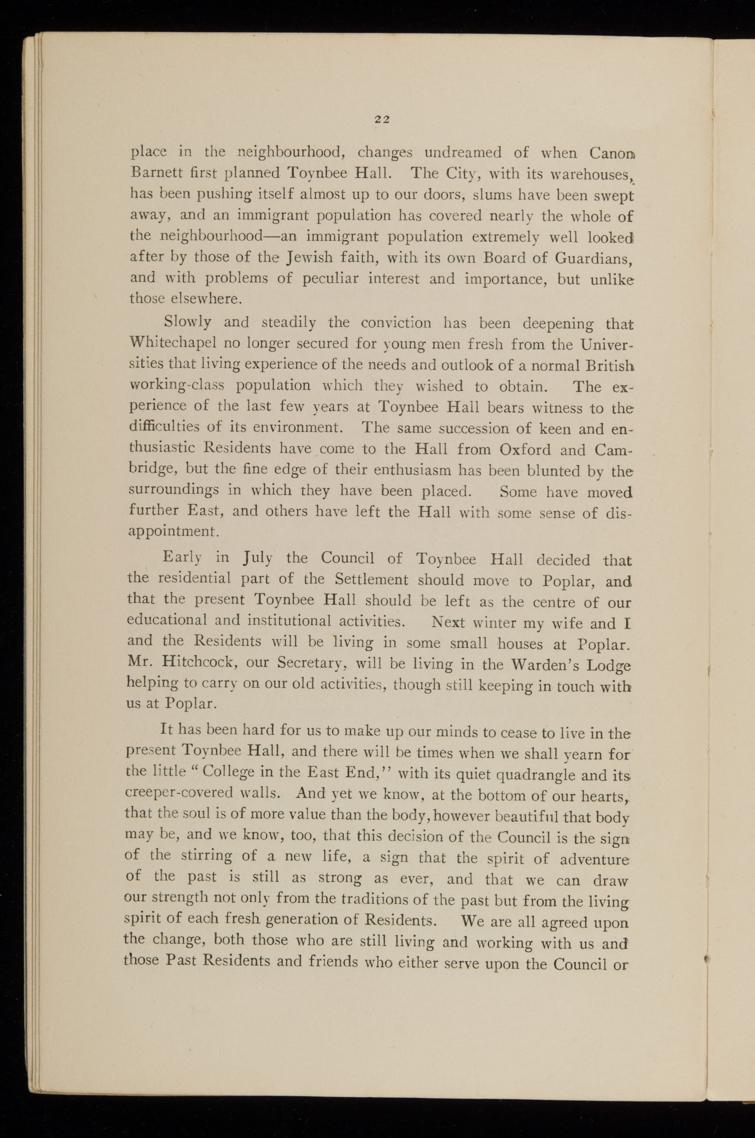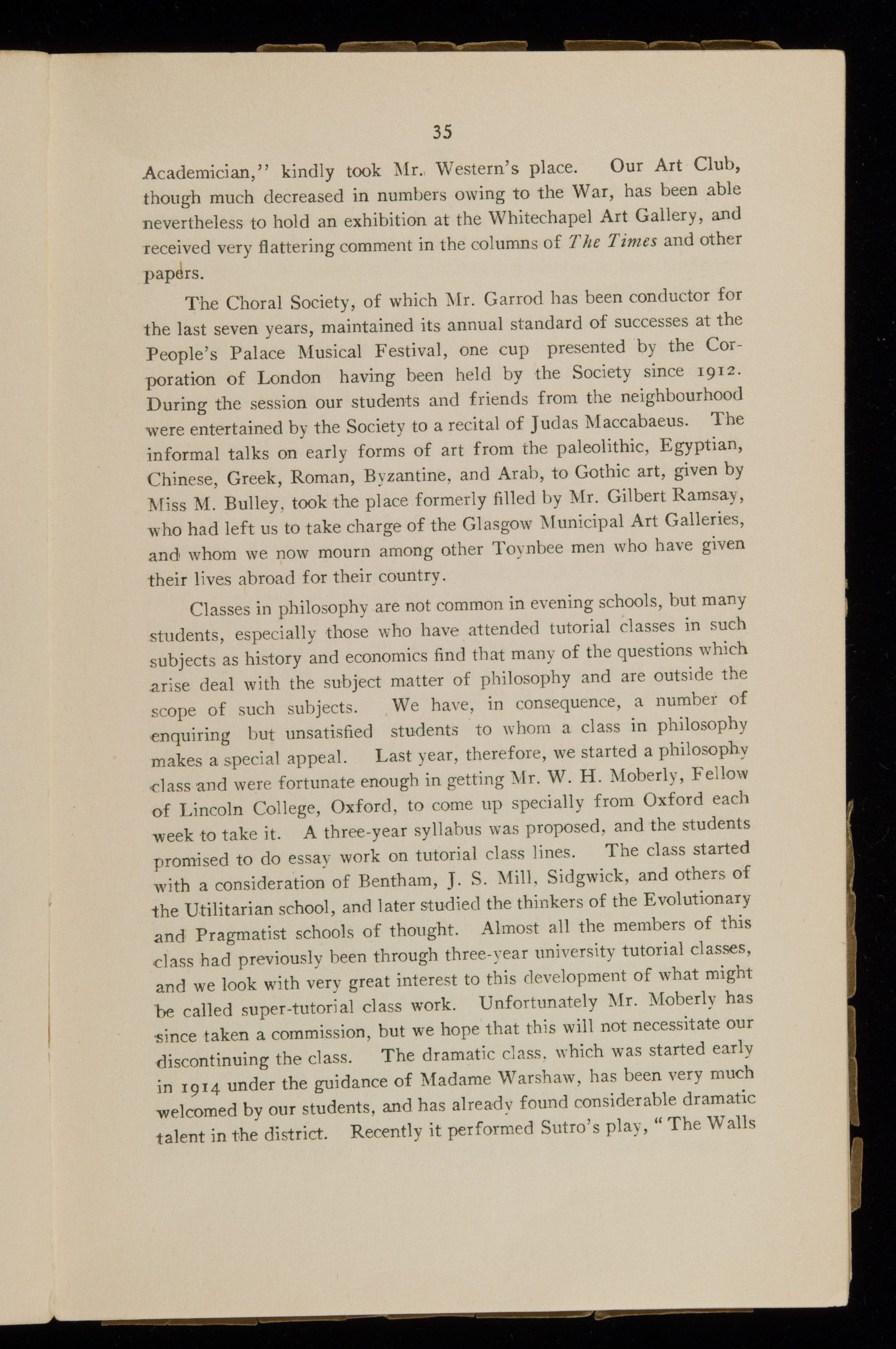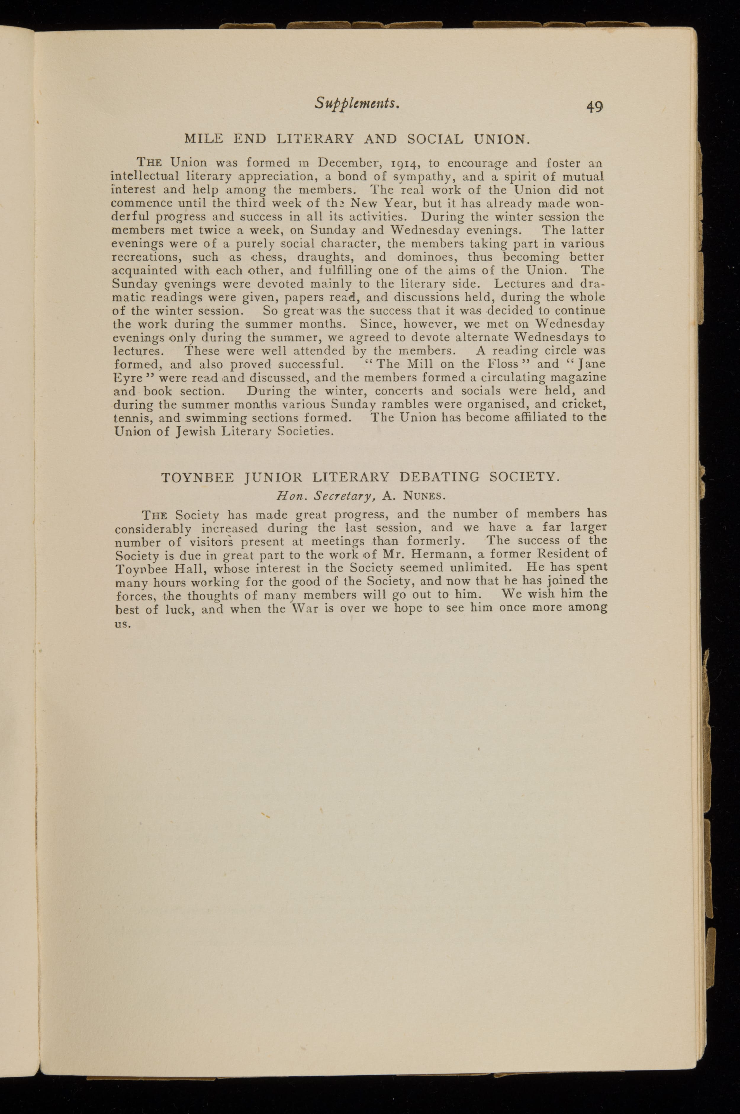 Contains the photograph of the Royal Field Artillary Stitching School at Toynbee Hall. The Hall was taken over for the War effort. Includes the move to Poplar, 4-5 Montague Place, and the setting up of a womens settlement at Bow Lane. 1 volume