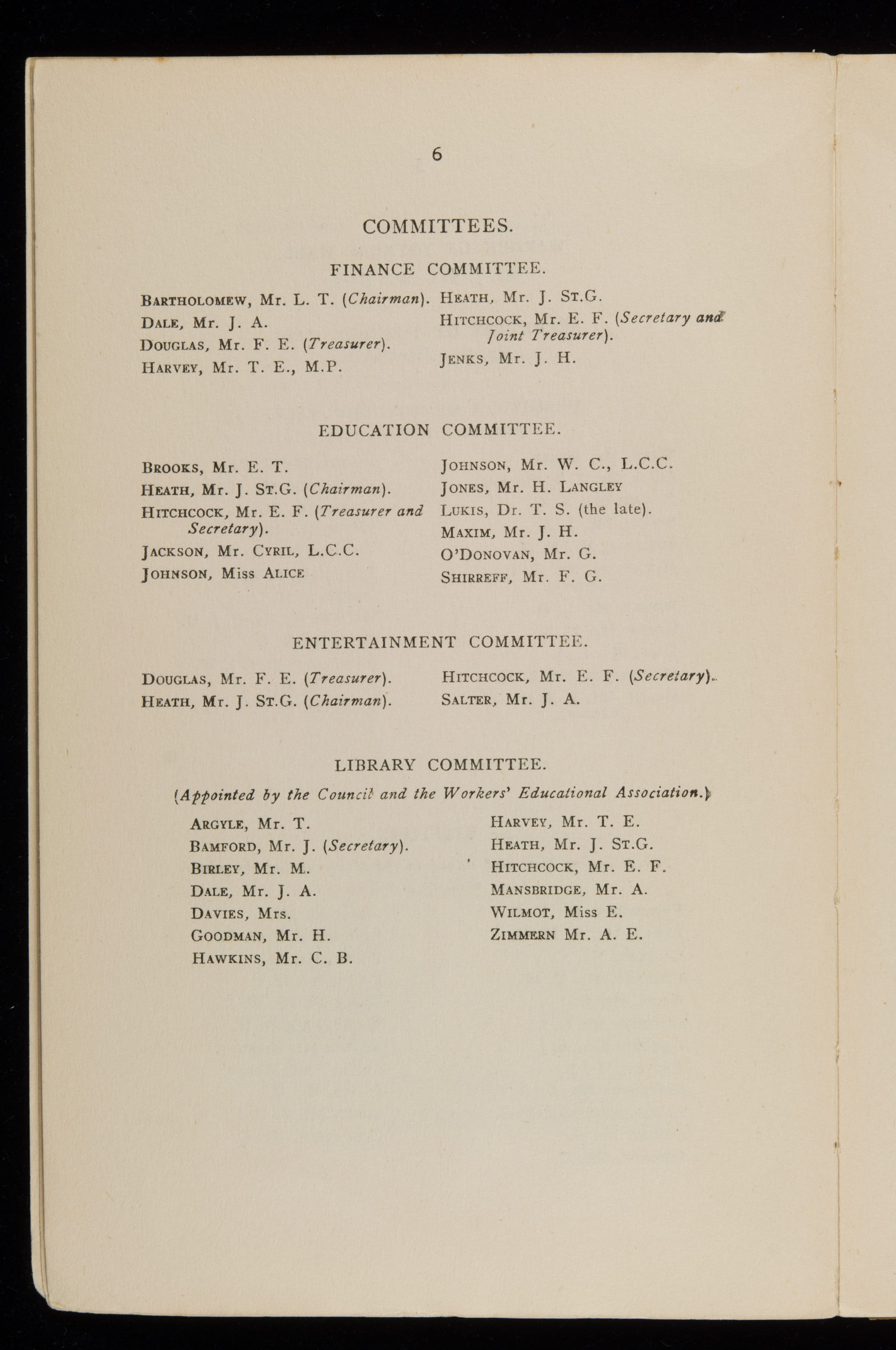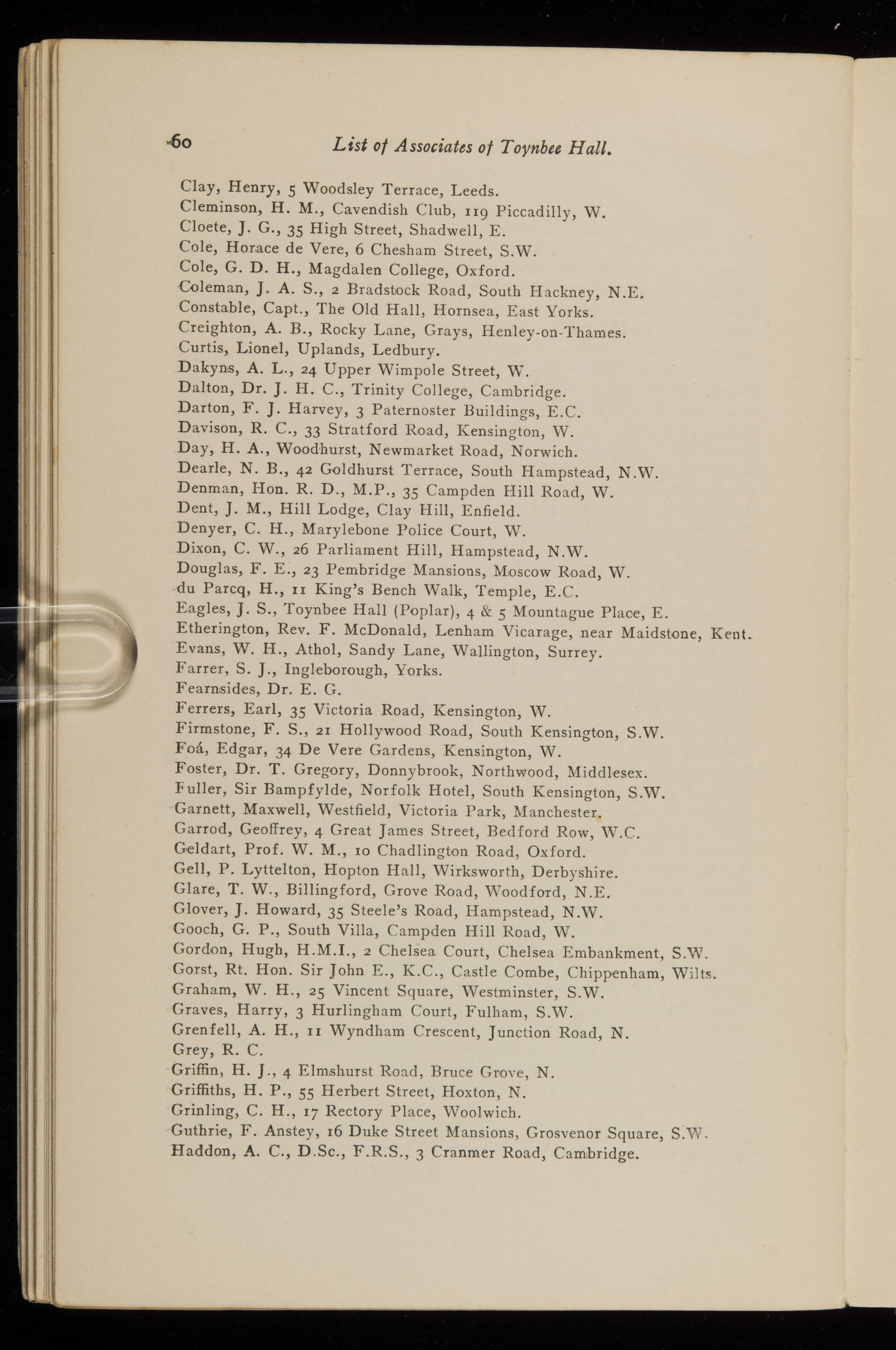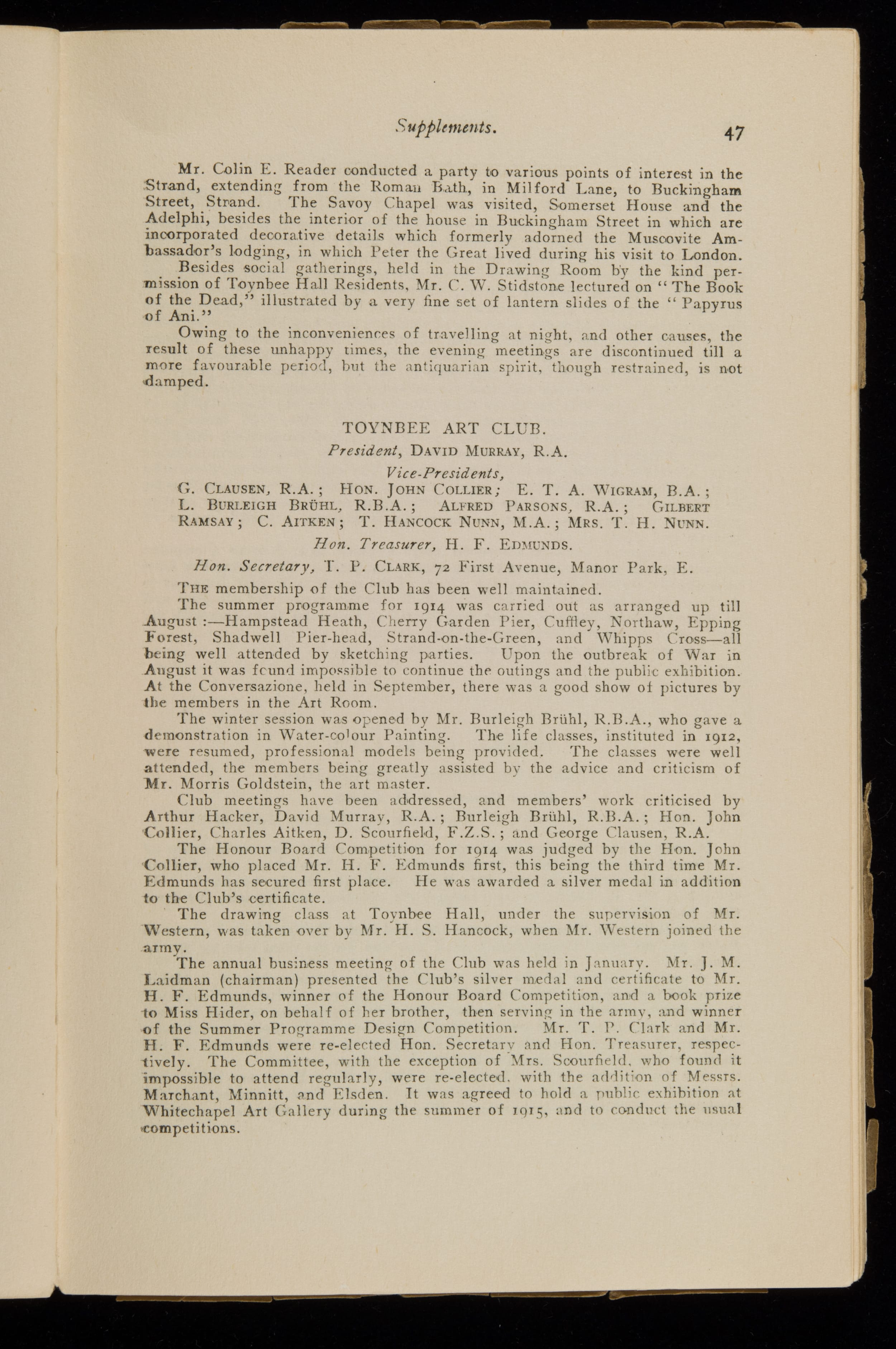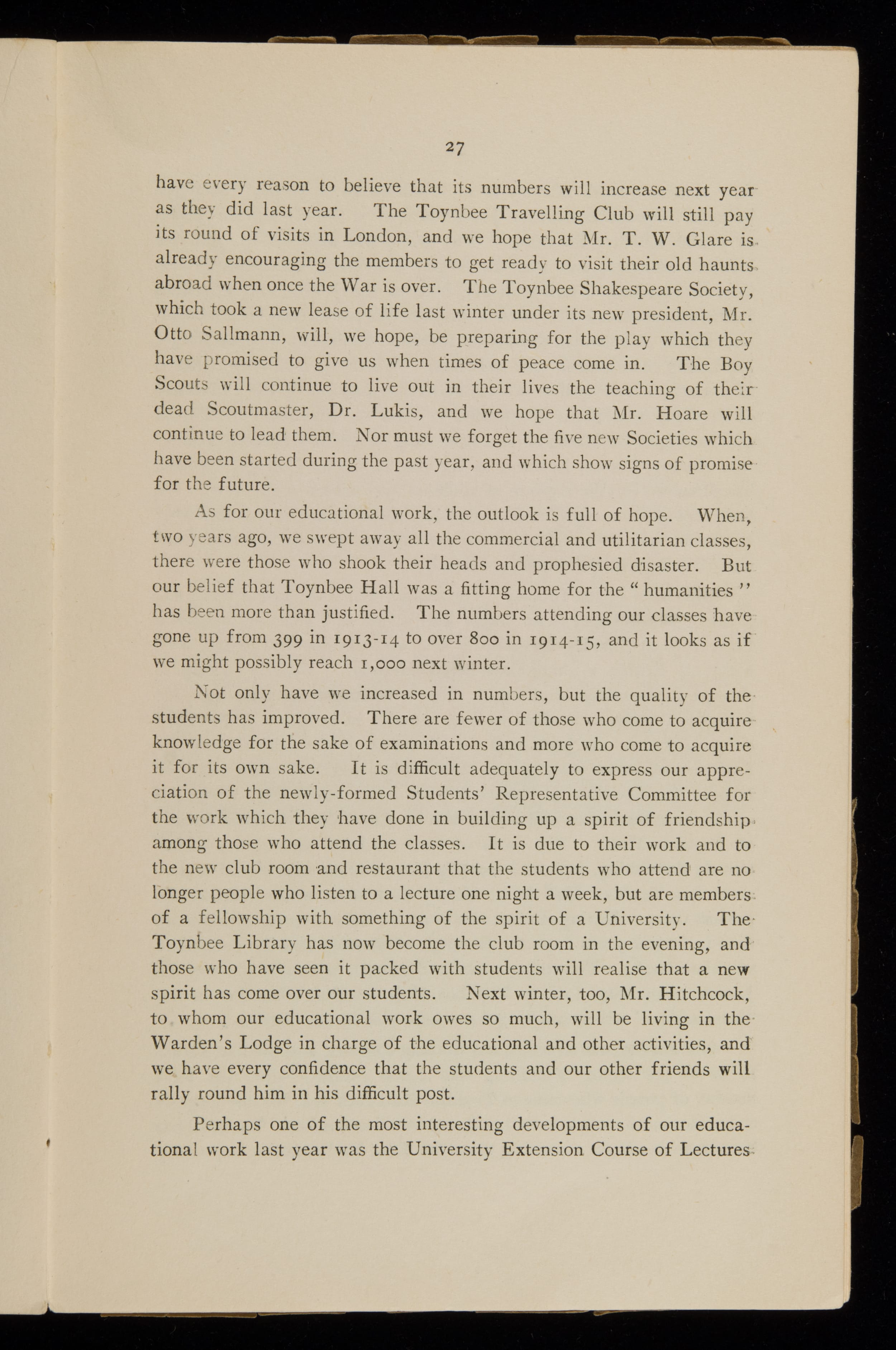 Contains the photograph of the Royal Field Artillary Stitching School at Toynbee Hall. The Hall was taken over for the War effort. Includes the move to Poplar, 4-5 Montague Place, and the setting up of a womens settlement at Bow Lane. 1 volume