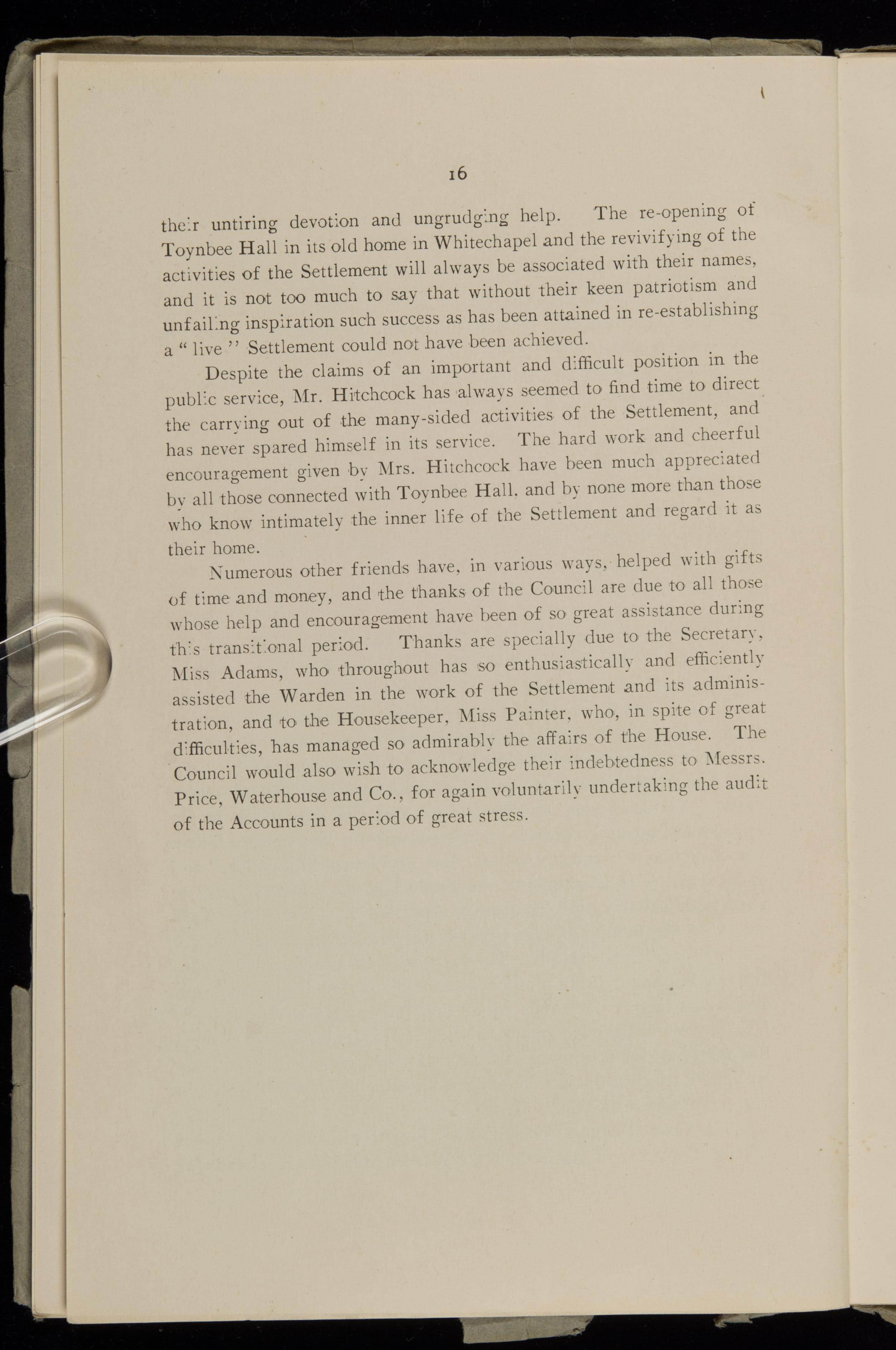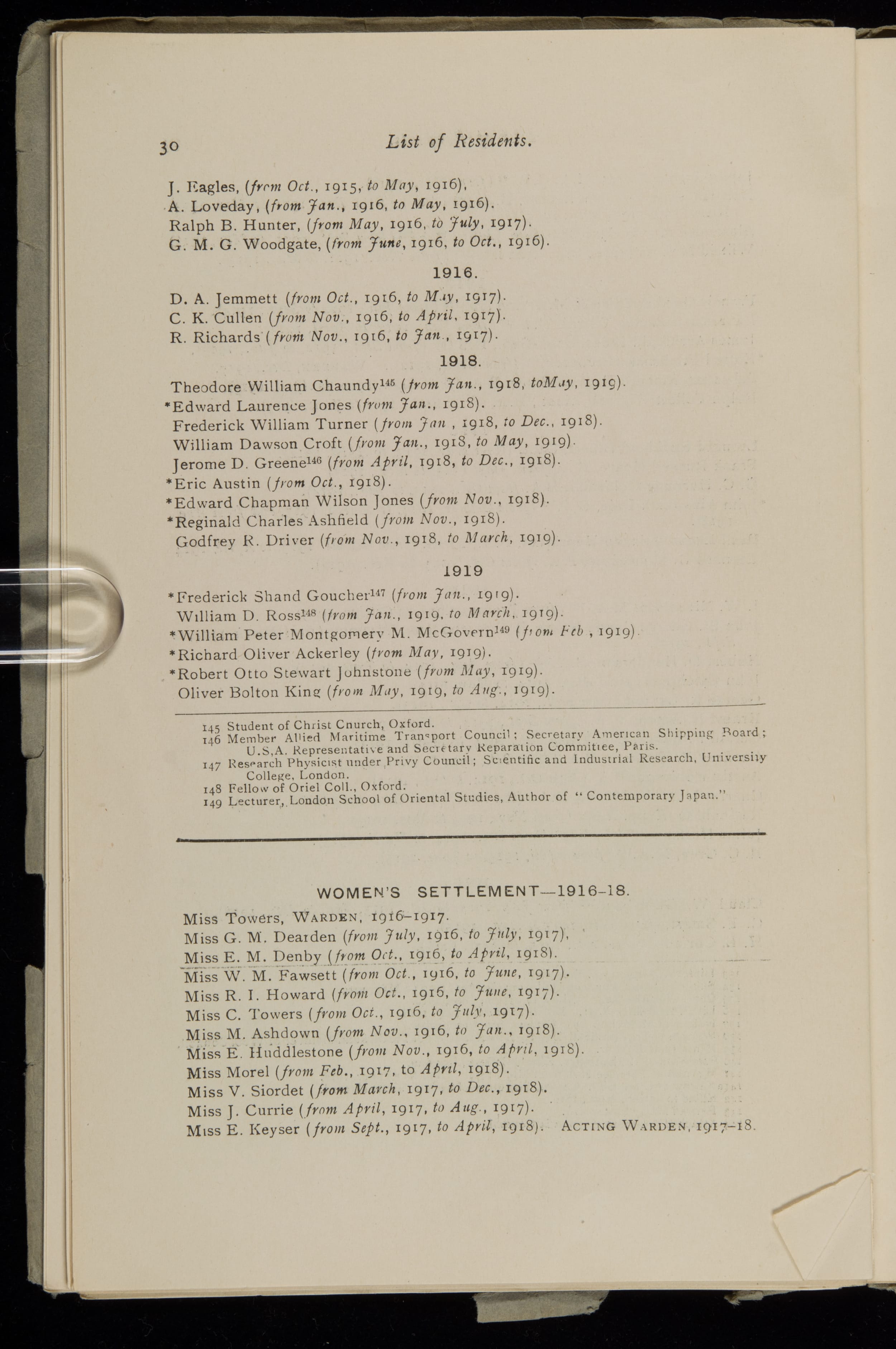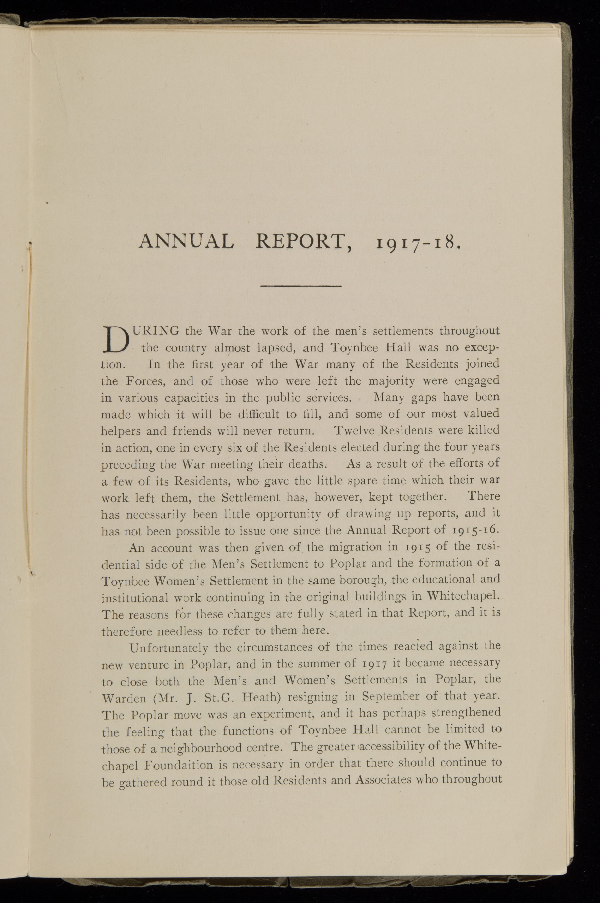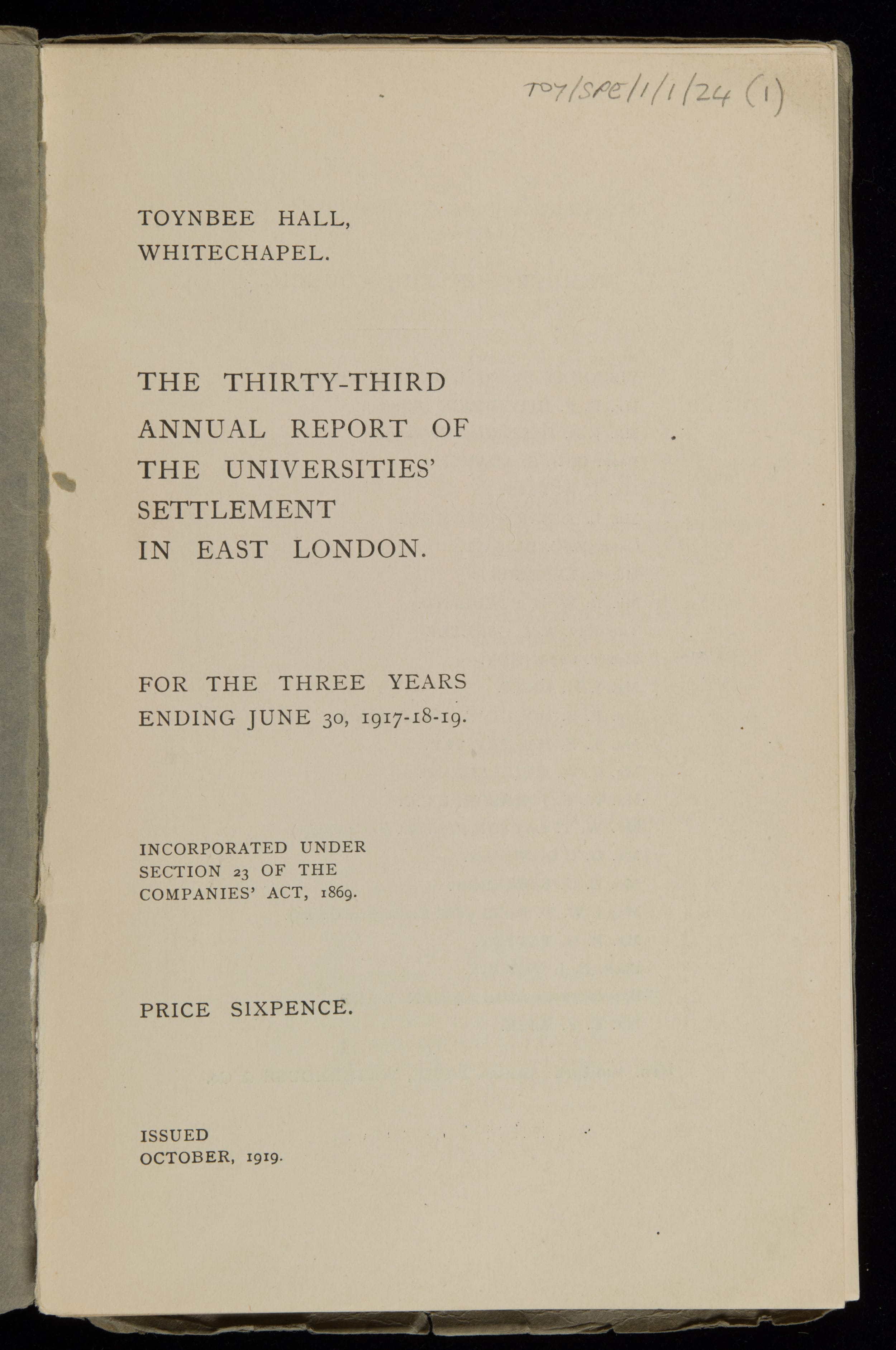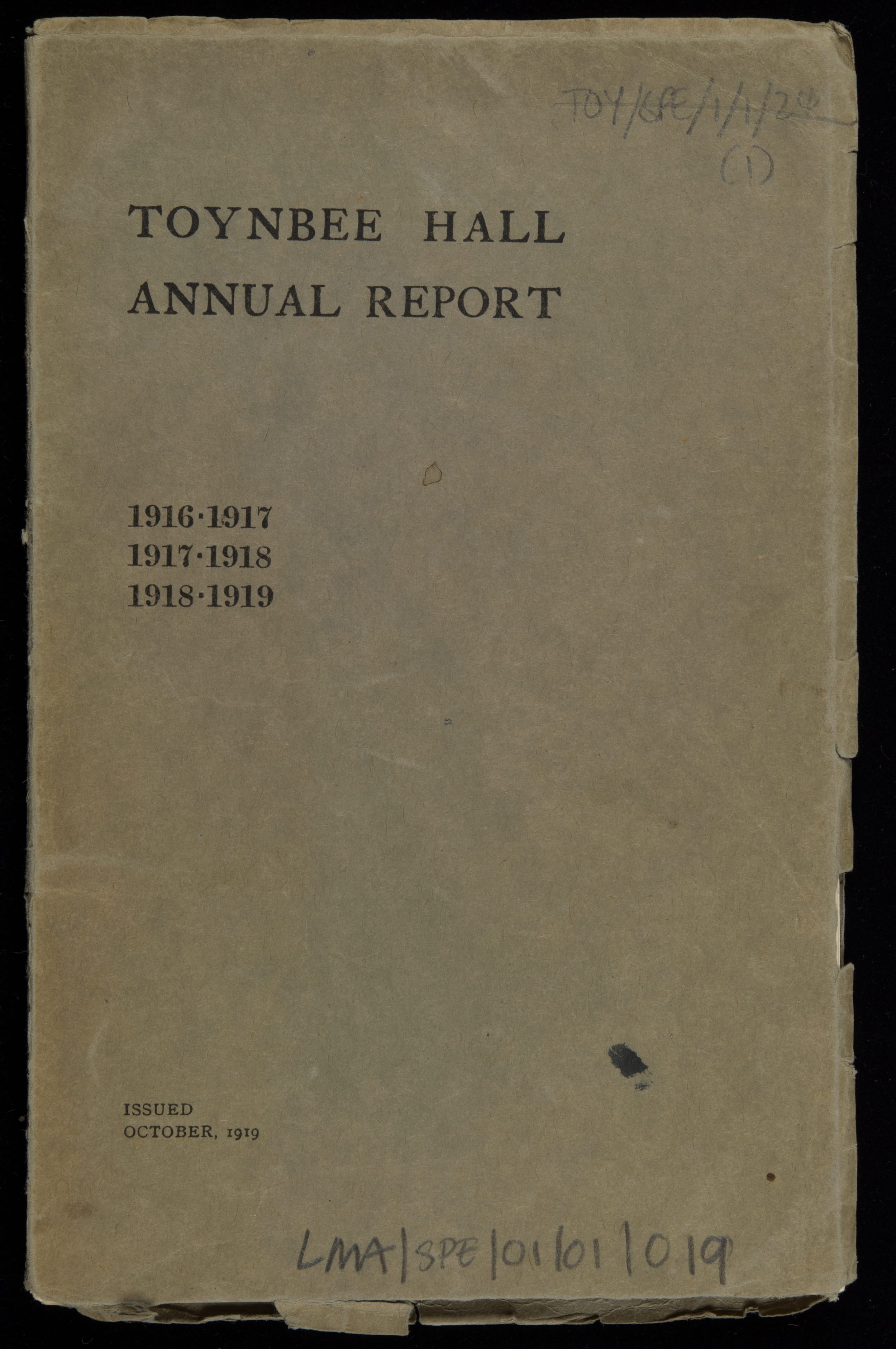 Annual Reports 1916- 1919 Contains a war report and lists members, residents and residents of the womens settlement. Lists those who died in action. 1 volume