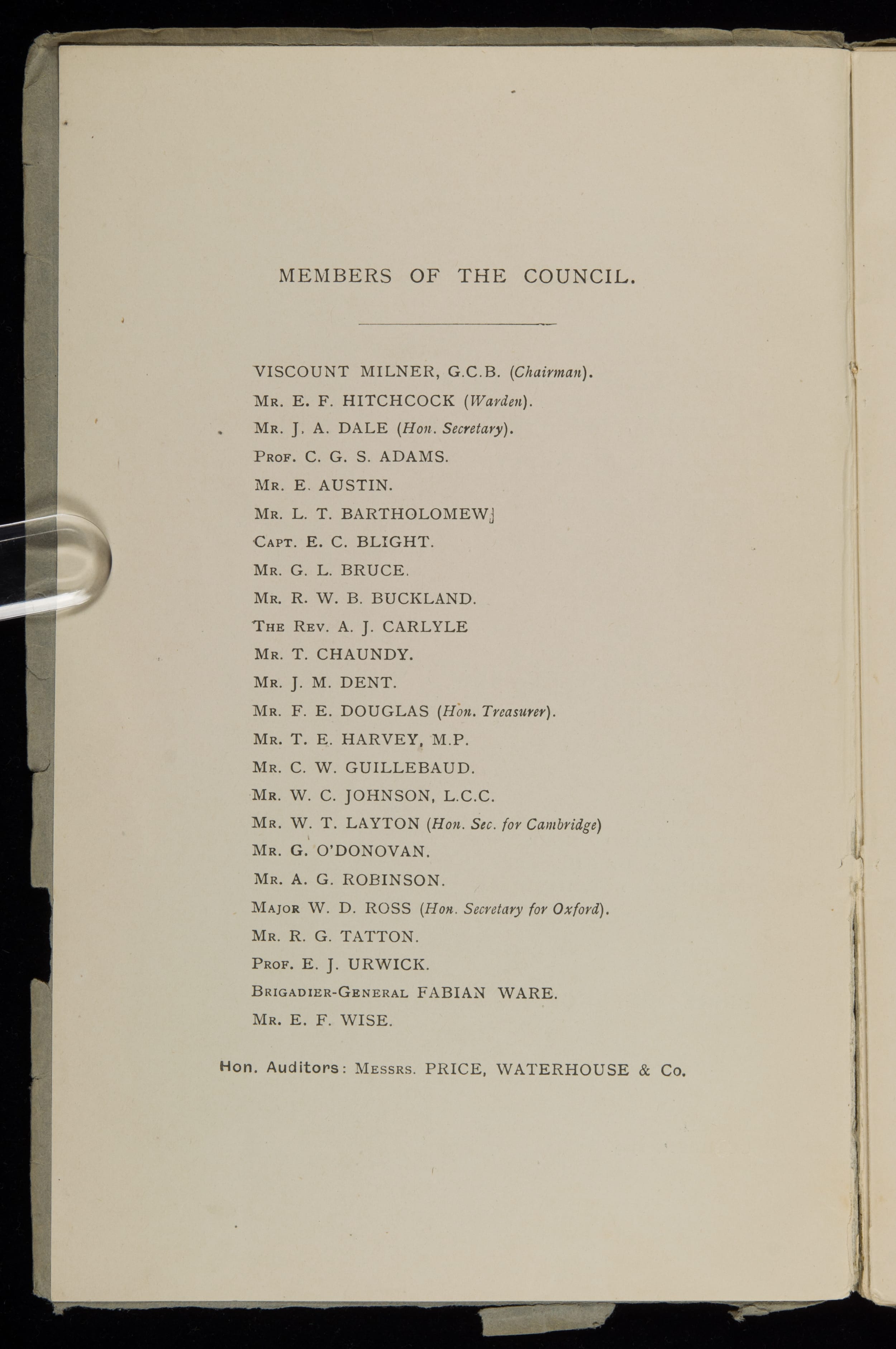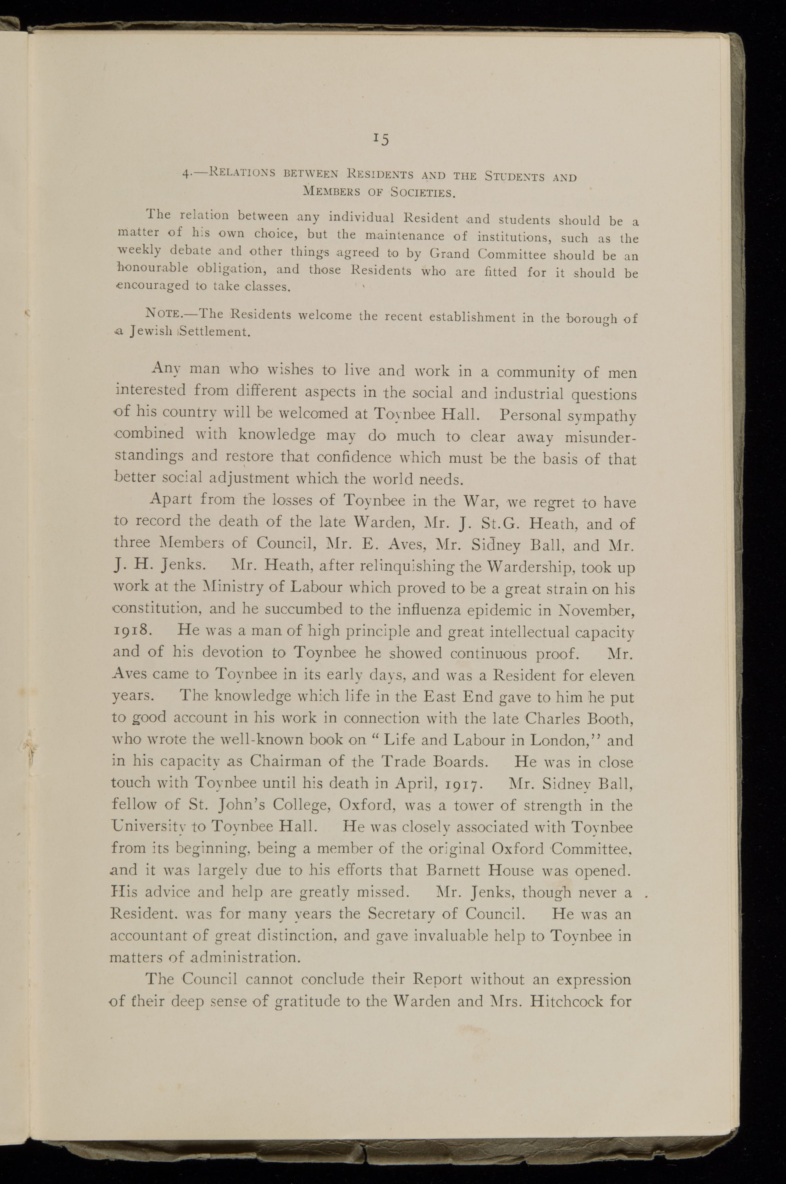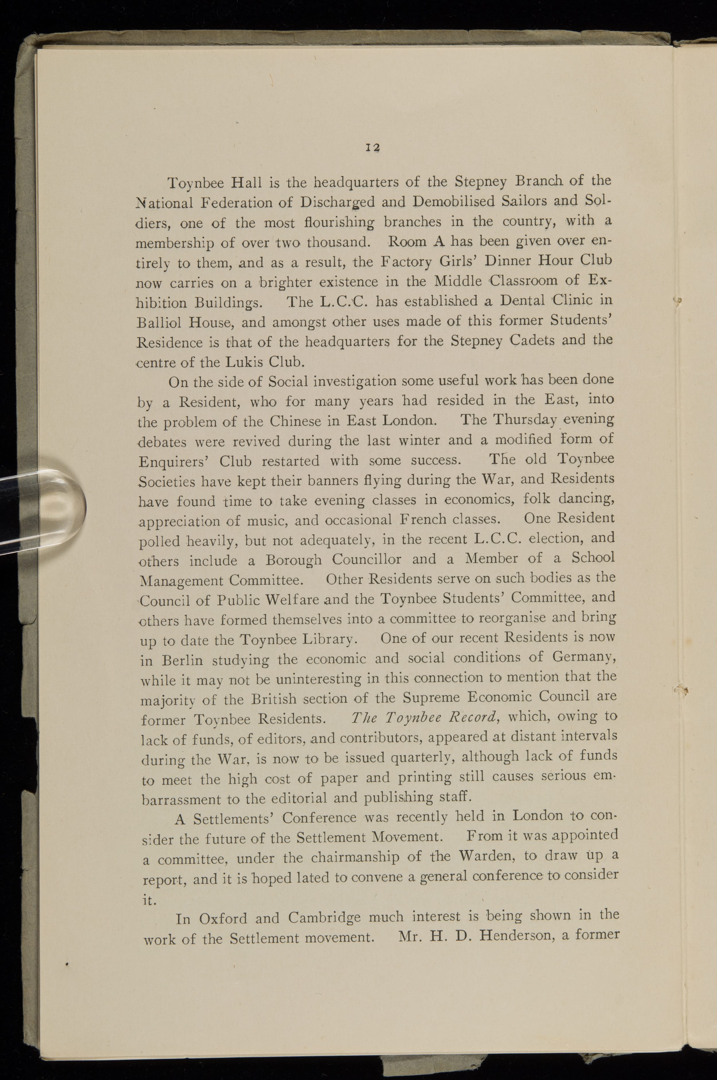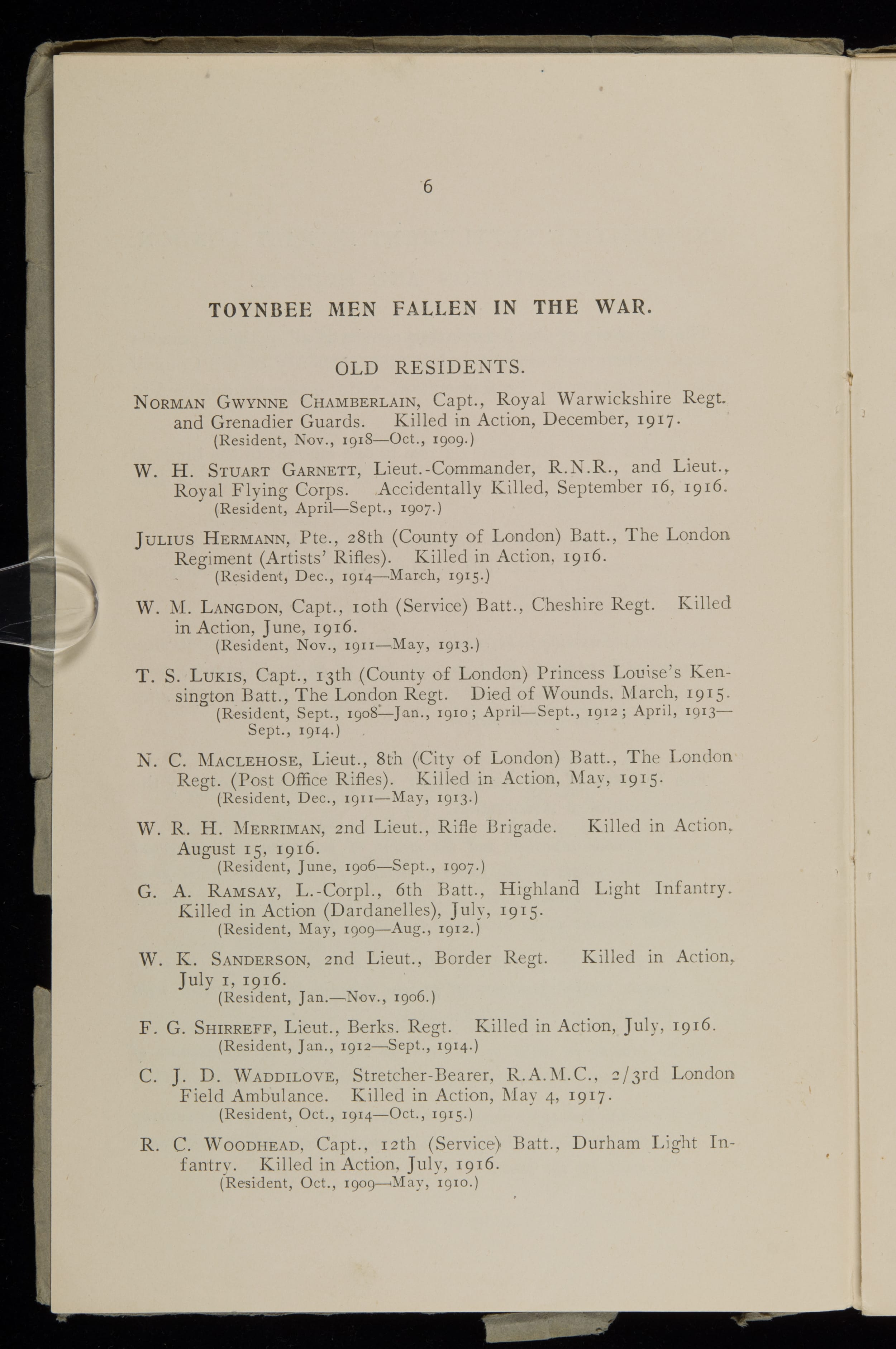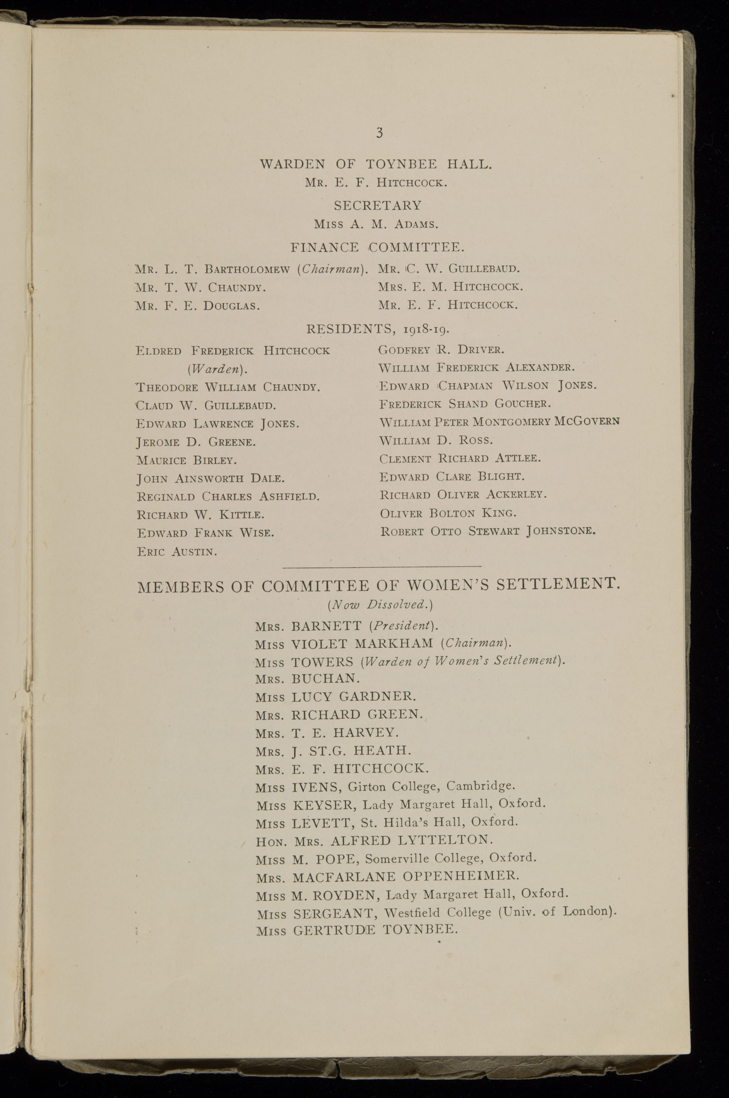 Annual Reports 1916- 1919 Contains a war report and lists members, residents and residents of the womens settlement. Lists those who died in action. 1 volume