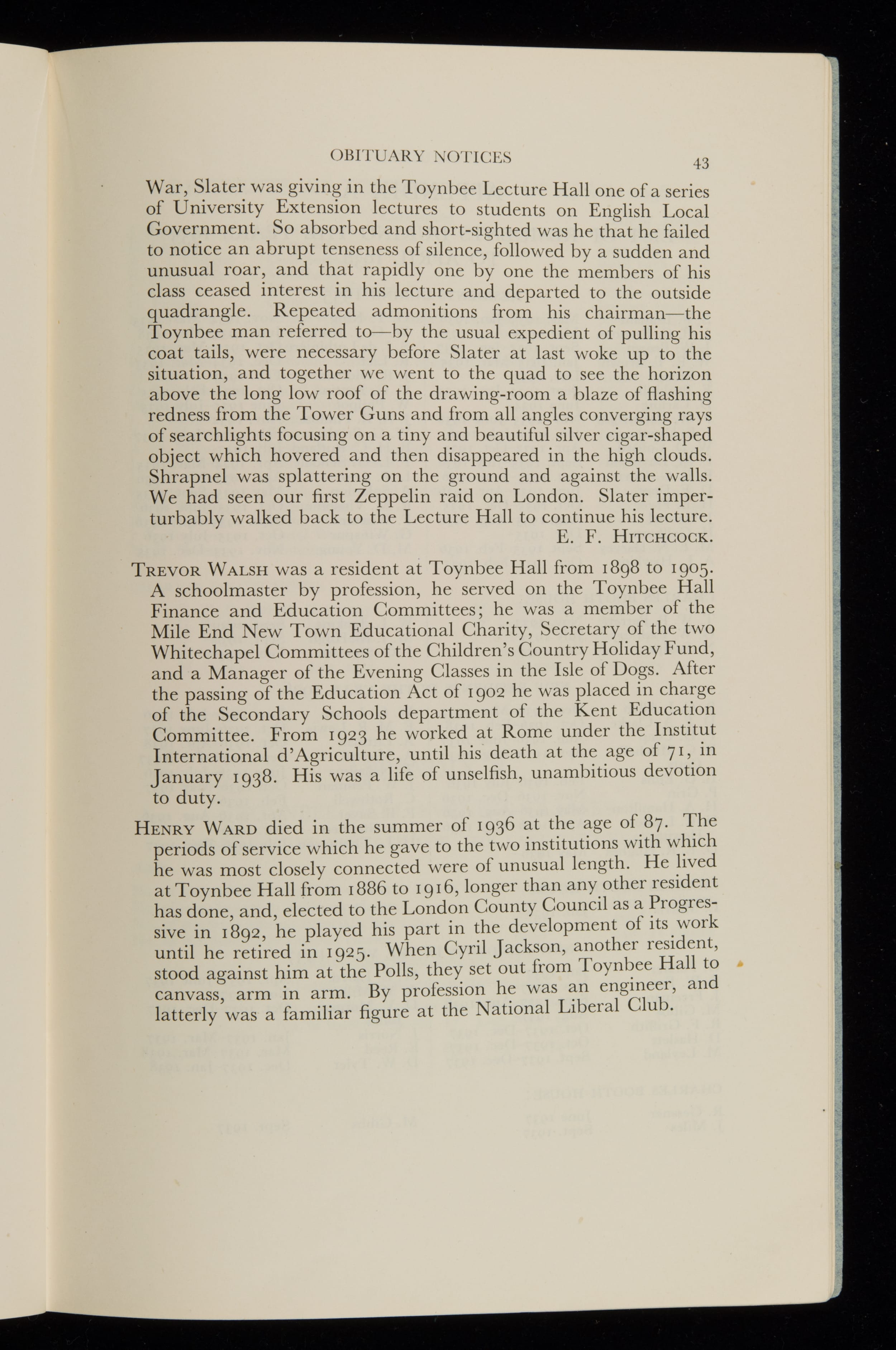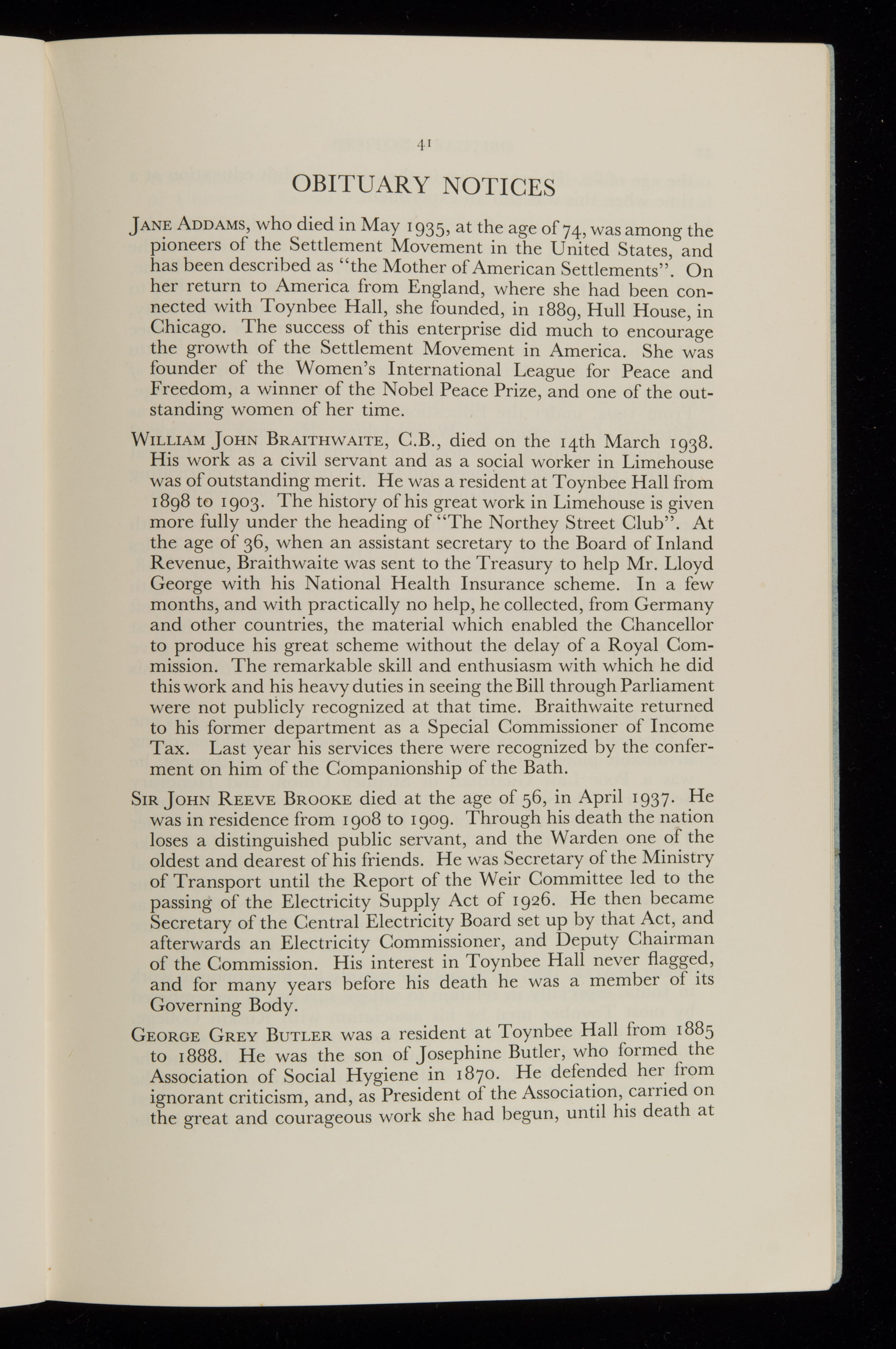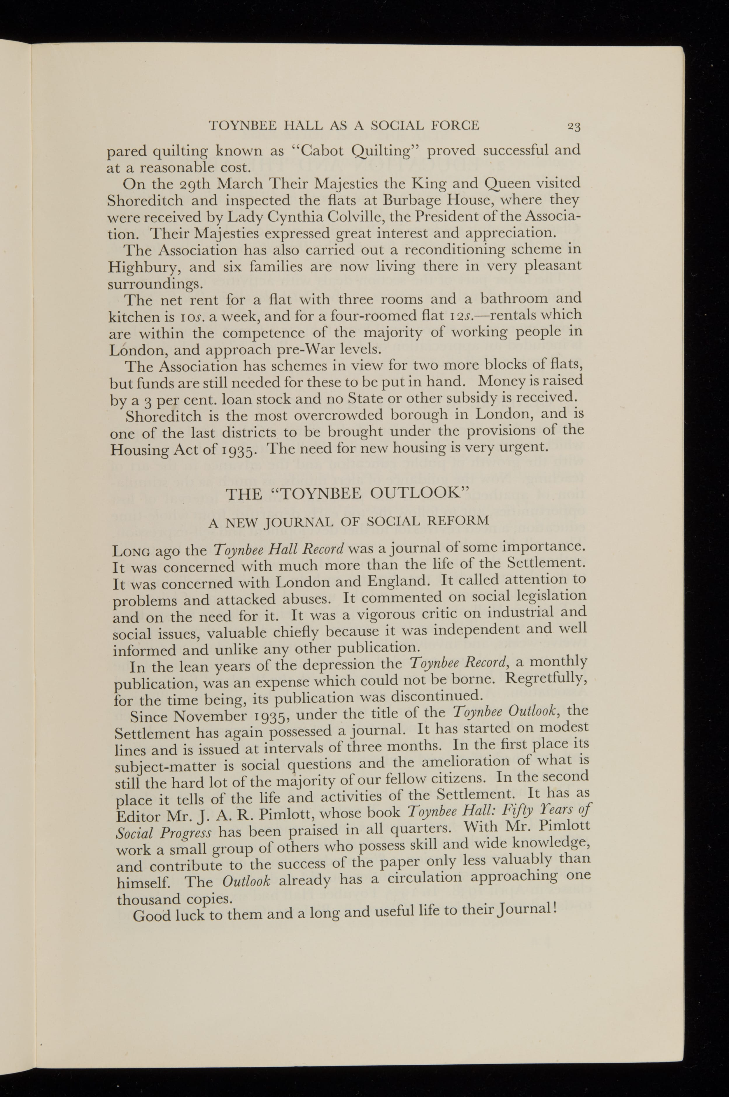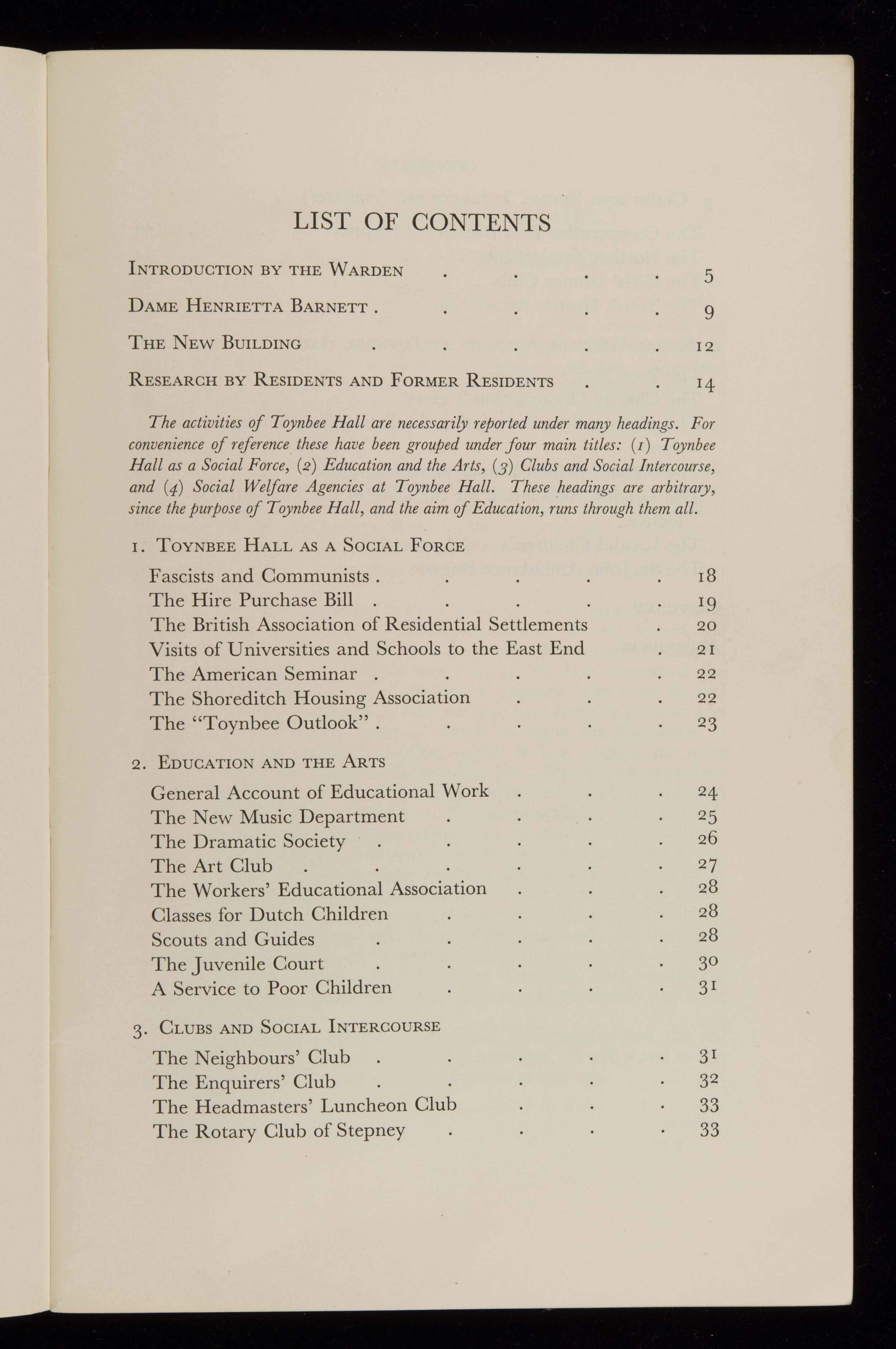 Includes articles on Toynbee Hall as a social force, the Cable Street march, the Hire Purchase Bill, the Shoreditch Housing Association and educational activities. Obituary notices for Henrietta Barnett, Jane Addams, Bolton King, Lady Lukis and Henry Ward. There are lists of residents, members and associates. 1 volume