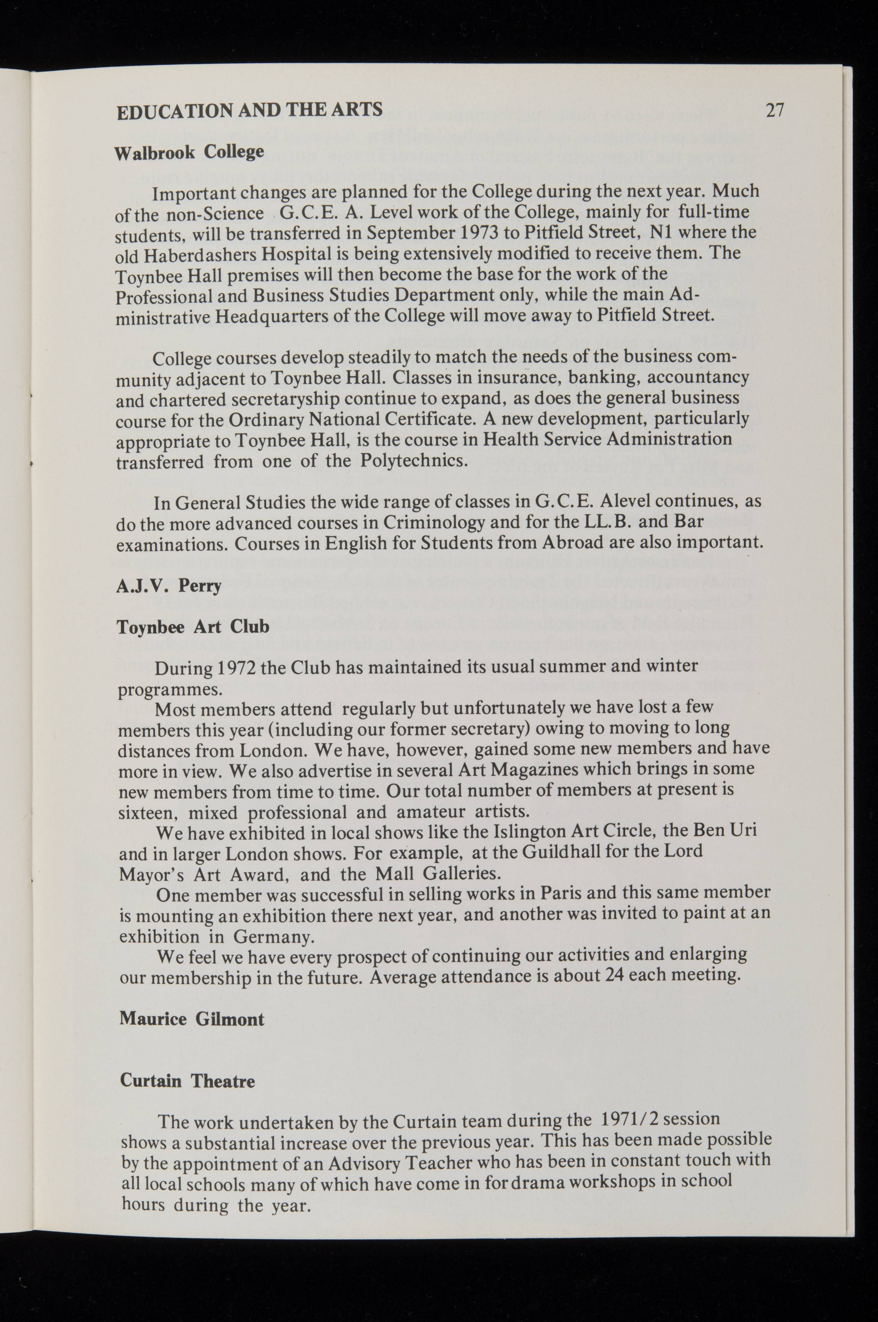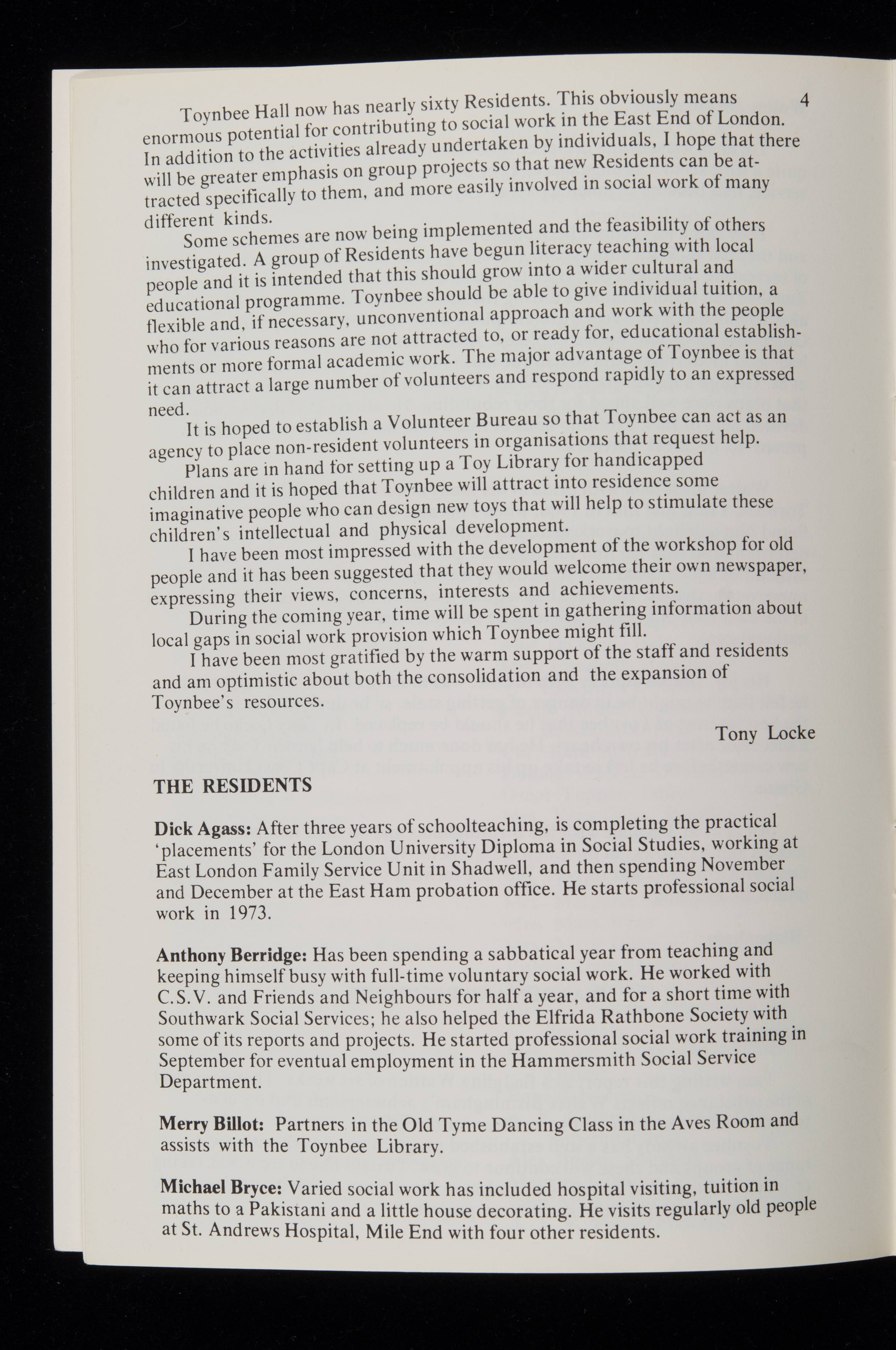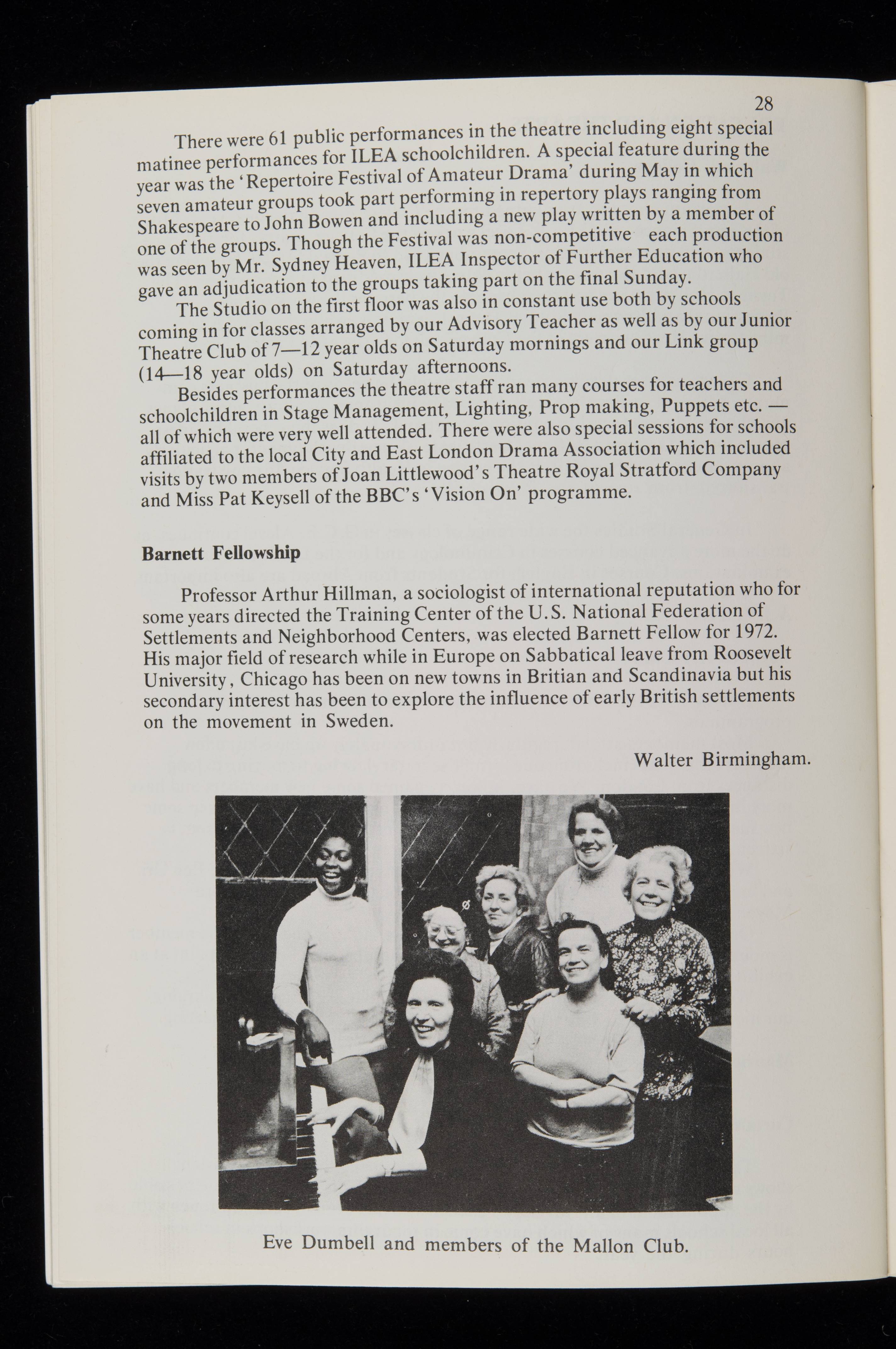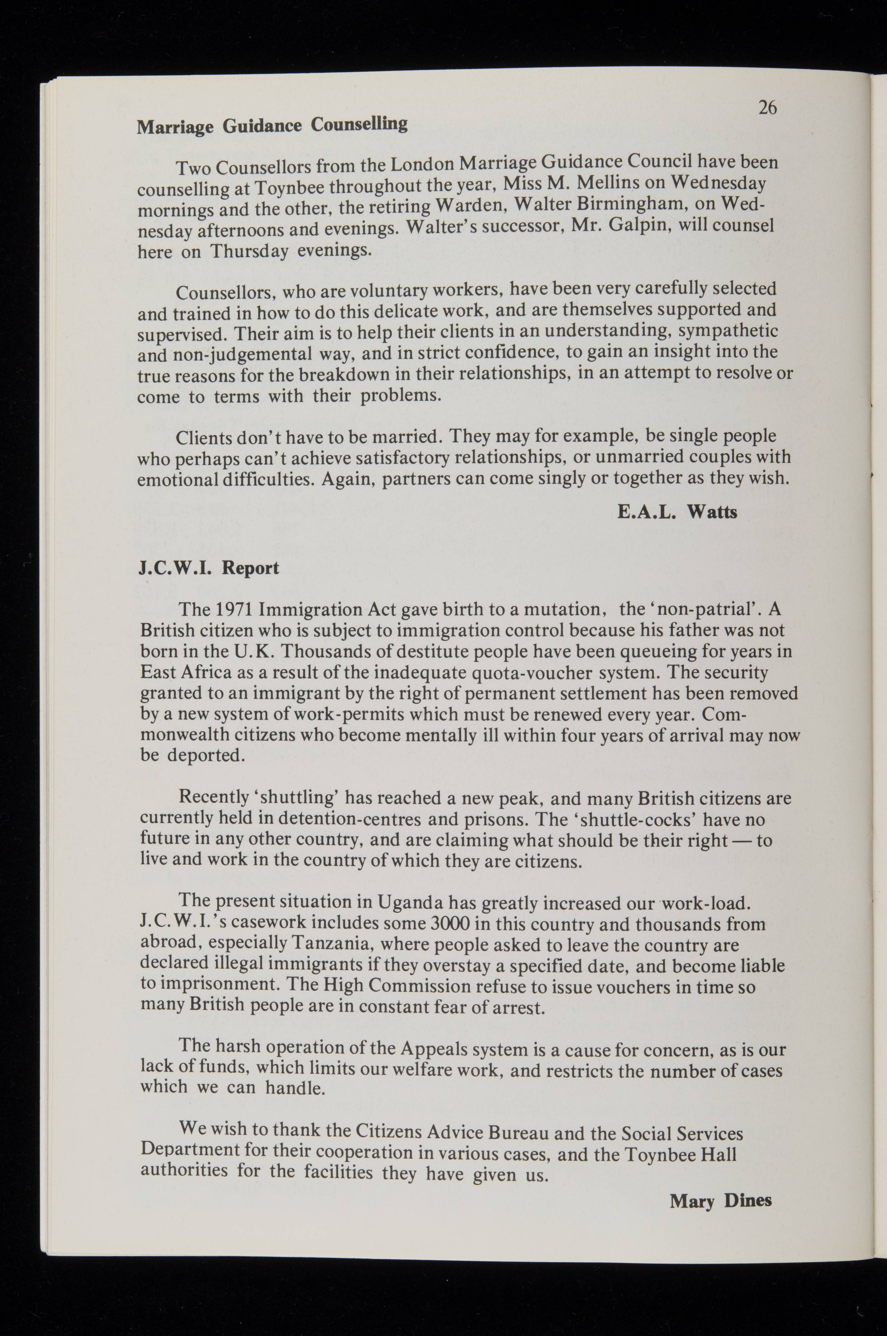 Contains indepth report by Walter Birmingham of all activities at Toynbee Hall. 1 volume