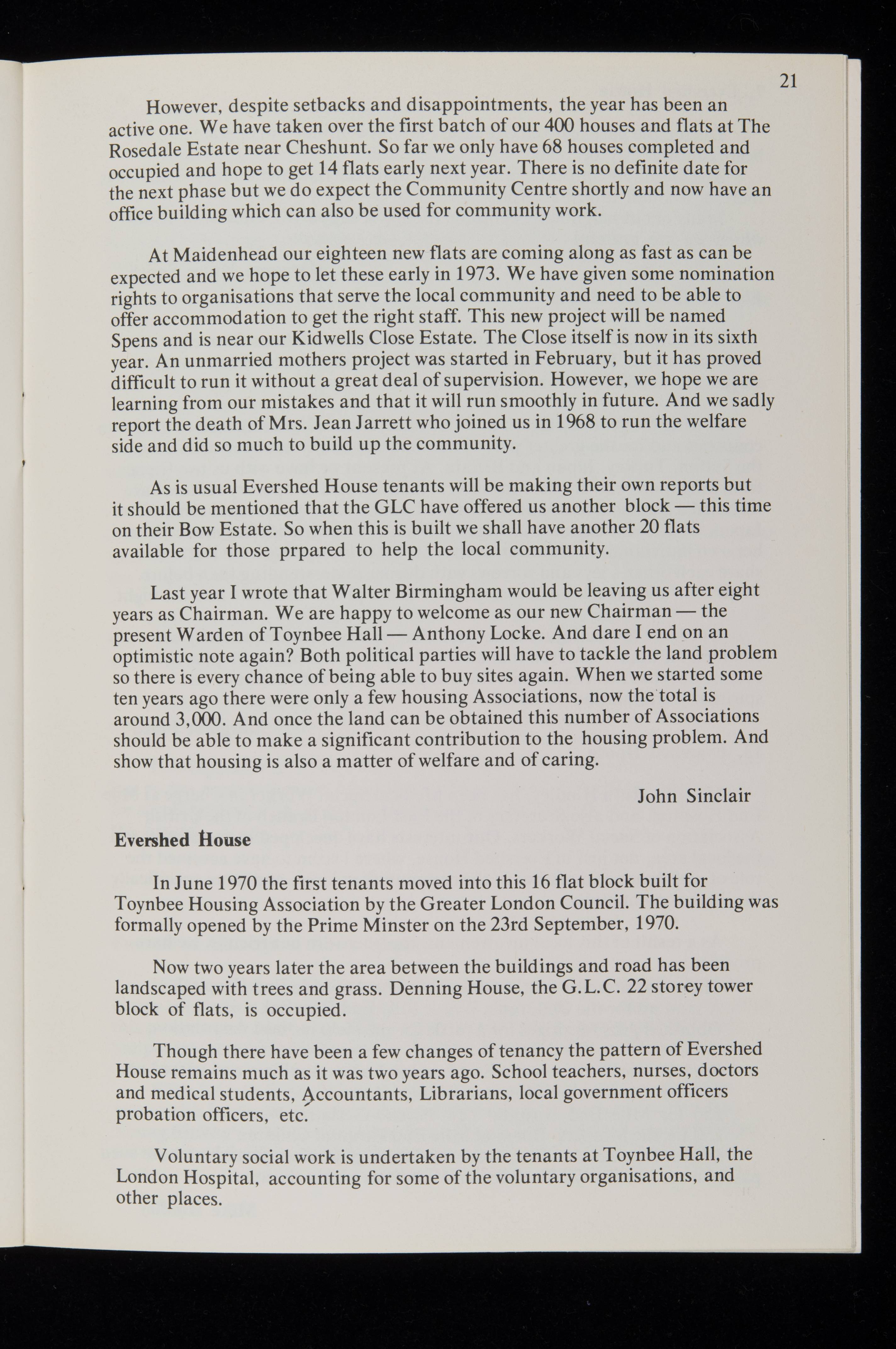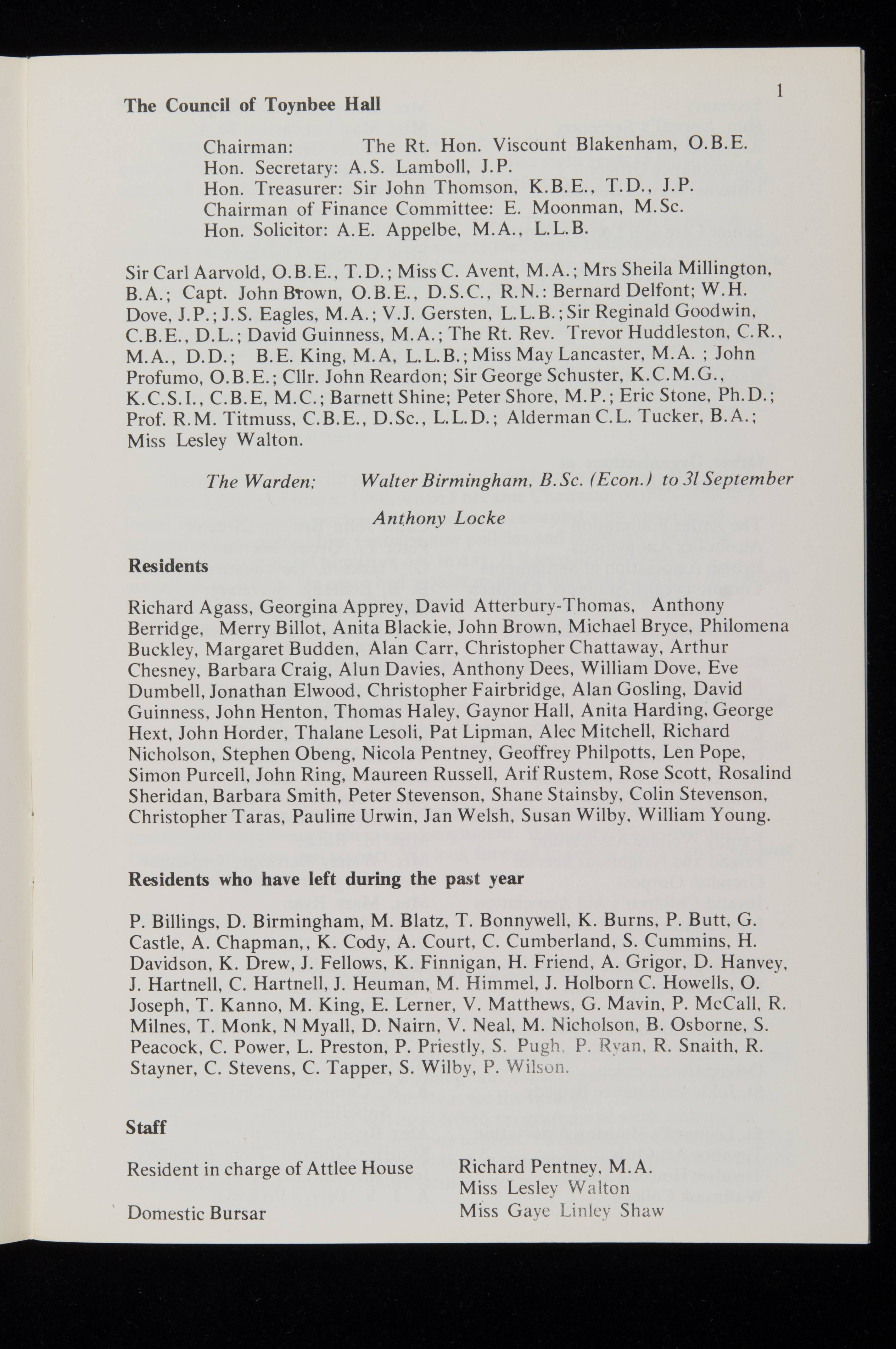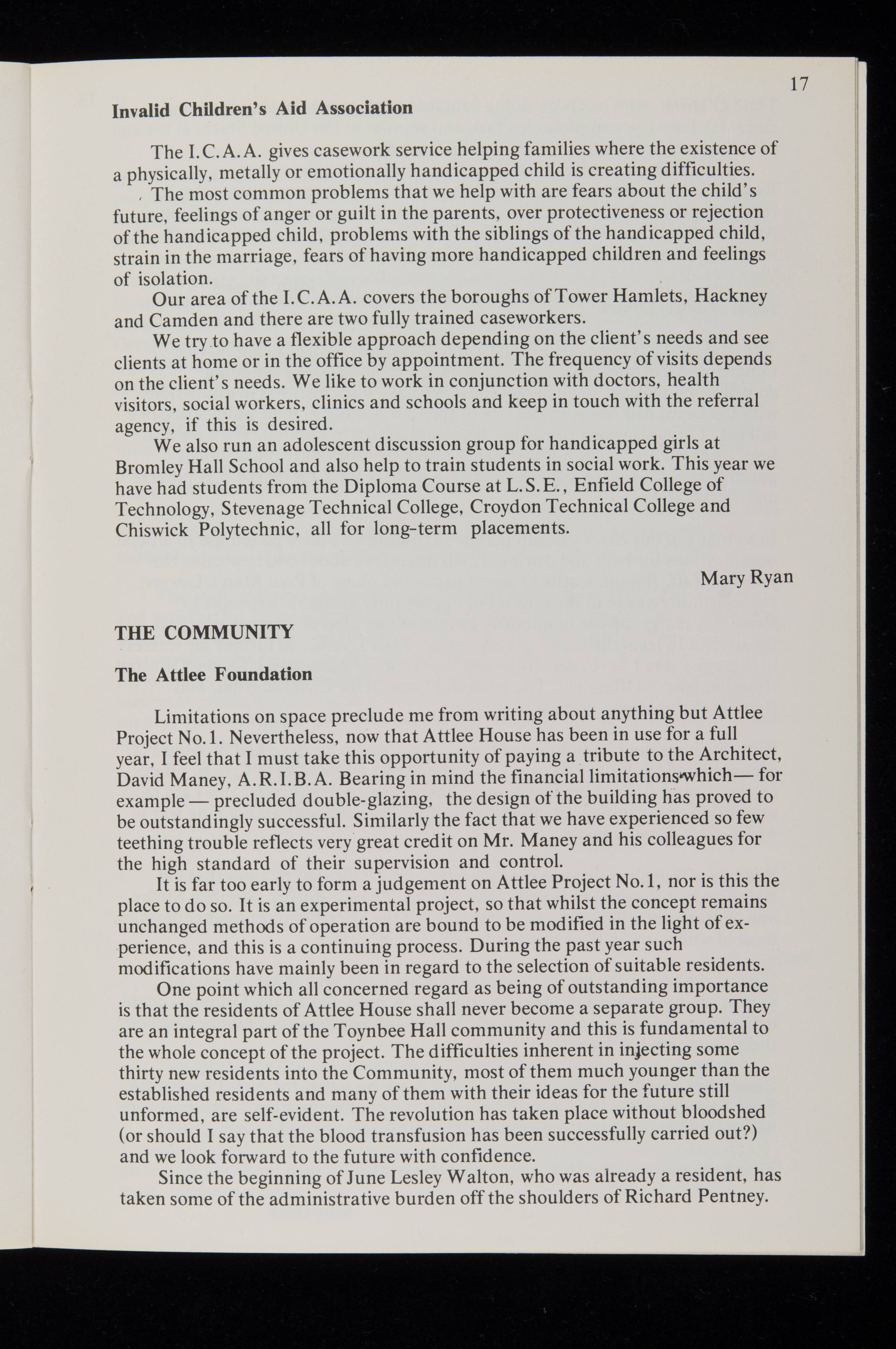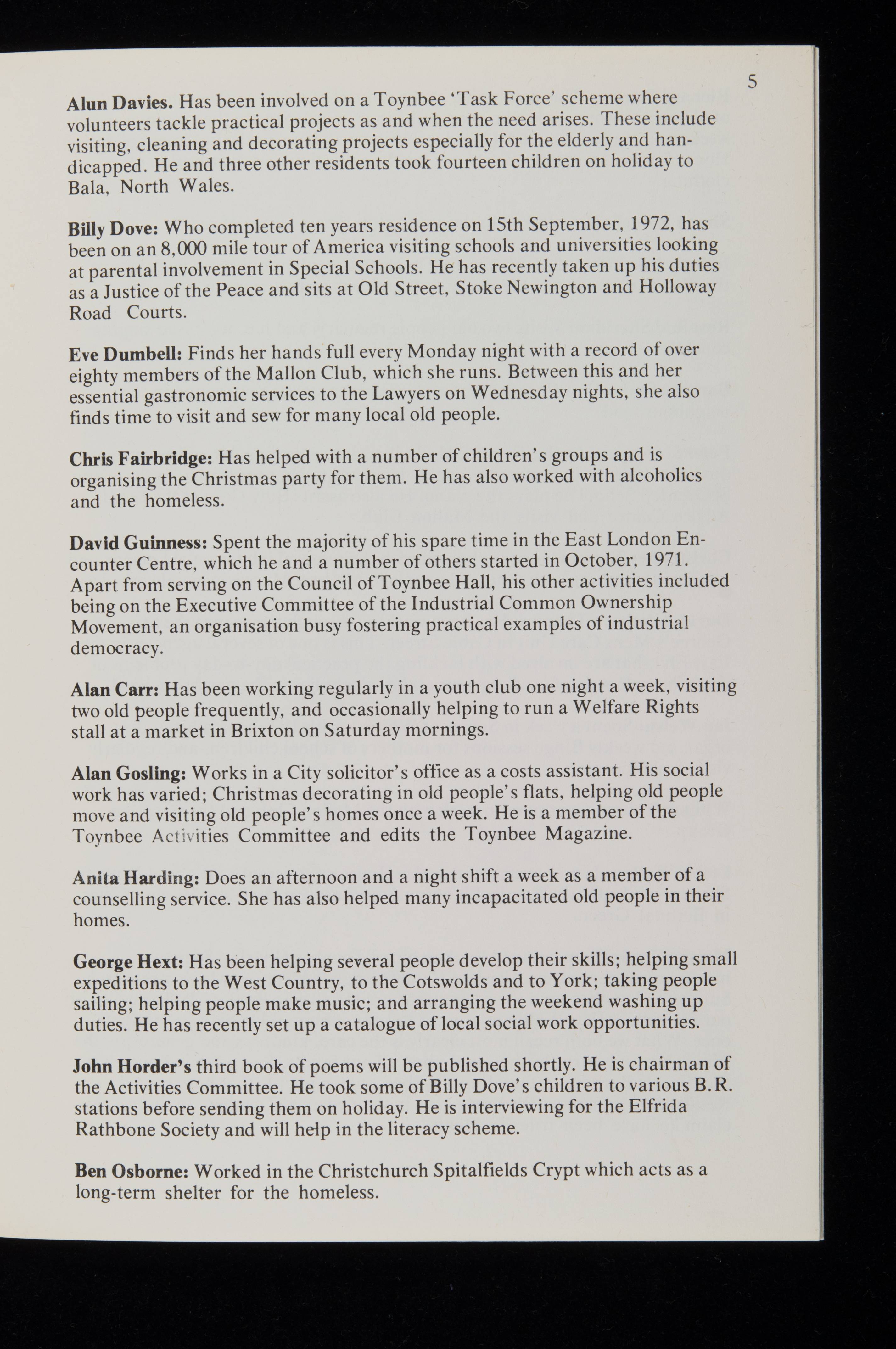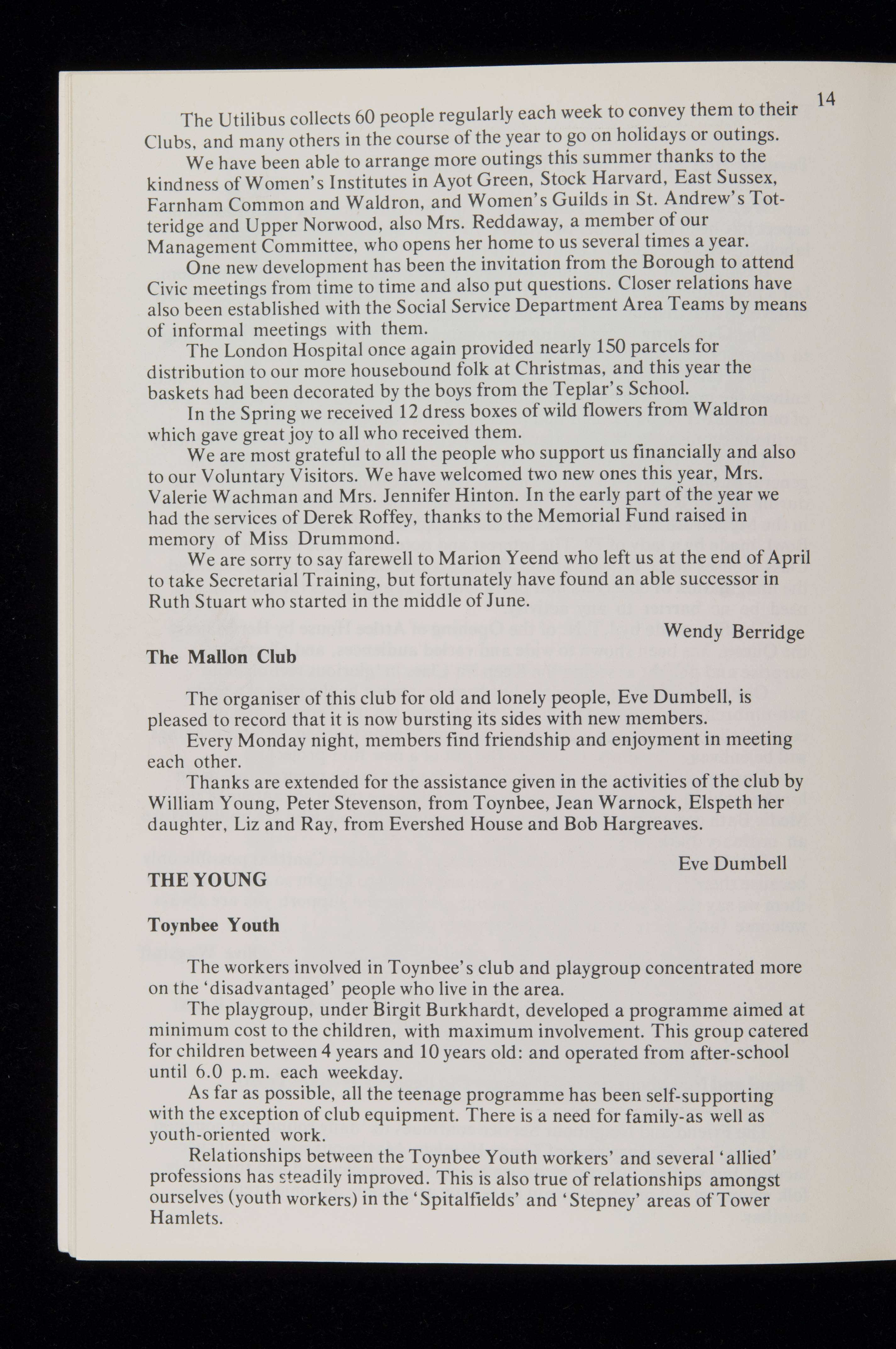 Contains indepth report by Walter Birmingham of all activities at Toynbee Hall. 1 volume