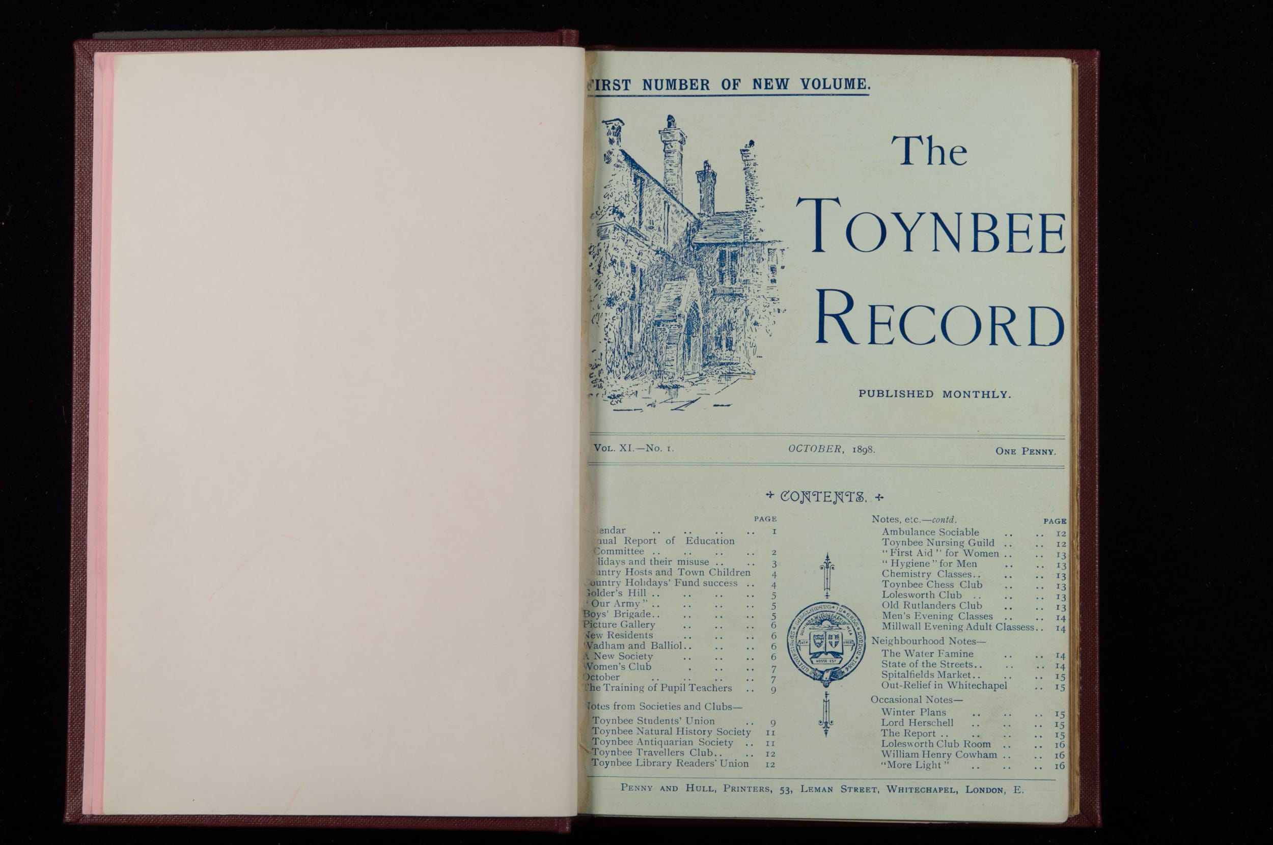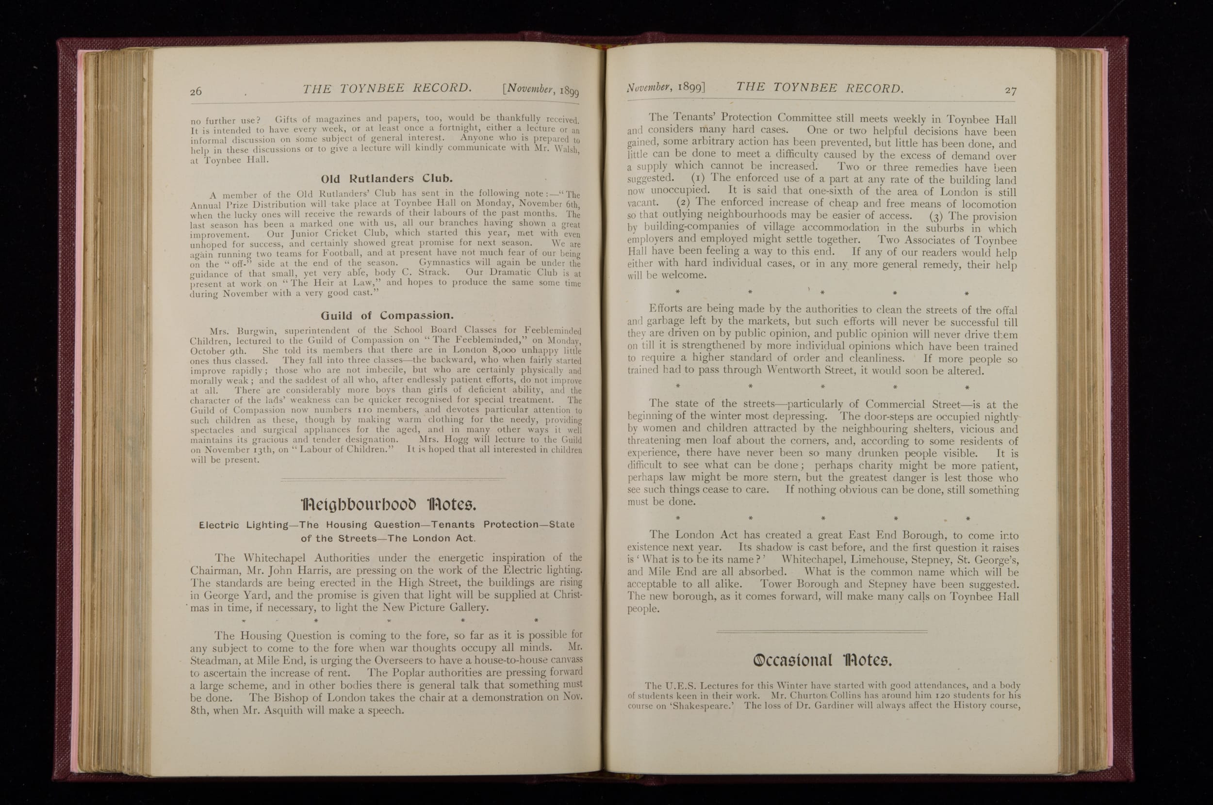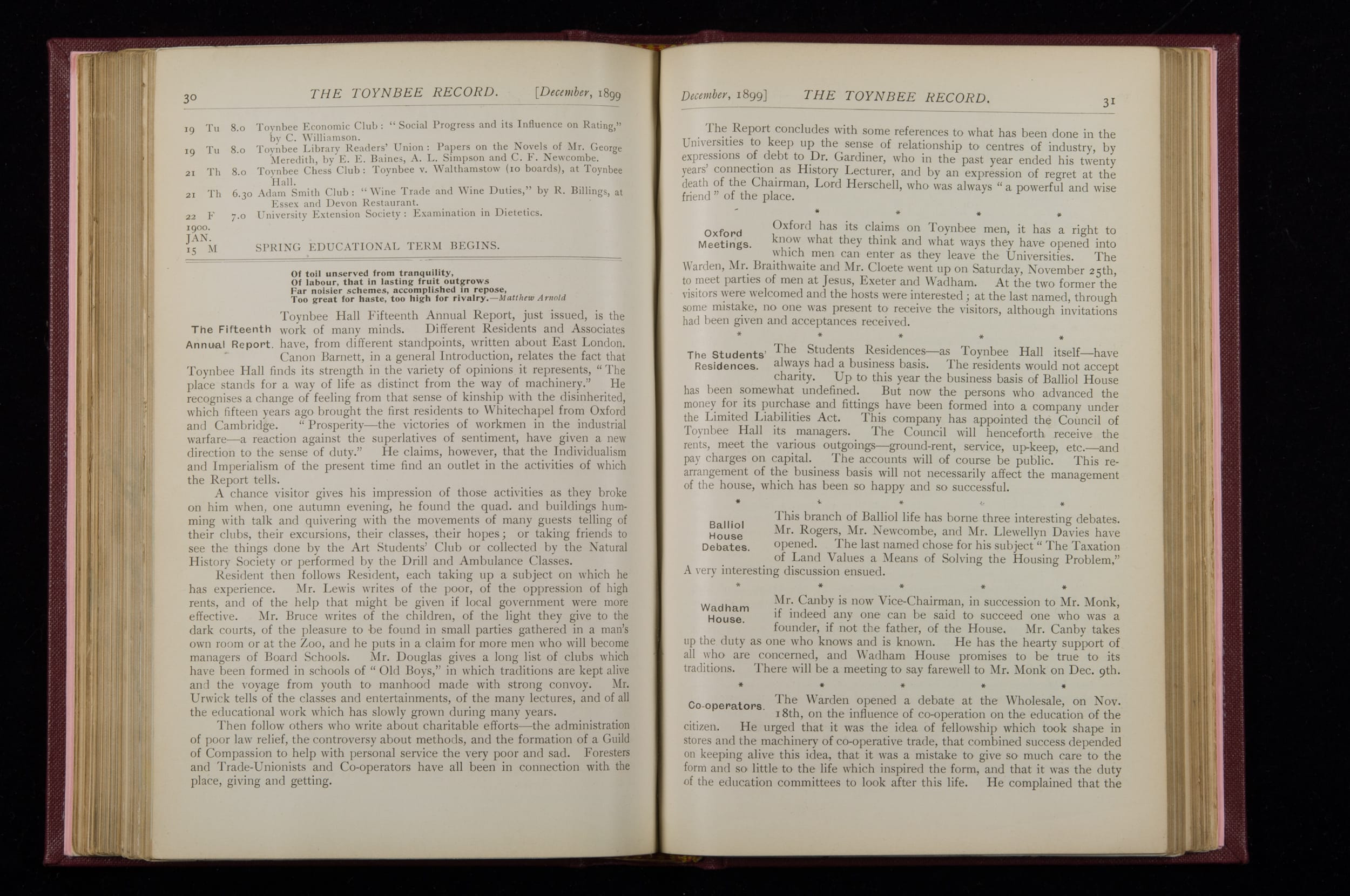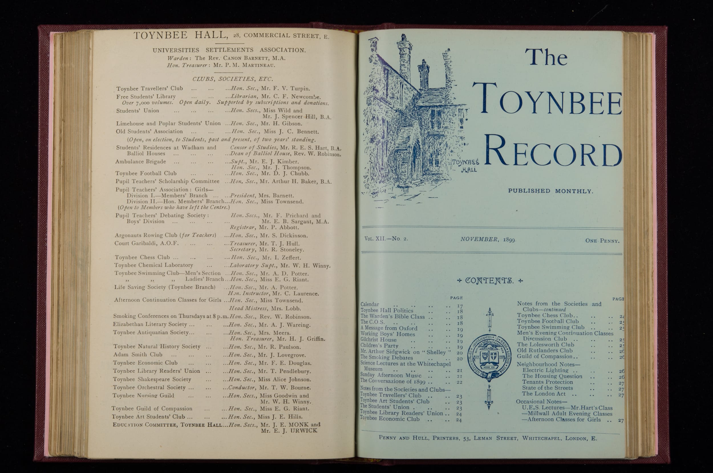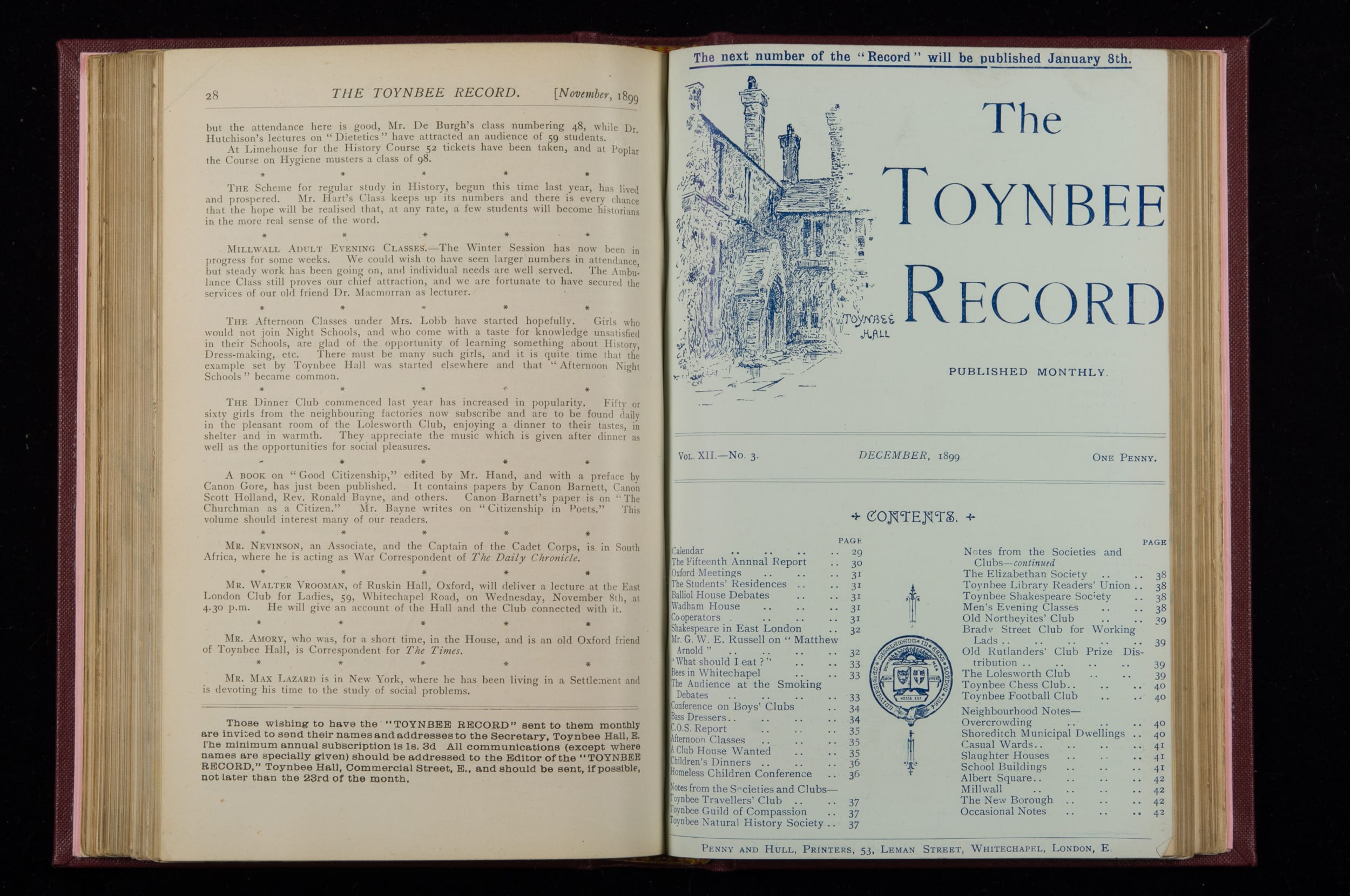 Contains monthly detailed reports of the activities at Toynbee Hall, the clubs and societies, conferences, eveniing events, articles and lists of classes and meetings. Includes photographs and lists of names, notes and forthcoming events. 1 volume