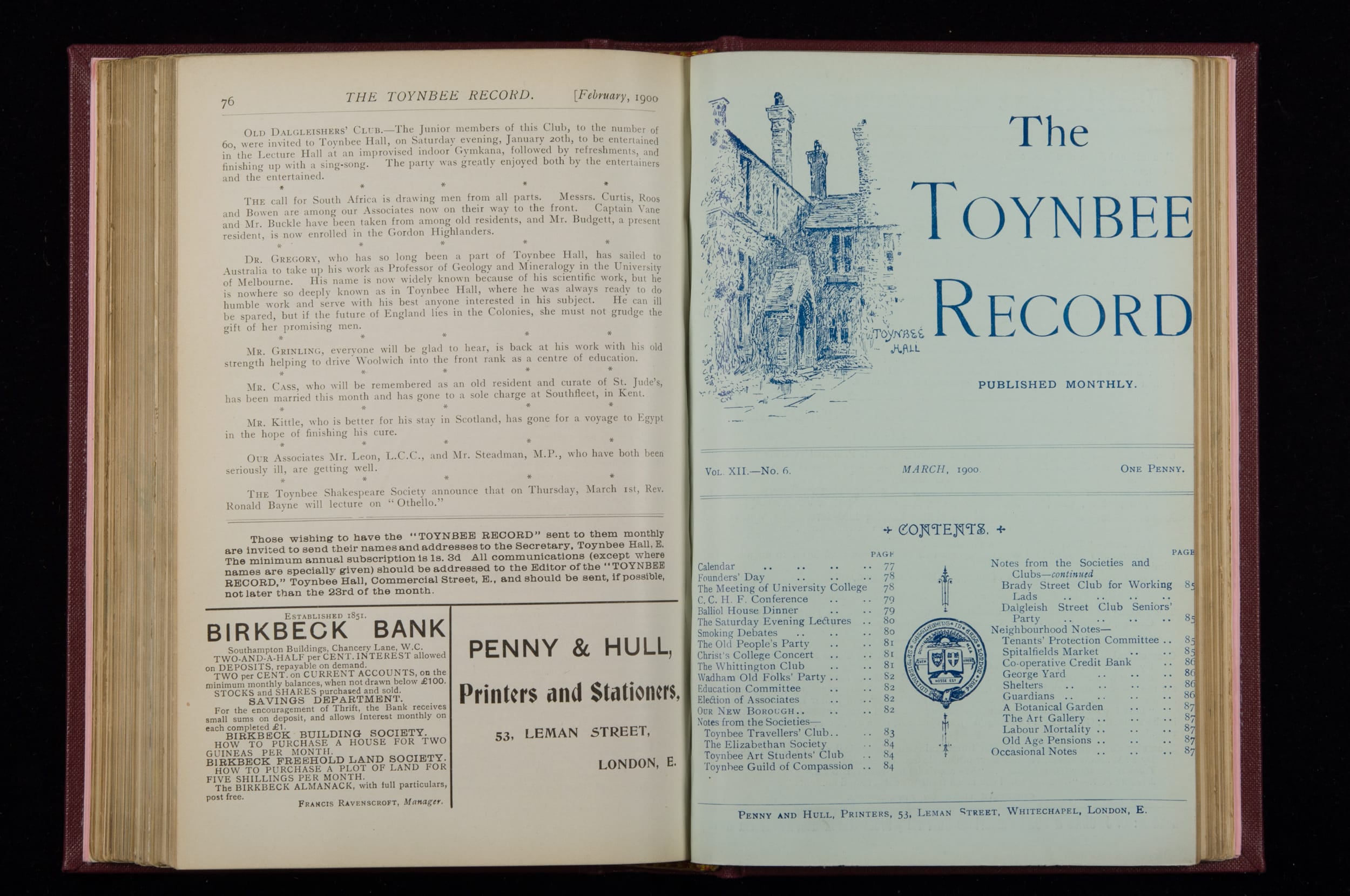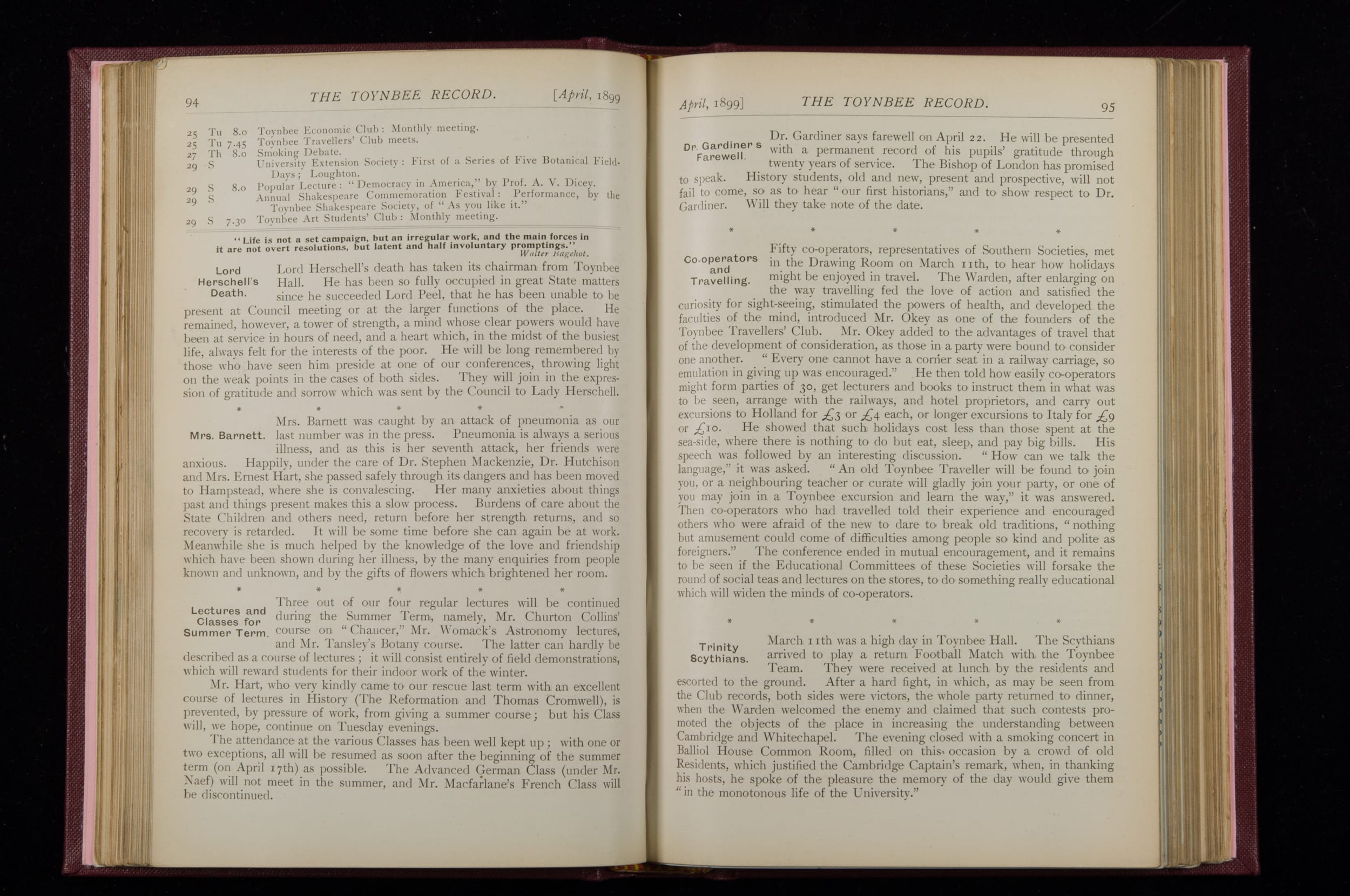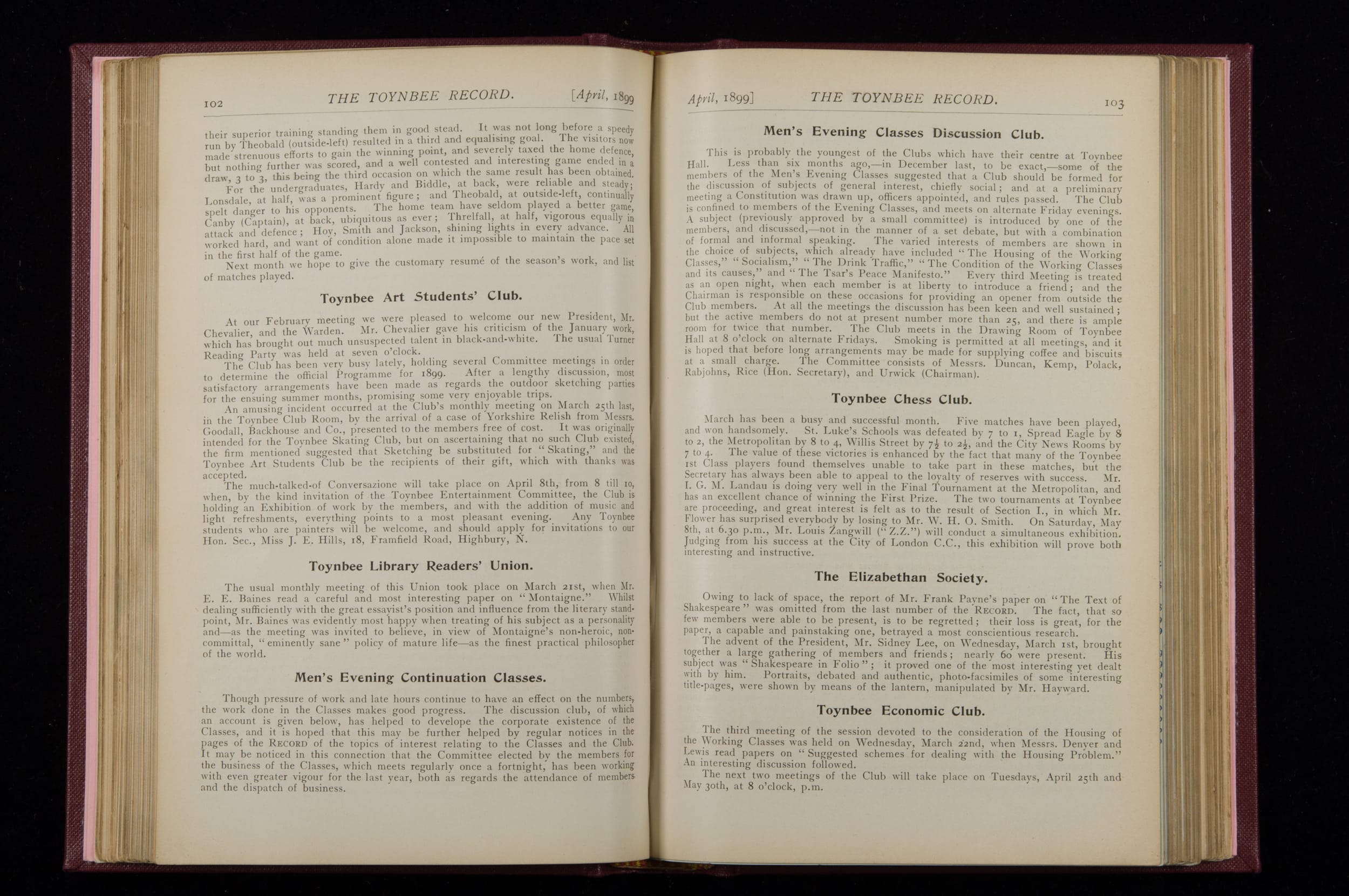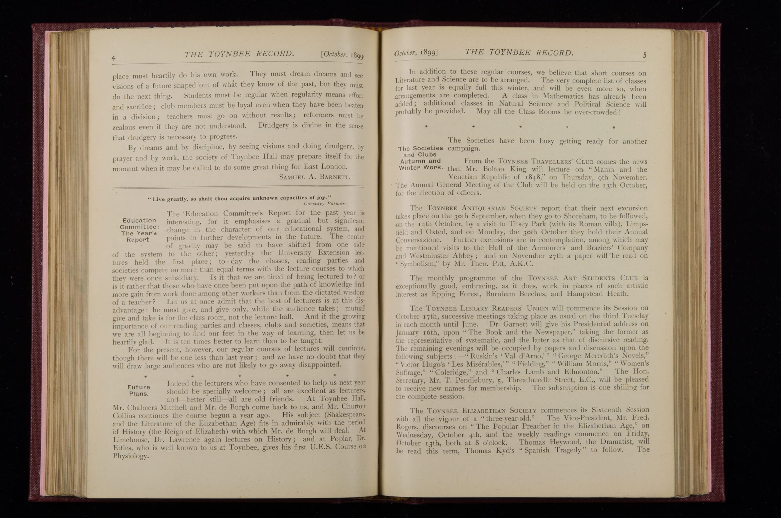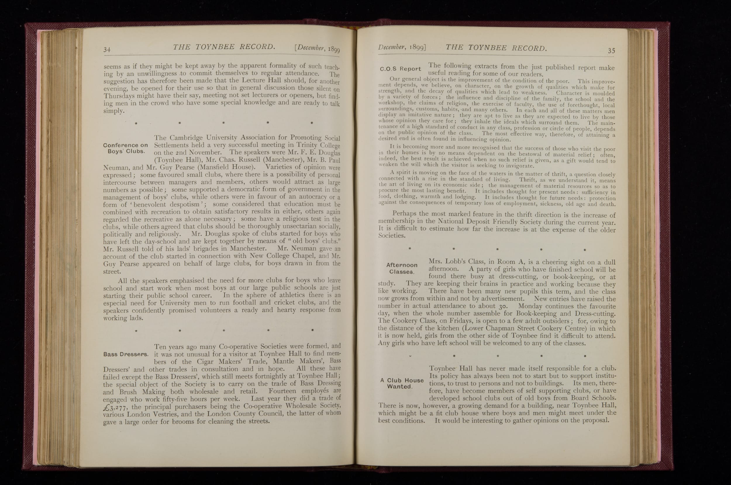 Contains monthly detailed reports of the activities at Toynbee Hall, the clubs and societies, conferences, eveniing events, articles and lists of classes and meetings. Includes photographs and lists of names, notes and forthcoming events. 1 volume