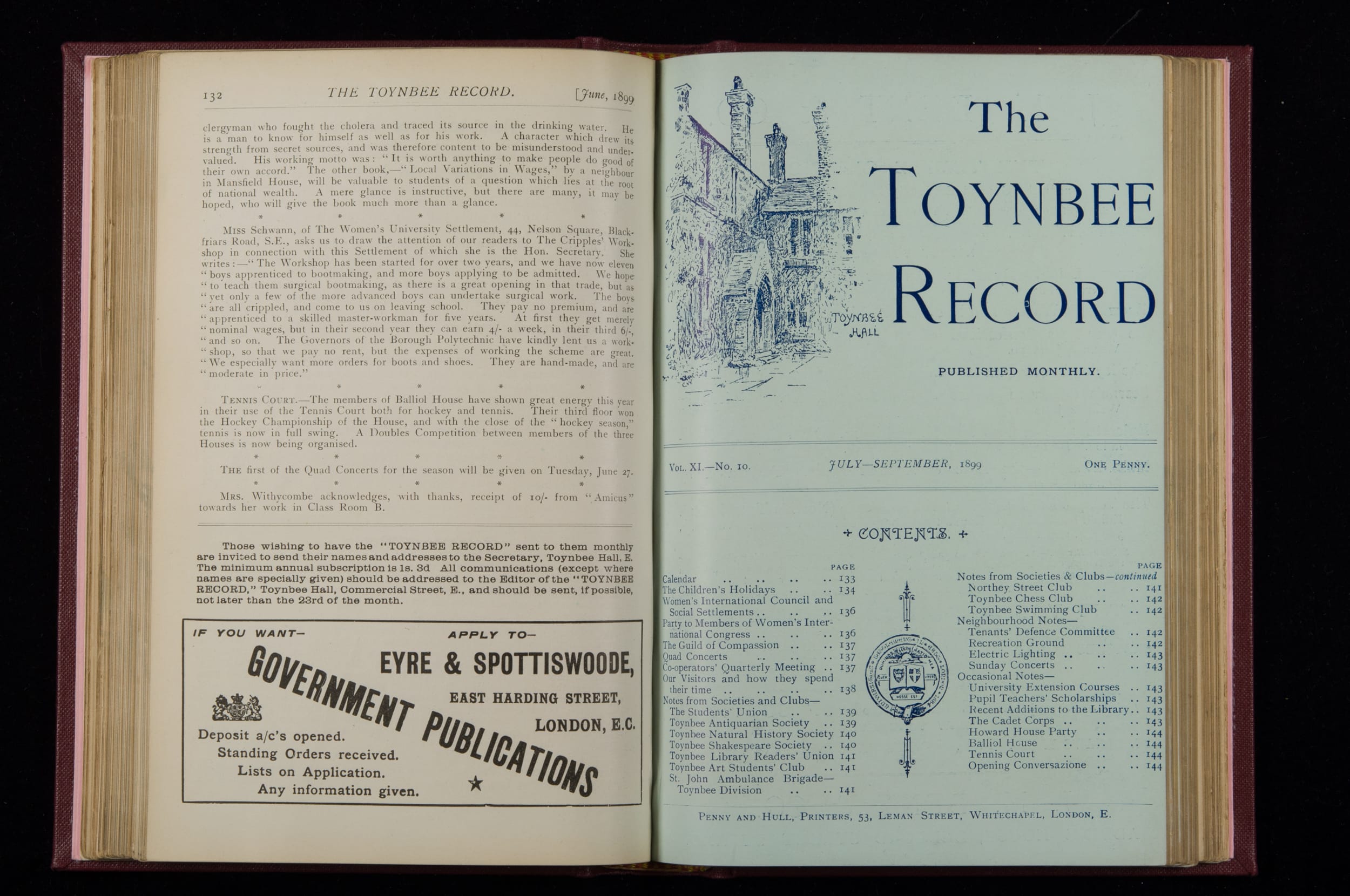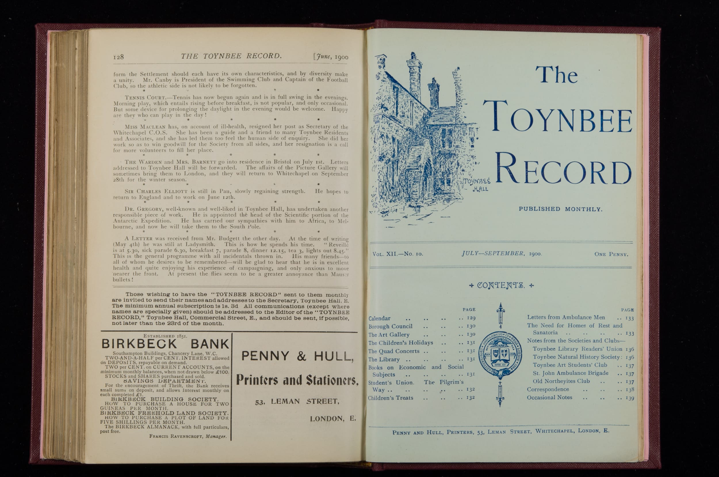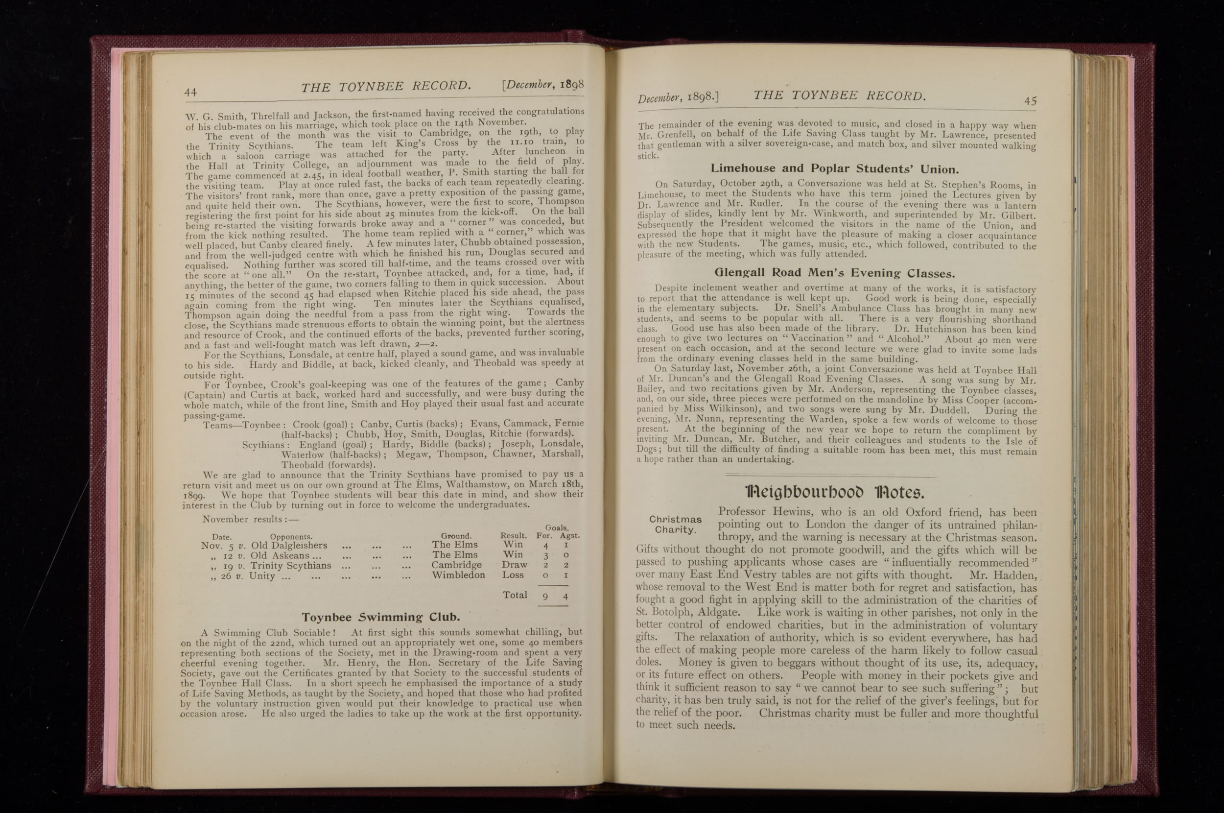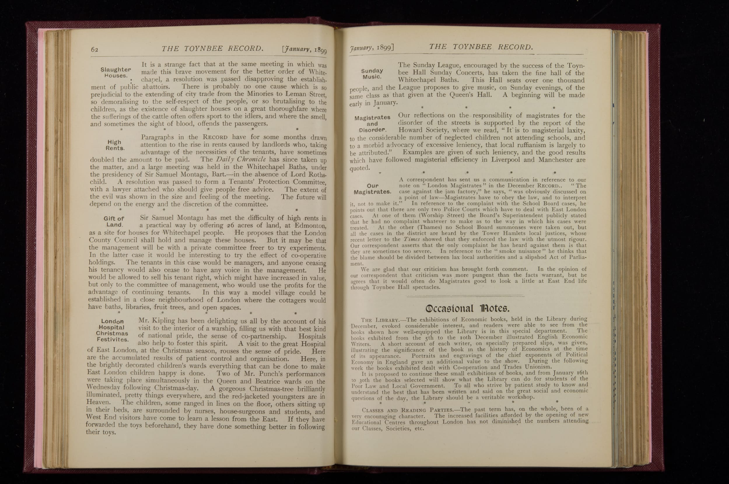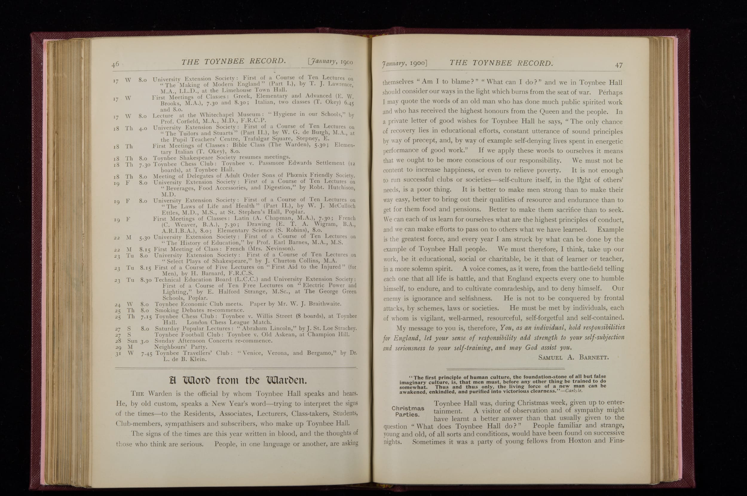 Contains monthly detailed reports of the activities at Toynbee Hall, the clubs and societies, conferences, eveniing events, articles and lists of classes and meetings. Includes photographs and lists of names, notes and forthcoming events. 1 volume