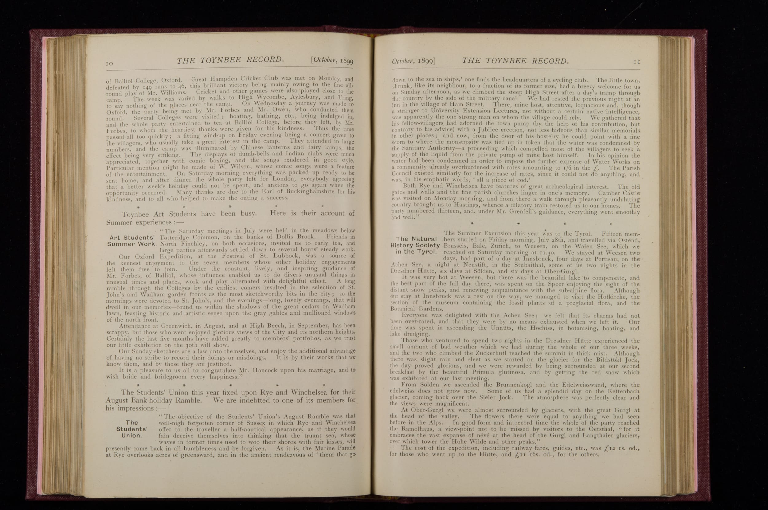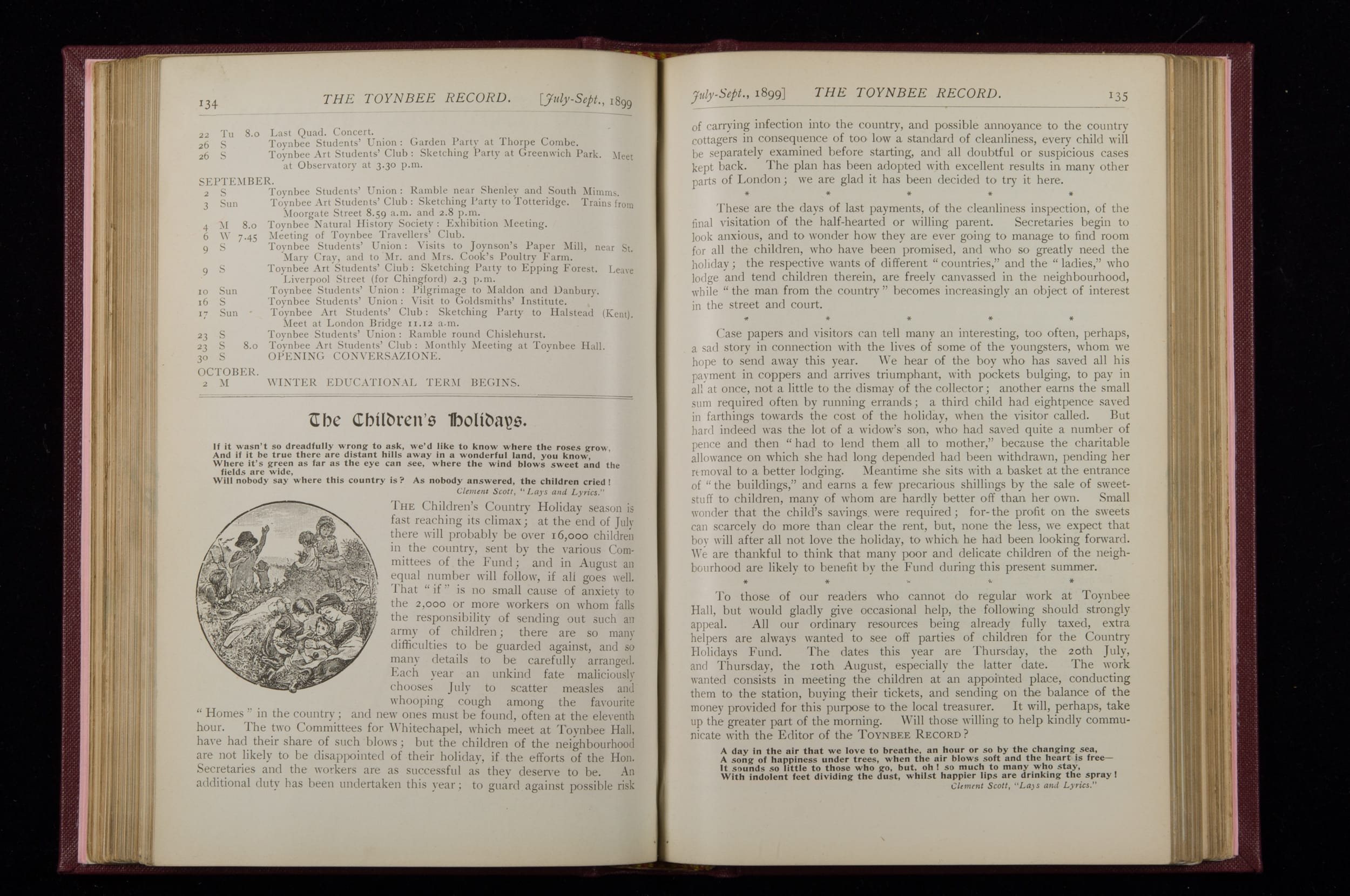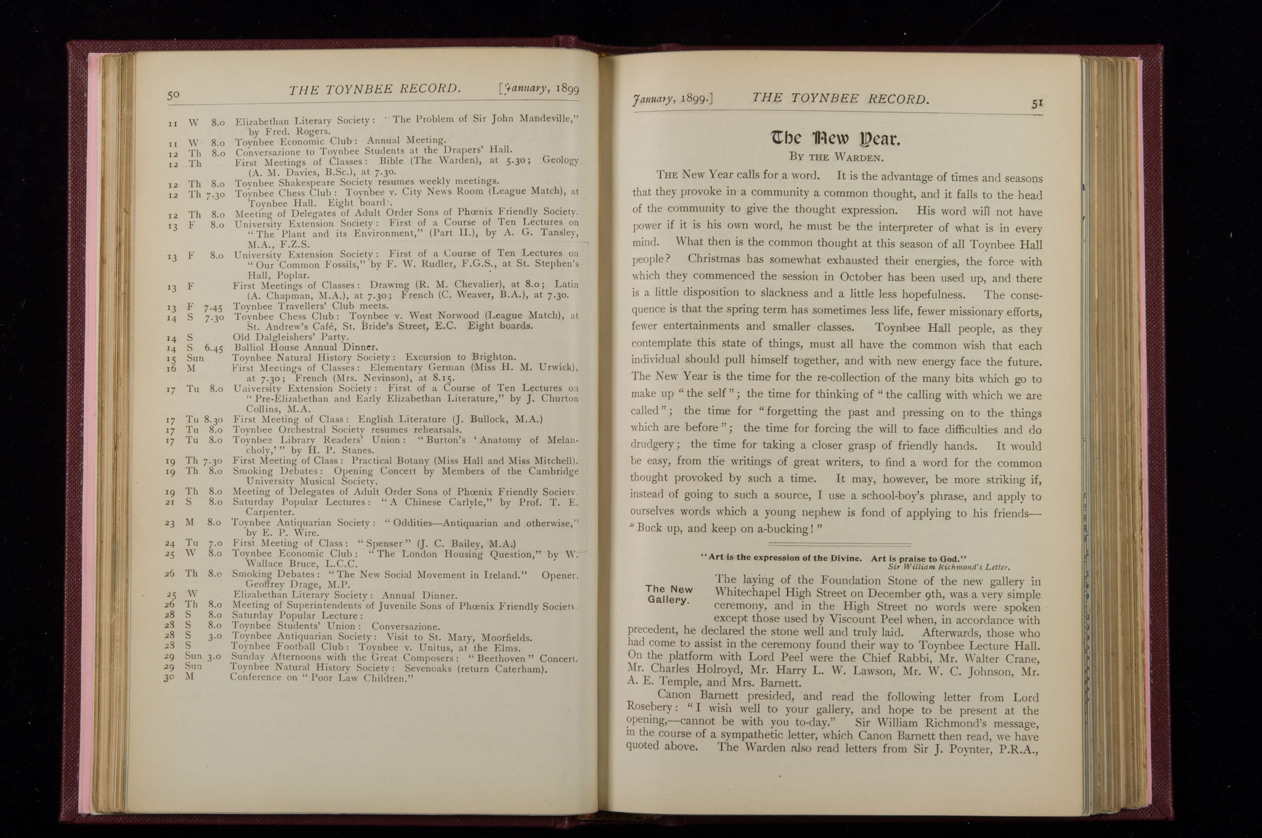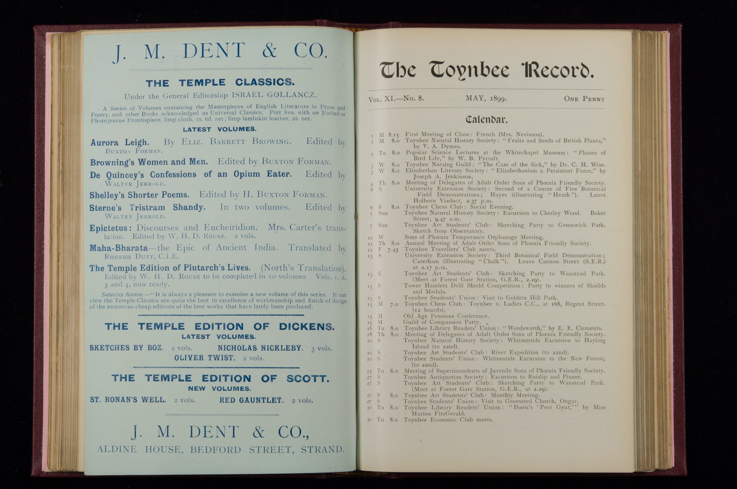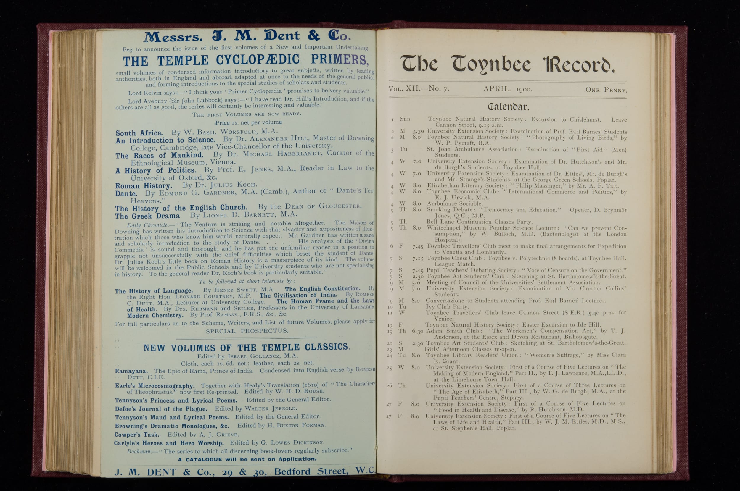 Contains monthly detailed reports of the activities at Toynbee Hall, the clubs and societies, conferences, eveniing events, articles and lists of classes and meetings. Includes photographs and lists of names, notes and forthcoming events. 1 volume