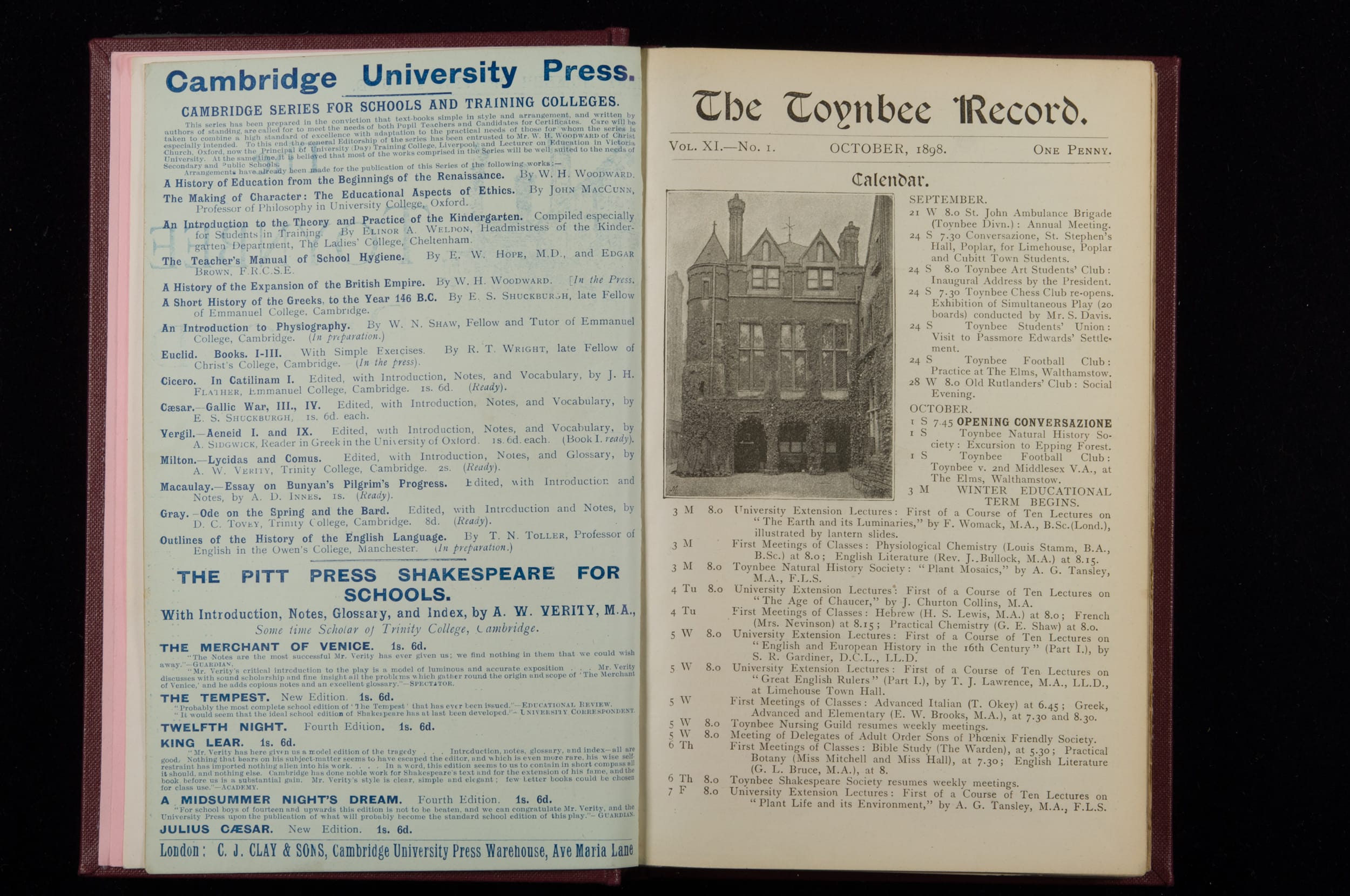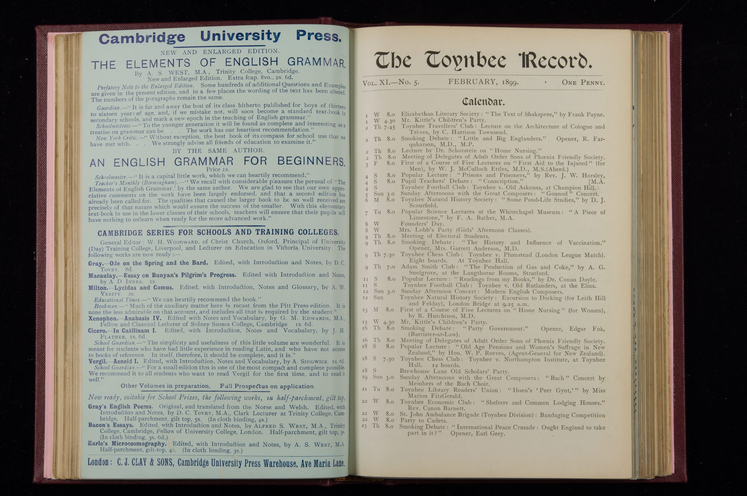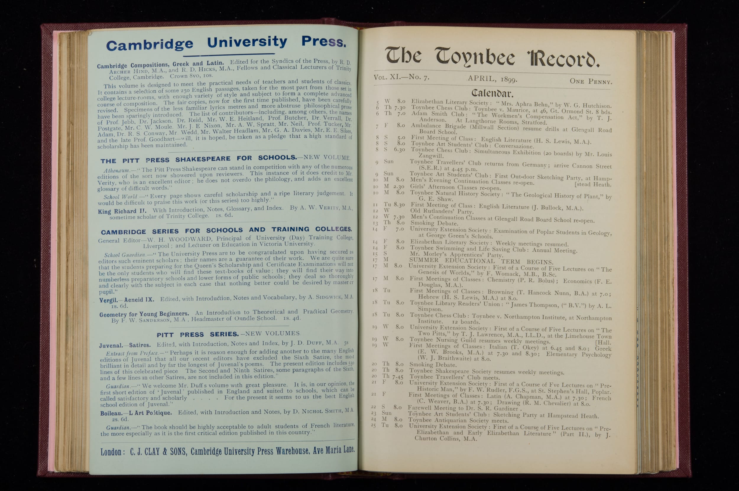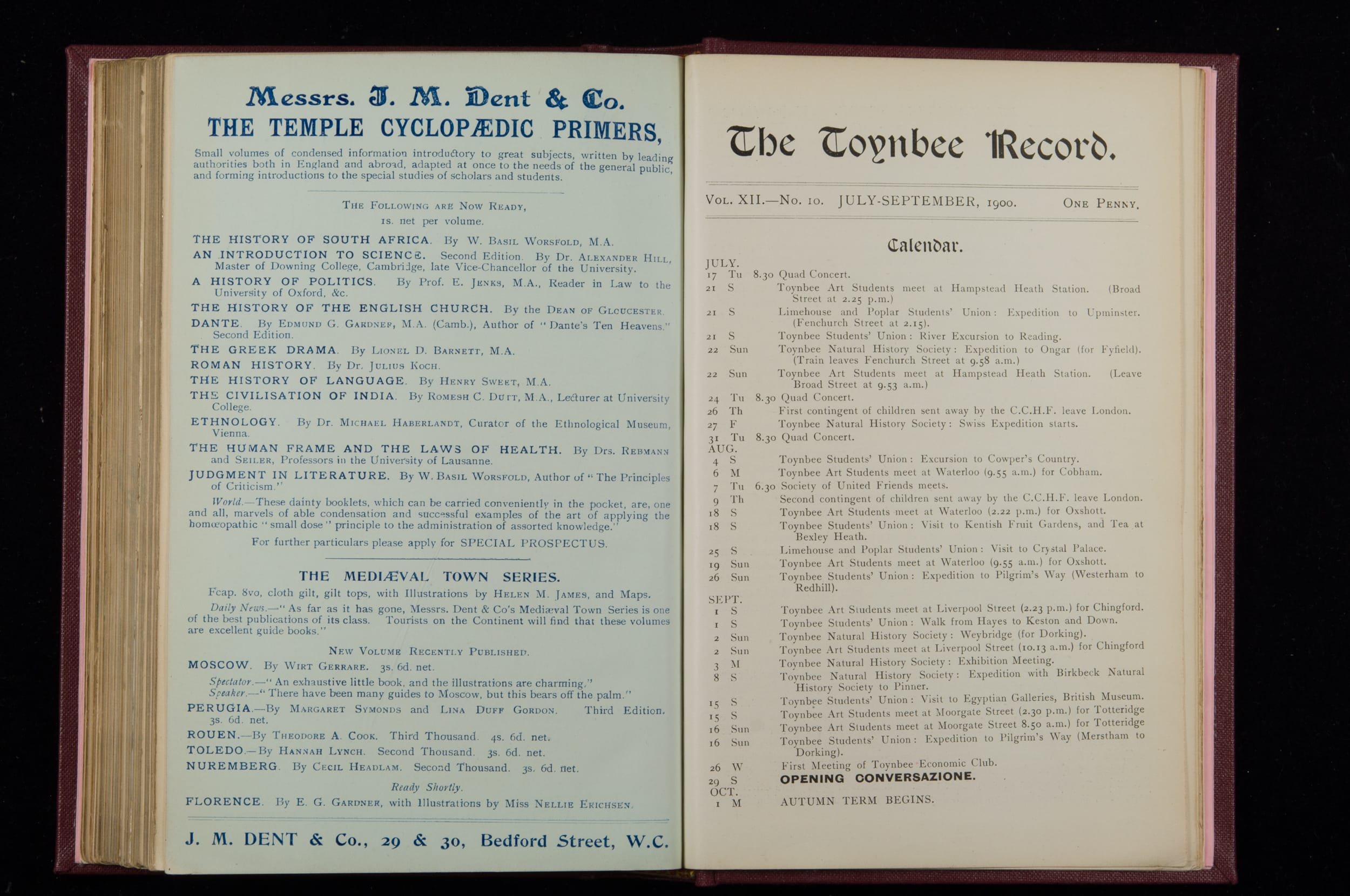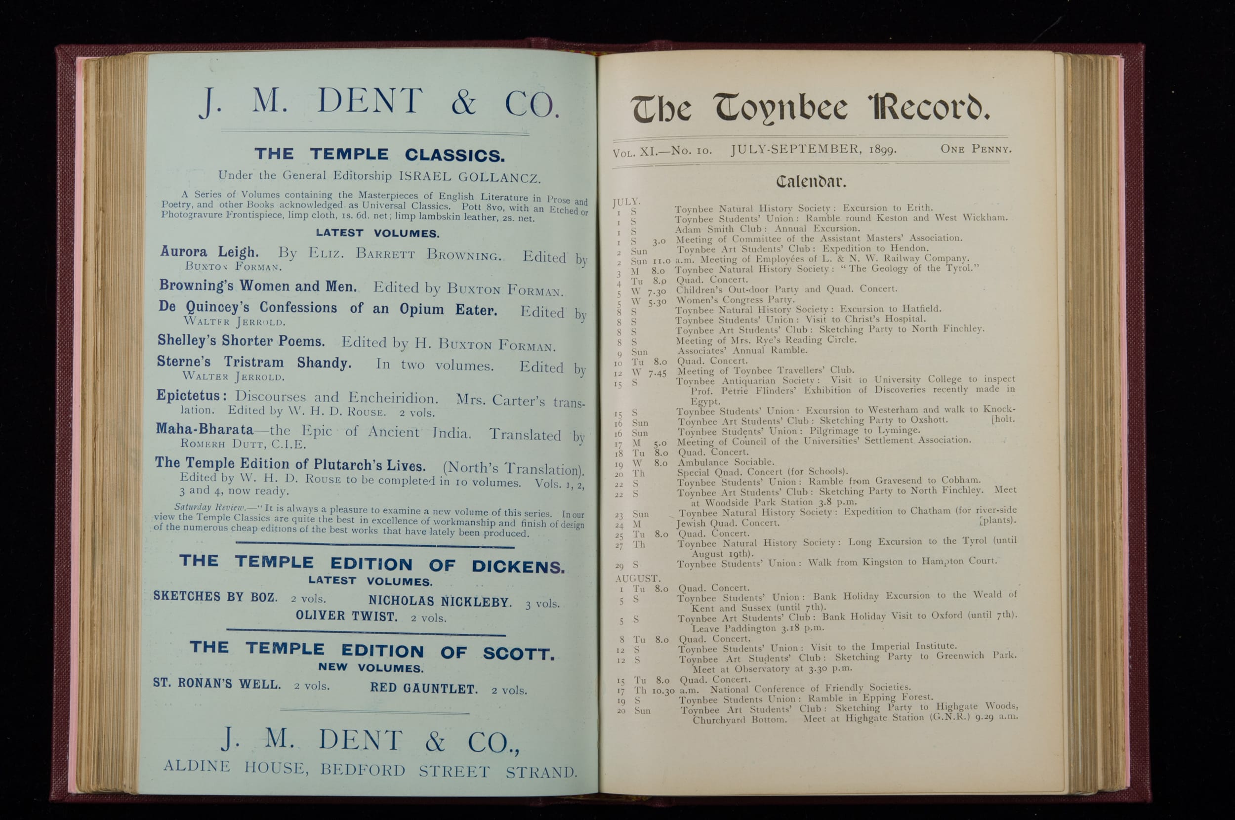 Contains monthly detailed reports of the activities at Toynbee Hall, the clubs and societies, conferences, eveniing events, articles and lists of classes and meetings. Includes photographs and lists of names, notes and forthcoming events. 1 volume