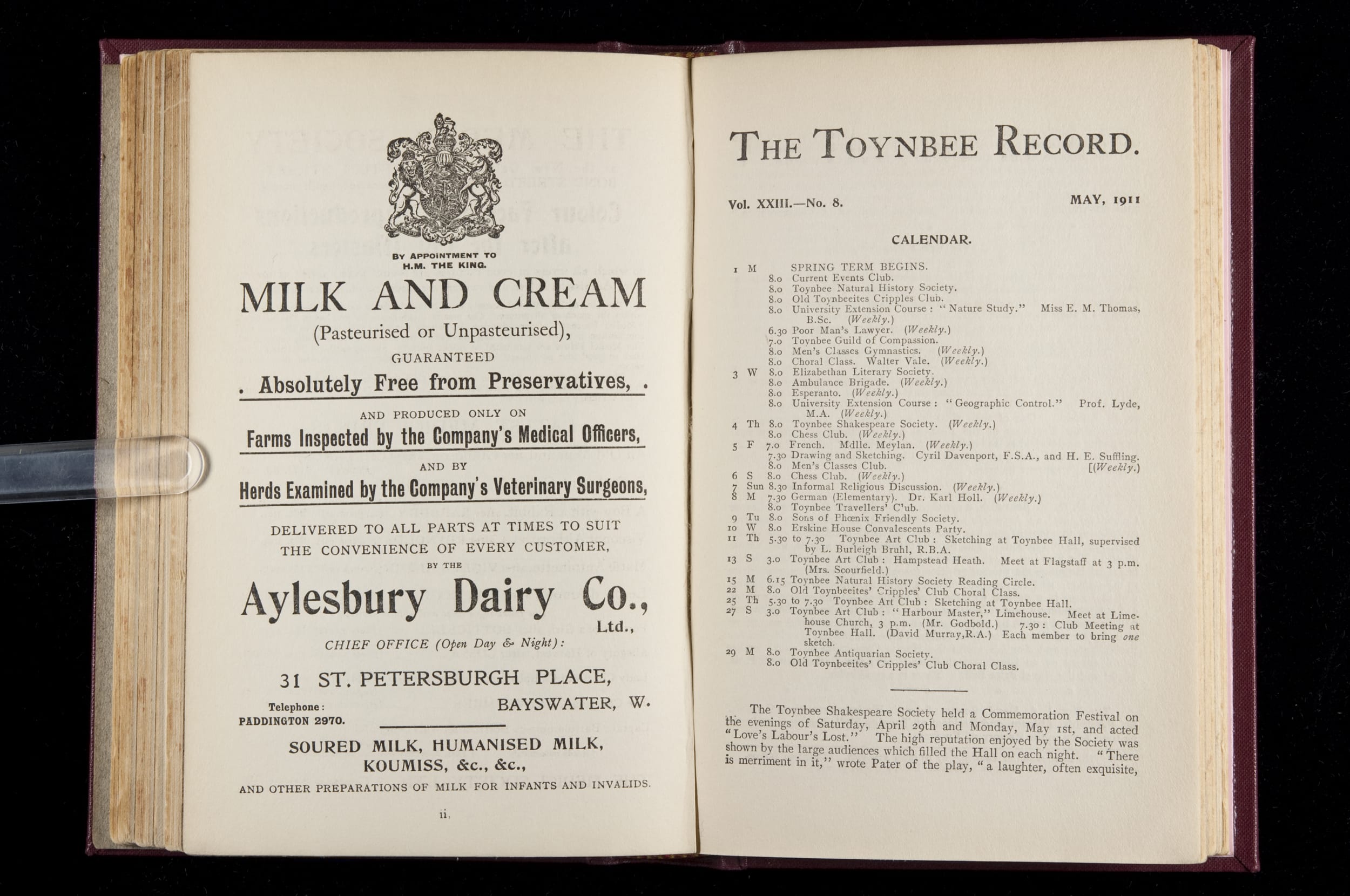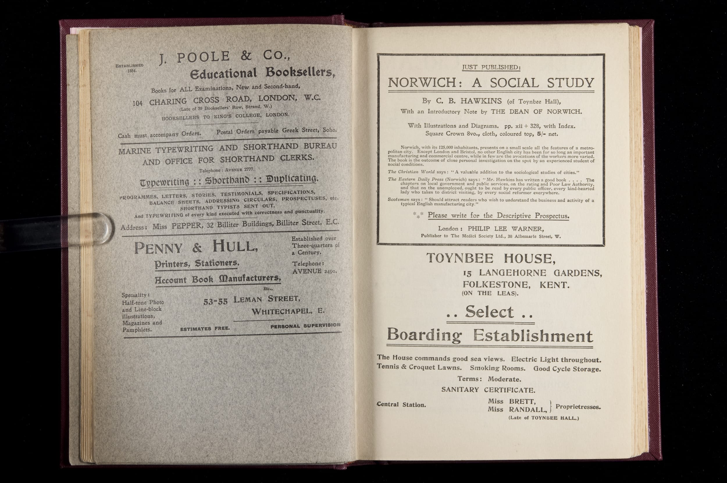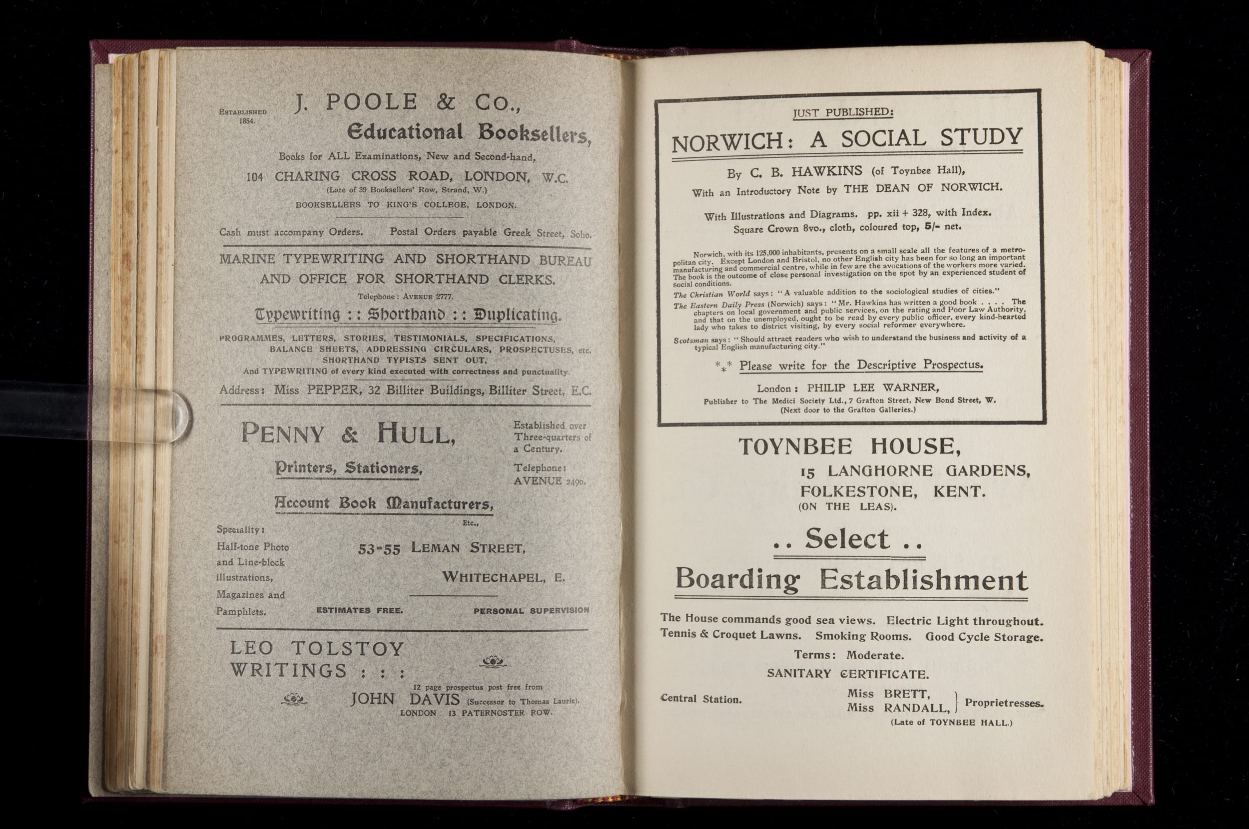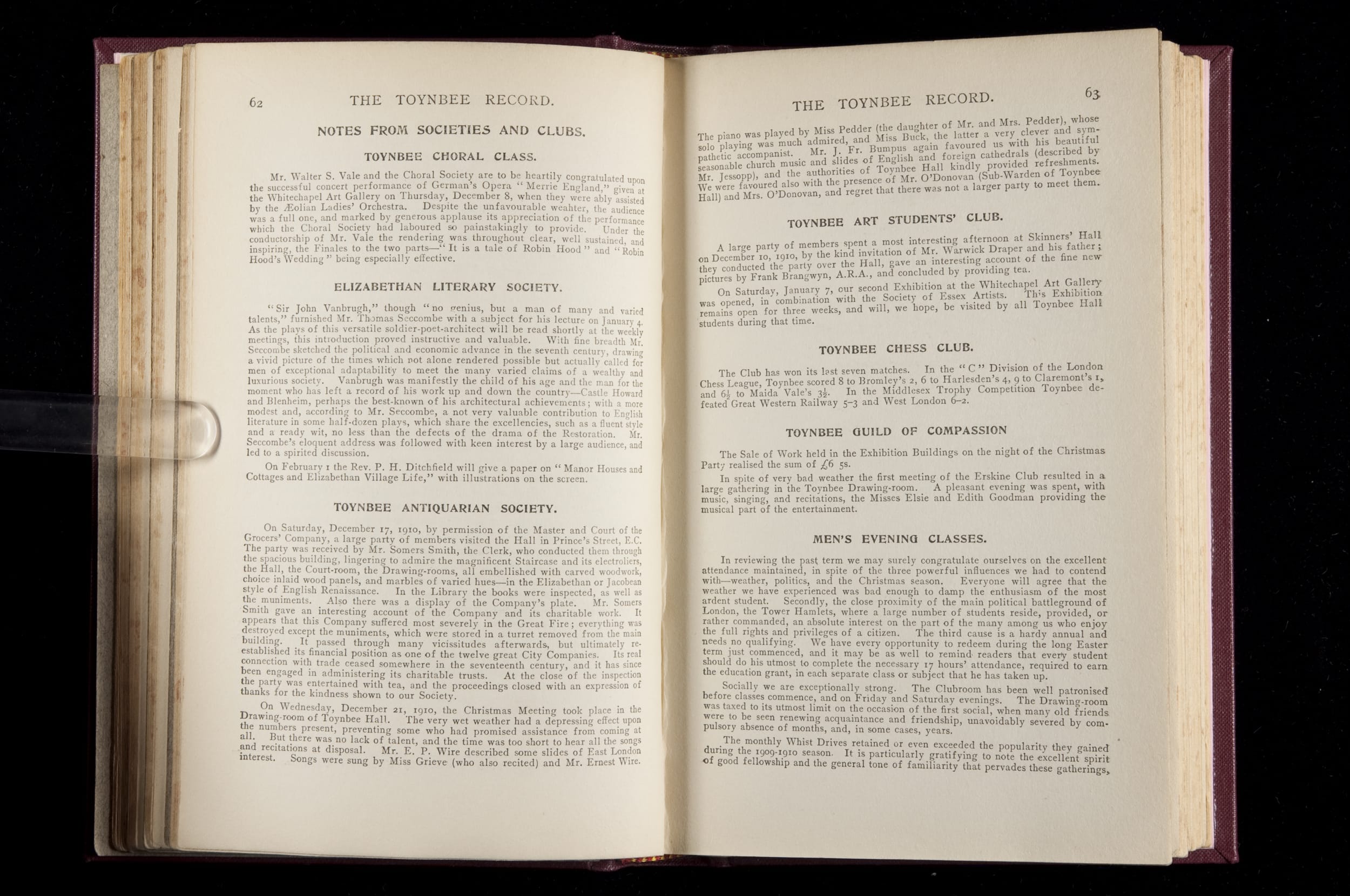 Contains detailed reports of activities and societies, clubs, reports and occasional notes. Includes an article on the Insurance for employees, the Post Office Messanger and the prevention of destitution. Also calenders of events and lists of lectures and classes and black and white photographs. 1 Volume